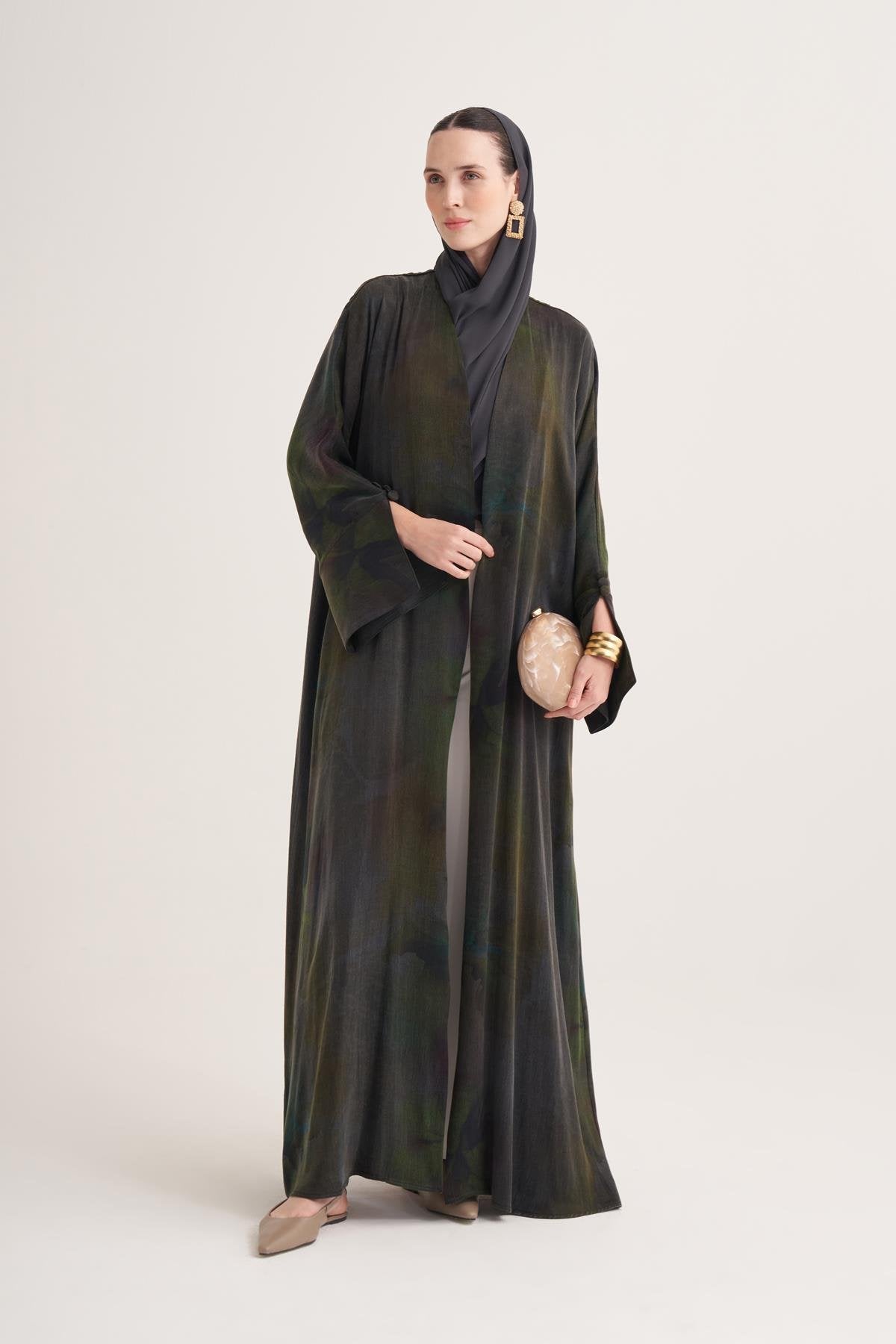 A refined open-front abaya crafted from softly draping cupro, creating an elegant, fluid movement with every step. The minimalist silhouette is enhanced by wide sleeves and a subtly textured tonal surface, offering understated depth and quiet luxury. Finished with a coordinated matching scarf, the design is intended for effortless layering across seasons and occasions.