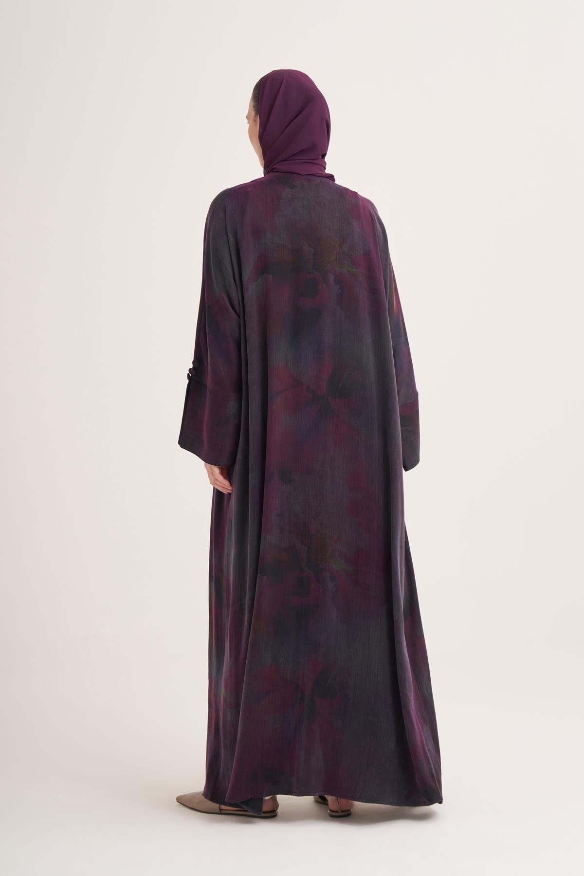 A refined open-front abaya crafted from softly draping cupro, creating an elegant, fluid movement with every step. The minimalist silhouette is enhanced by wide sleeves and a subtly textured tonal surface, offering understated depth and quiet luxury. Finished with a coordinated matching scarf, the design is intended for effortless layering across seasons and occasions.
