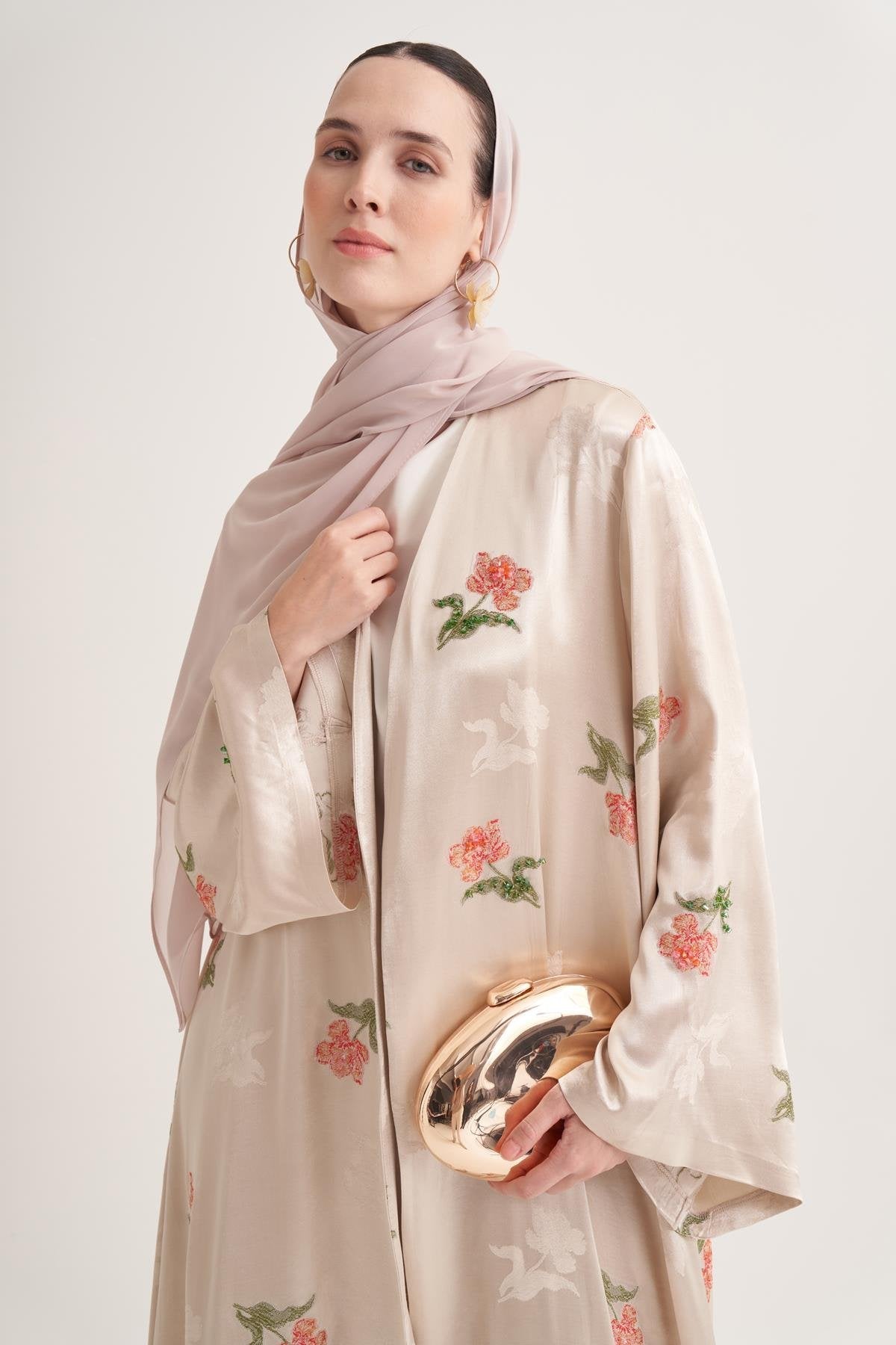 An ethereal flowing abaya crafted in a lightweight, softly lustrous fabric that moves with graceful fluidity. The design is elevated by delicate floral embroidery scattered across the silhouette, while the wide sleeves and open front create an elegant layered effect. Completed with a coordinated matching scarf, this piece embodies refined occasion dressing with effortless sophistication.