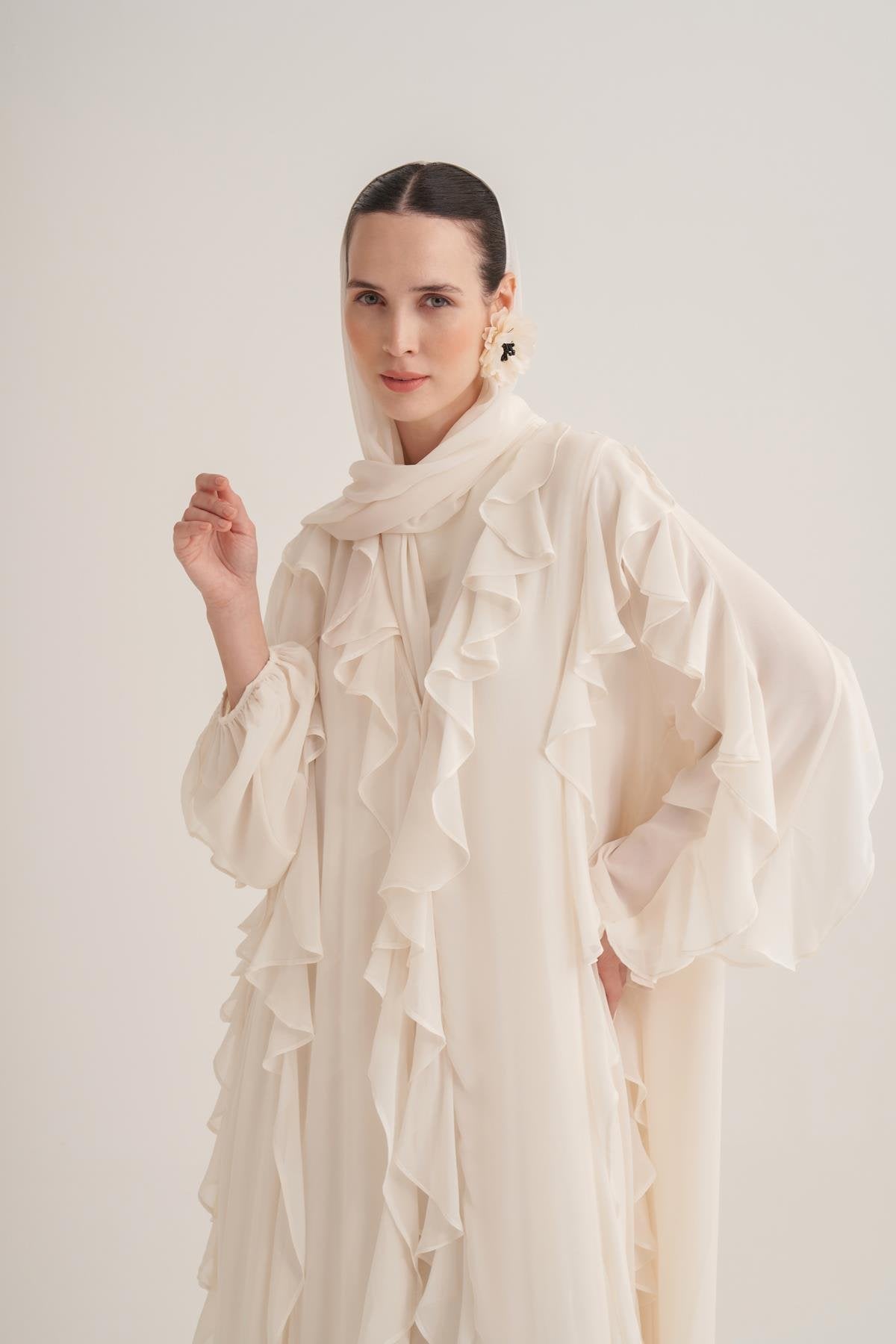 A statement evening abaya defined by cascading chiffon ruffles that flow vertically along the silhouette, creating soft movement and sculptural depth. The airy layered construction enhances the graceful full-length form, while the gently gathered sleeves and coordinating scarf complete the refined ceremonial aesthetic. Designed for elevated occasions, this piece combines dramatic texture with fluid elegance.