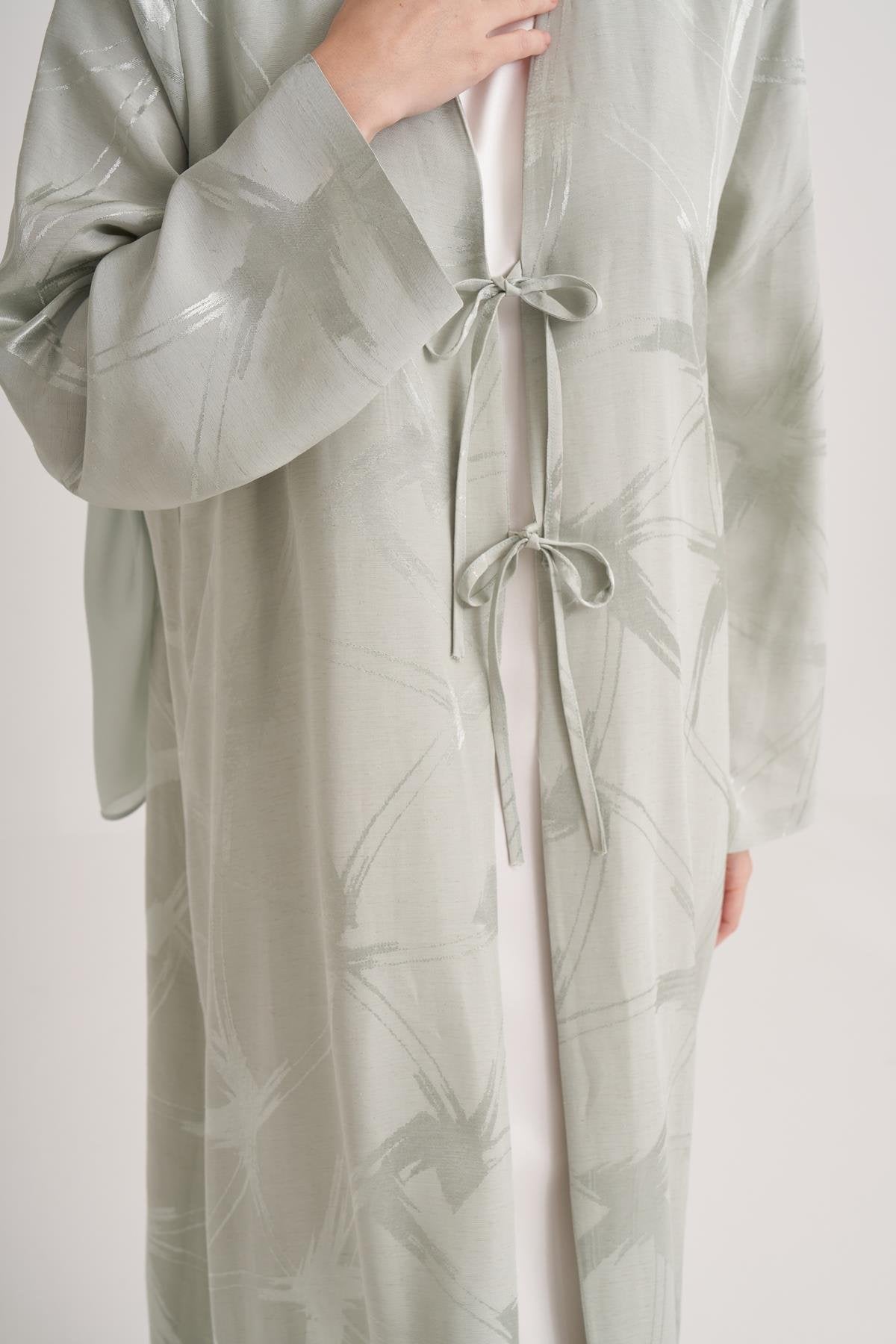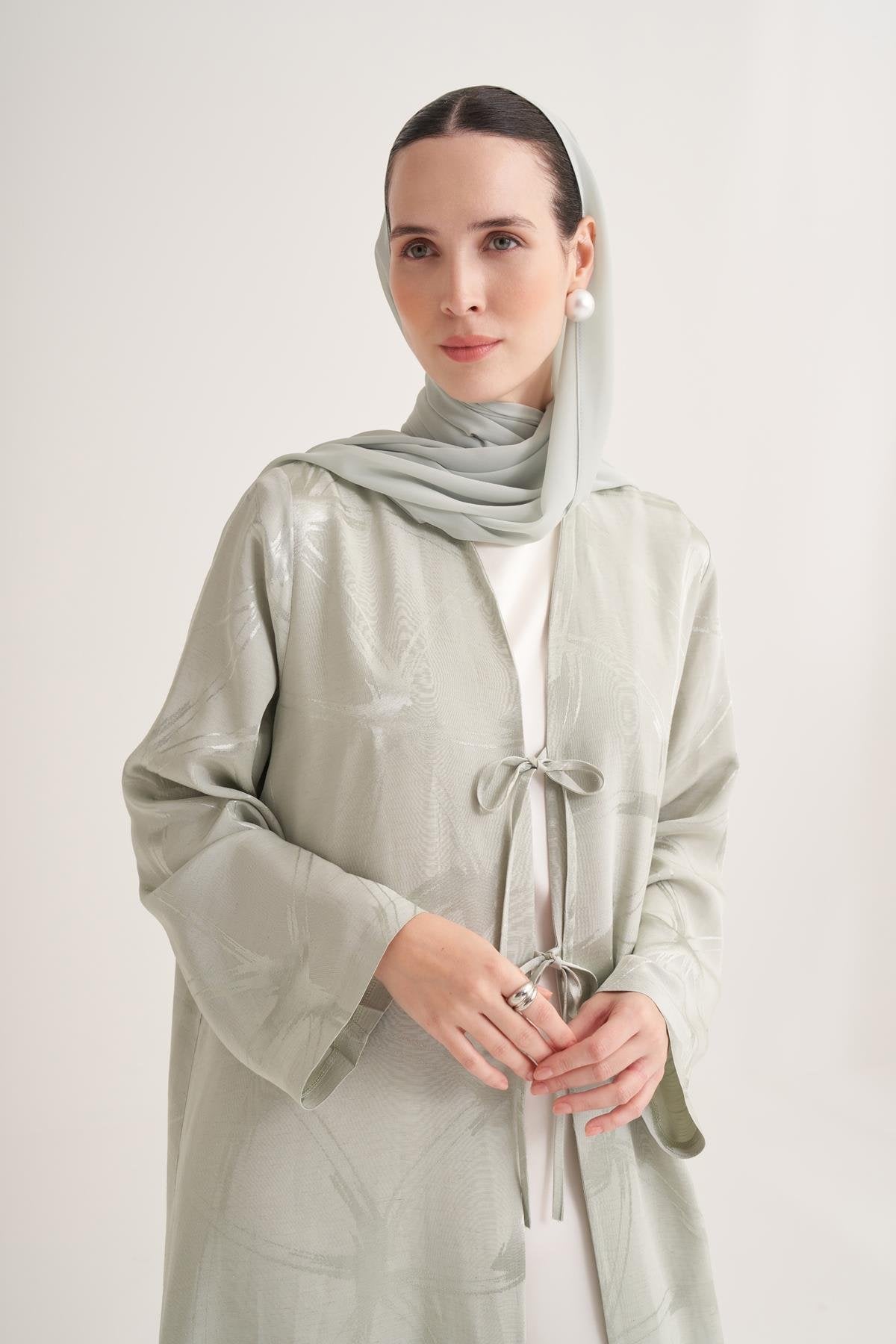 A refined open-front abaya crafted from a structured linen-blend fabric with a subtle woven texture that gives the silhouette quiet depth and natural elegance. The clean full-length cut is complemented by delicate front tie fastenings, allowing for adjustable styling while maintaining a minimalist, polished line. Finished with a coordinating lightweight scarf, this design offers understated sophistication suited for both daytime occasions and elevated everyday wear.