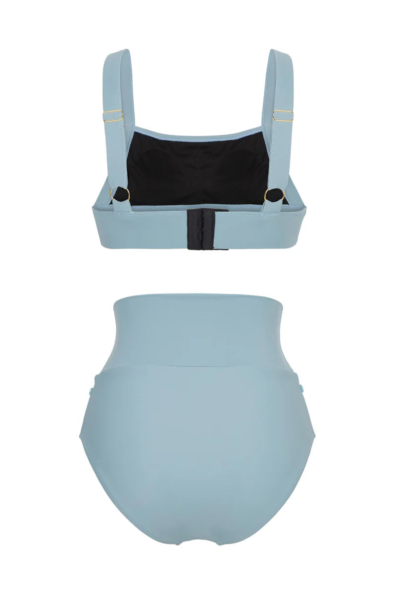 Design: Two-piece swimsuit with a supportive bikini top and full-coverage high-waist bottom