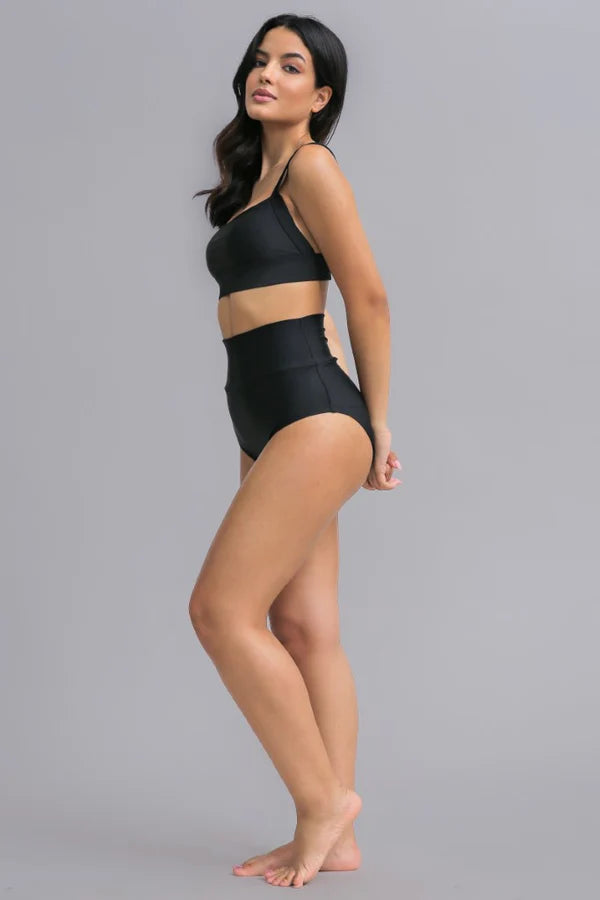Design: Two-piece swimsuit with a supportive bikini top and full-coverage high-waist bottom