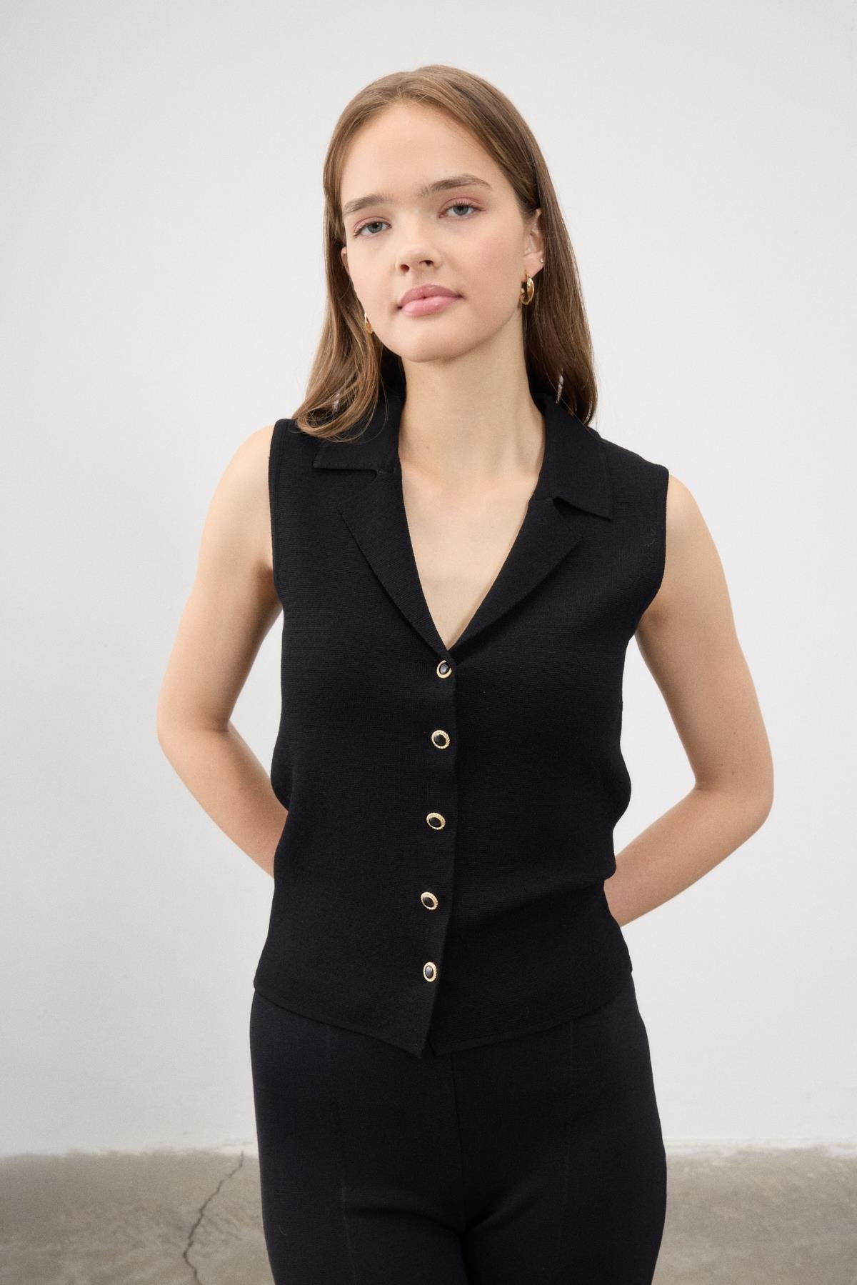 Designed for autumn–winter wear, the Lorisse vest delivers a sharp balance of modern tailoring and knit comfort. Crafted from structured knit fabric, this sleeveless piece features a clean V-neckline with a subtle lapel-inspired finish, creating a polished yet versatile silhouette. The button-front design allows for effortless layering over shirts, blouses, or fine knits, making it suitable for both refined workwear and elevated everyday styling. Minimalist and timeless, Lorisse functions as a strong wardrobe staple across seasons.