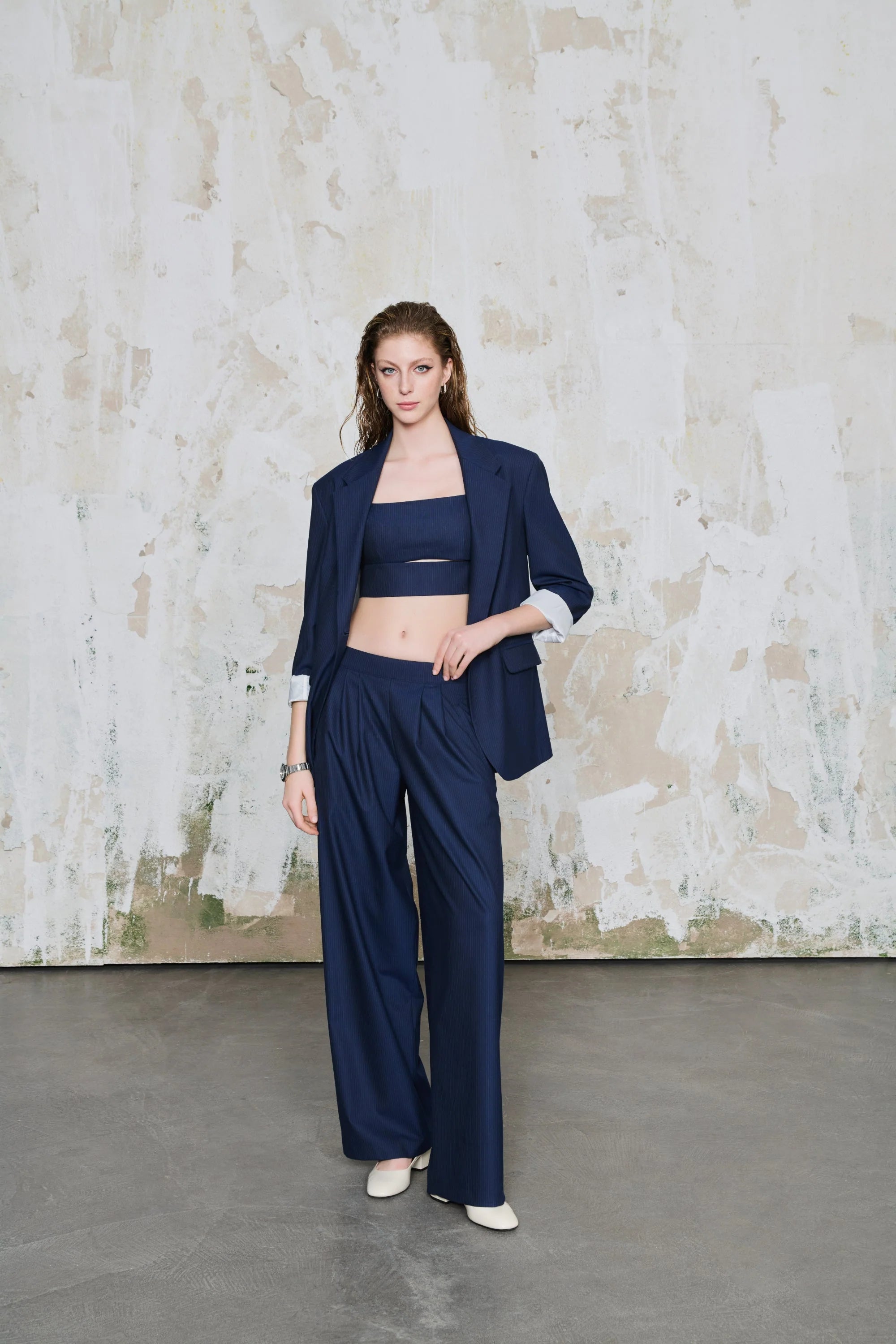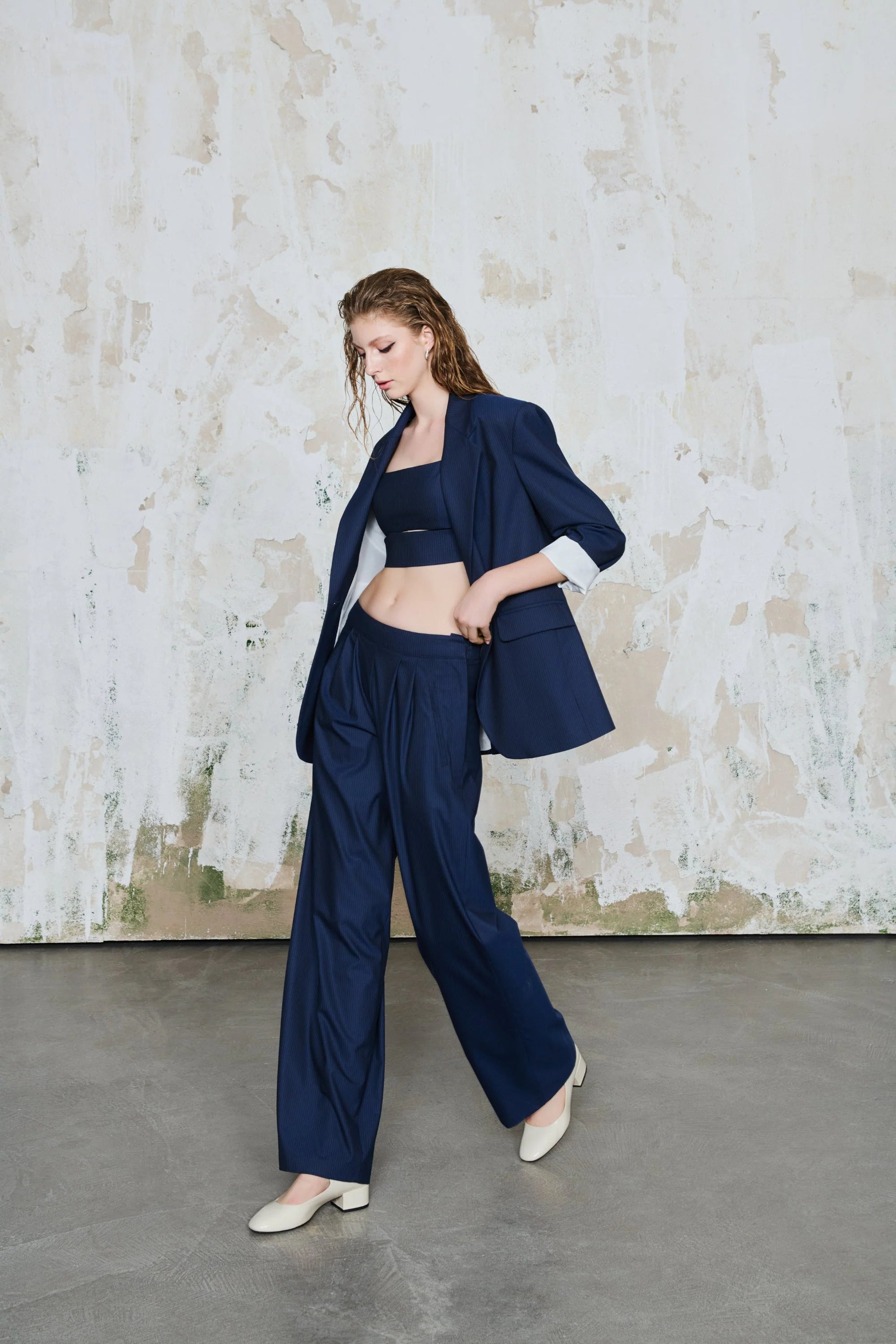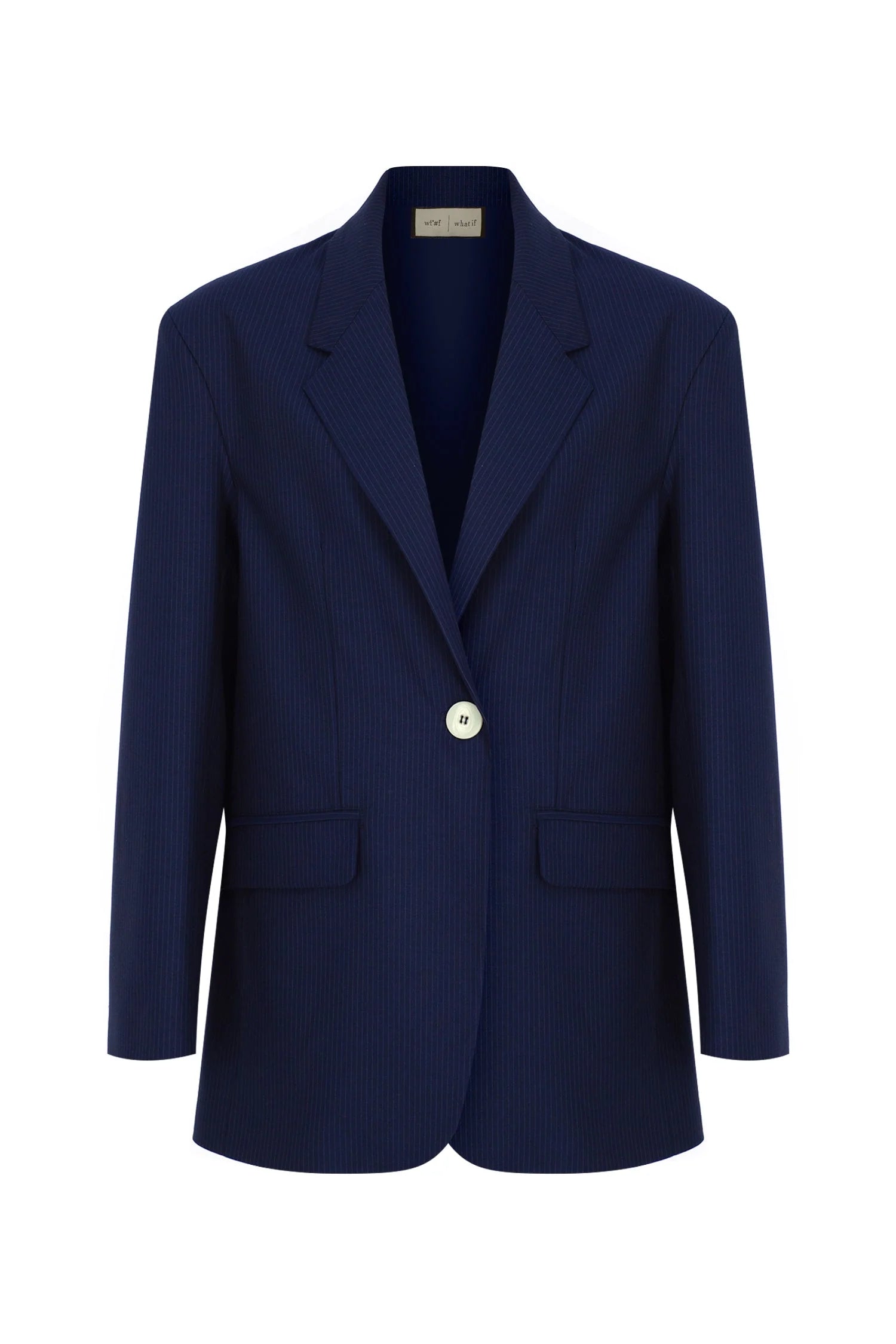 The Madeleine blazer blends oversized tailoring with timeless elegance. Cut in navy with fine white pinstripes, it features a relaxed silhouette, contrast lining, and a single-button closure. Versatile and contemporary, it transitions seamlessly from office to off-duty chic.