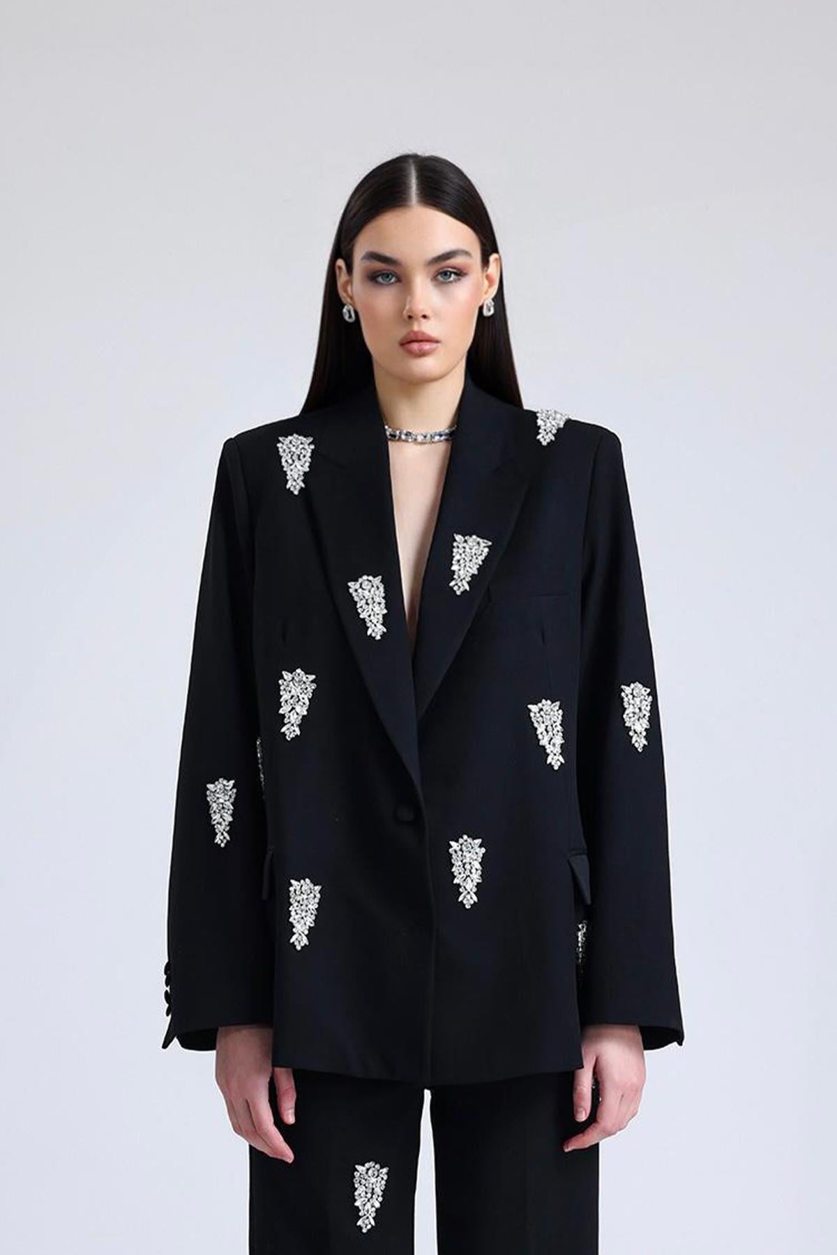 A refined jacket defined by its clean silhouette and delicate stone embellishments. Crafted from a smooth crepe-textured fabric, it offers a polished finish with a comfortable feel. The subtle detailing adds a touch of understated brilliance, while the deep black tone reinforces its timeless sophistication. Designed for versatility, it complements both tailored and relaxed looks with ease.
