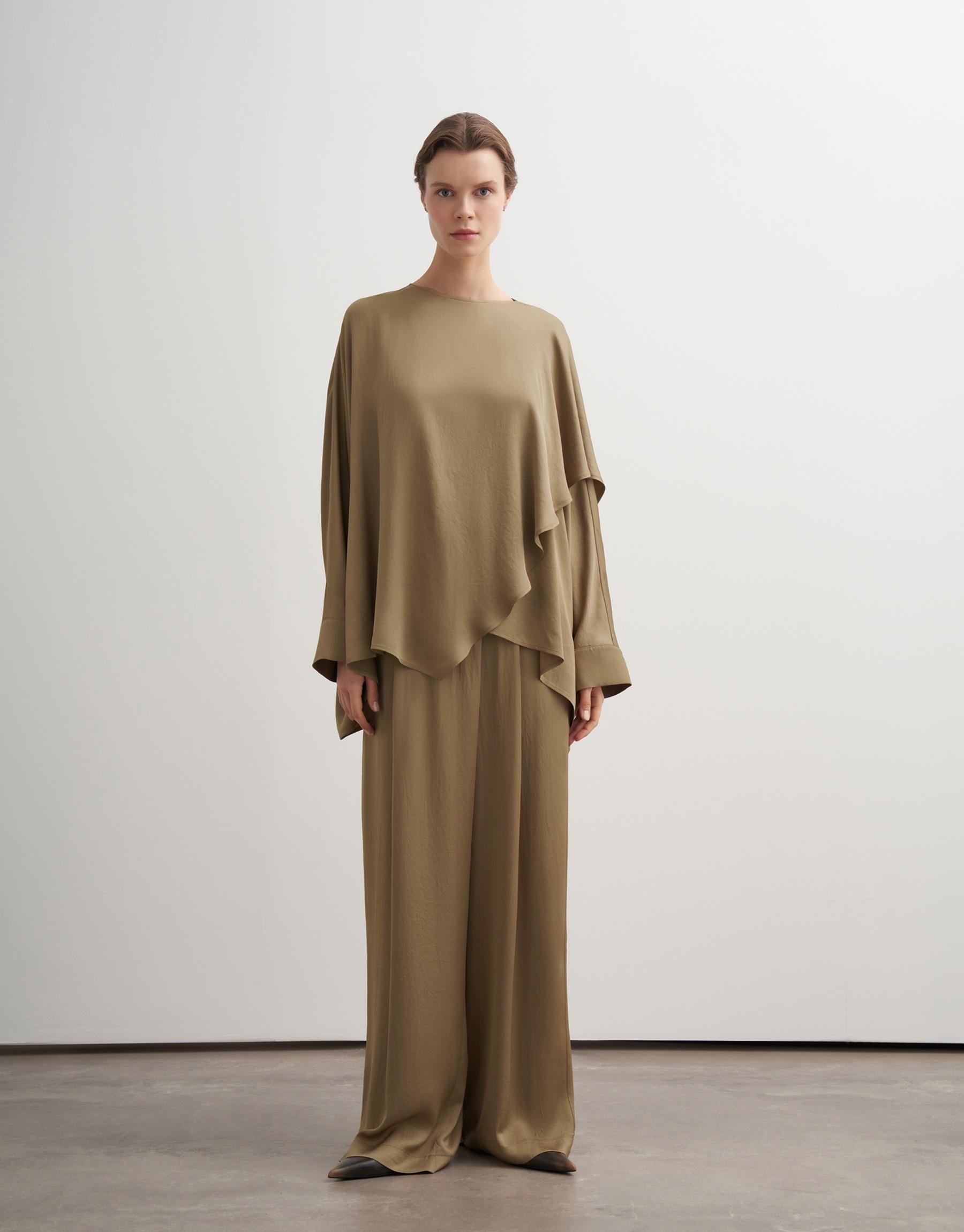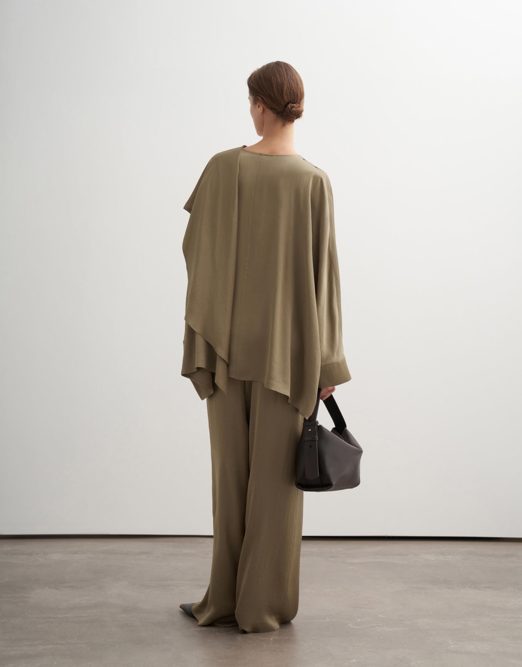 An elegant expression of fluid tailoring, this blouse is designed with a soft draped silhouette that moves effortlessly with the body. The shawl collar detail adds a refined, architectural touch, while the asymmetrical layering enhances depth and dimension. Its oversized structure offers both comfort and a sophisticated presence, making it a versatile piece for elevated everyday wear or understated evening styling.
