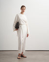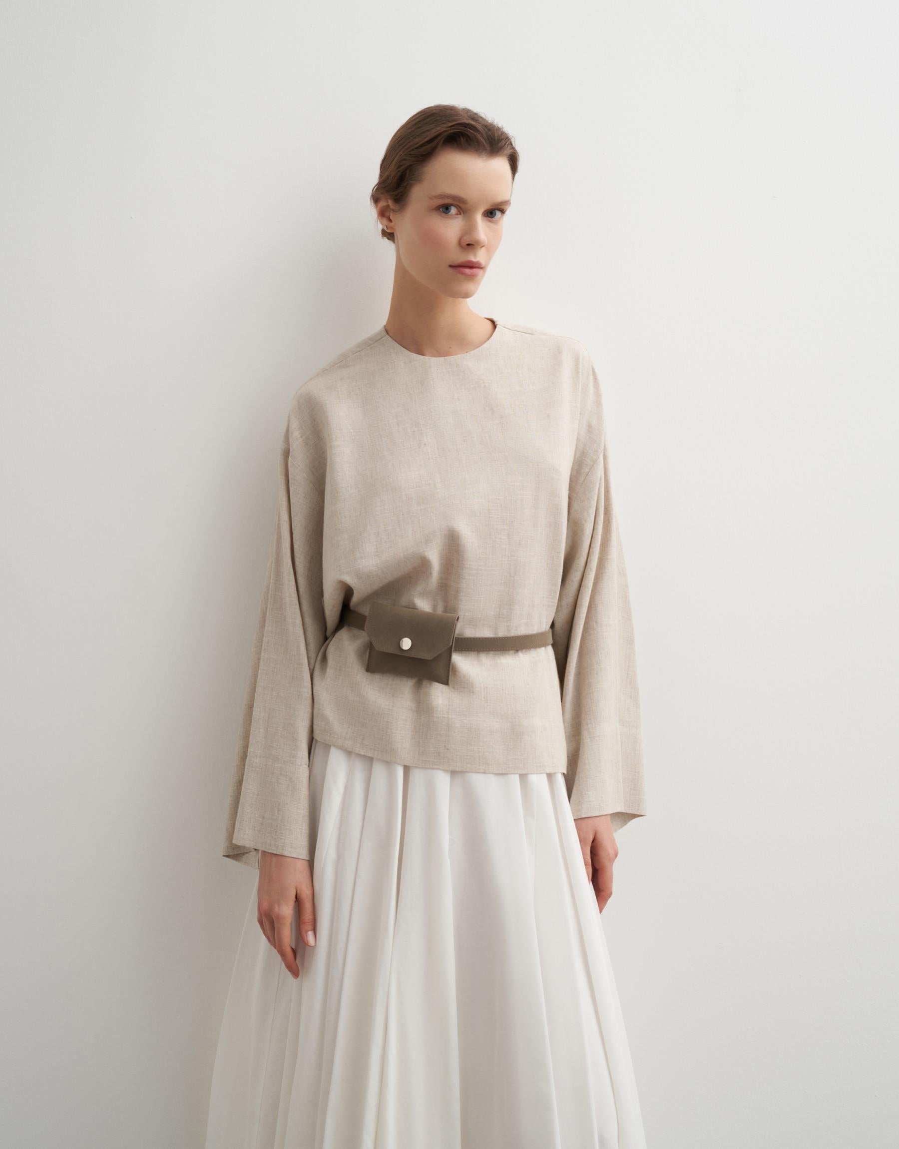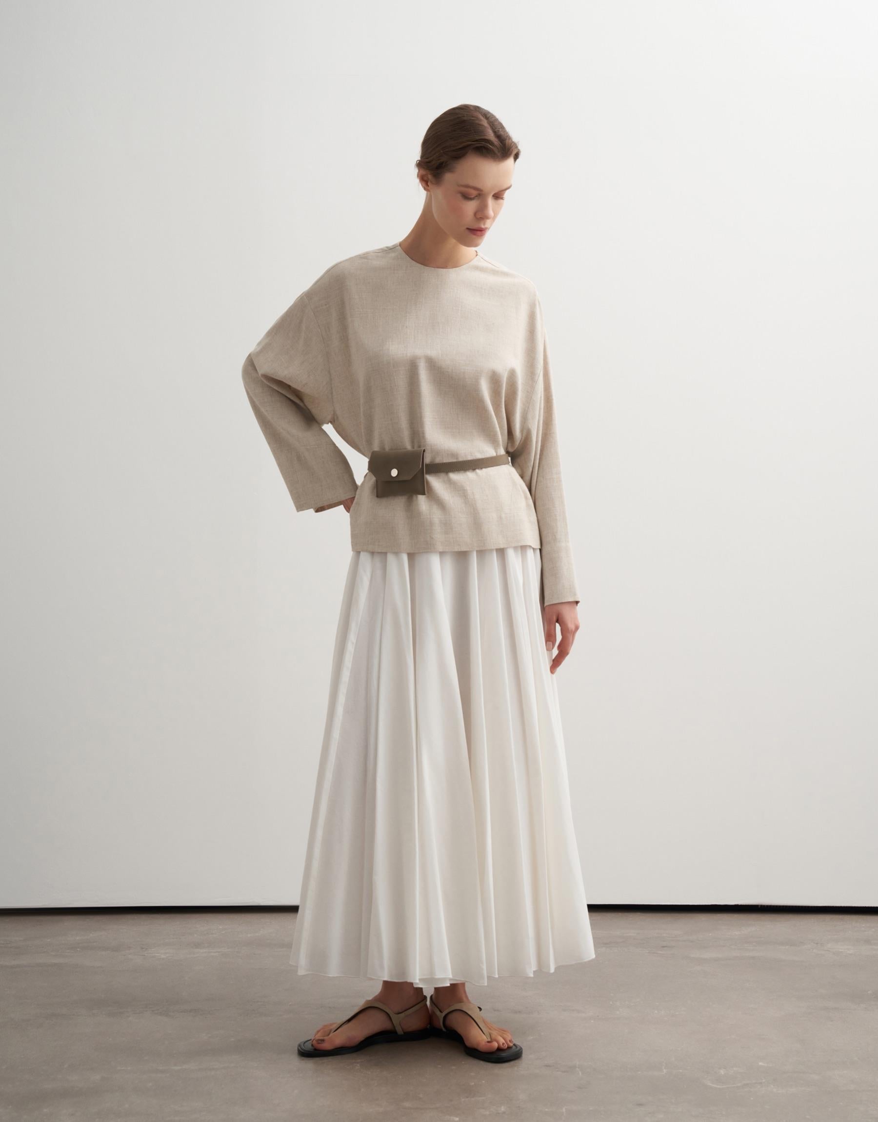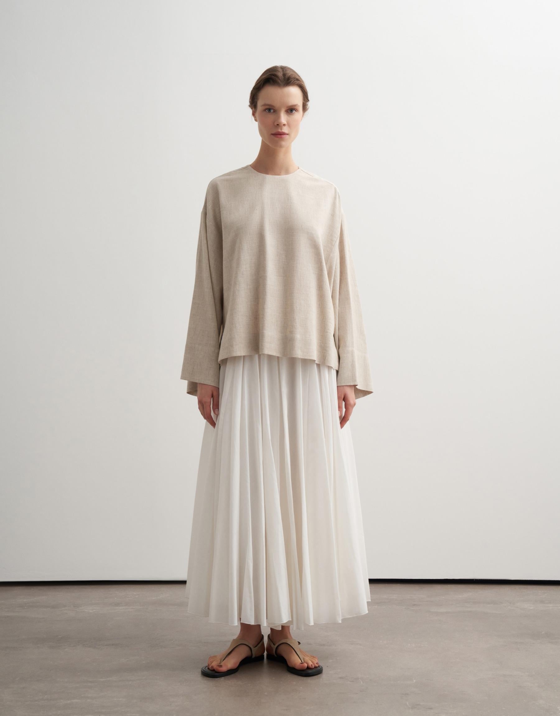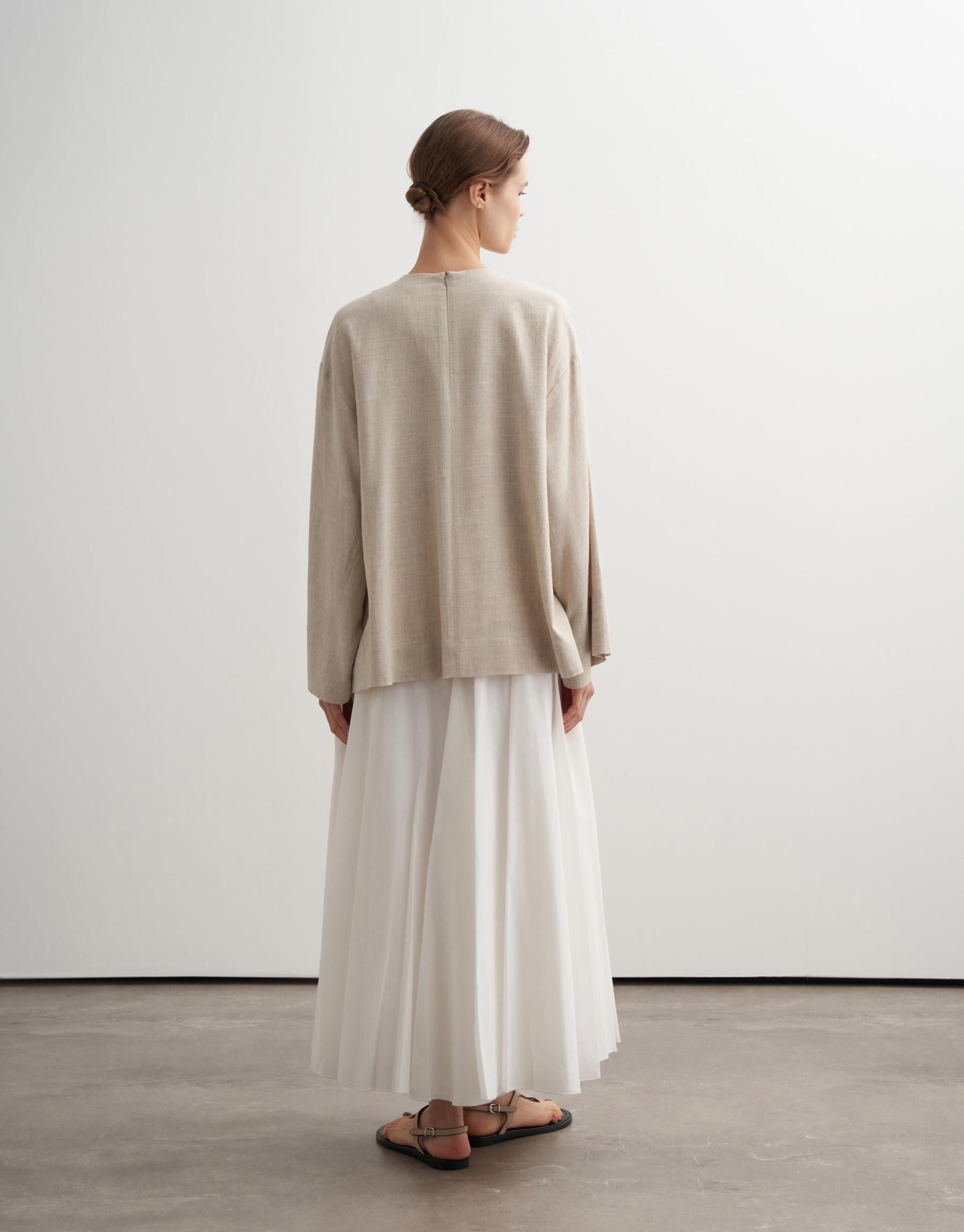 This minimalist blouse is crafted from a breathable linen blend, offering a soft structure with a naturally textured finish. Designed with a clean round neckline and an oversized silhouette, it features a discreet back zip closure that maintains a refined, uninterrupted front. The relaxed cut and wide sleeves create an effortless, modern drape.