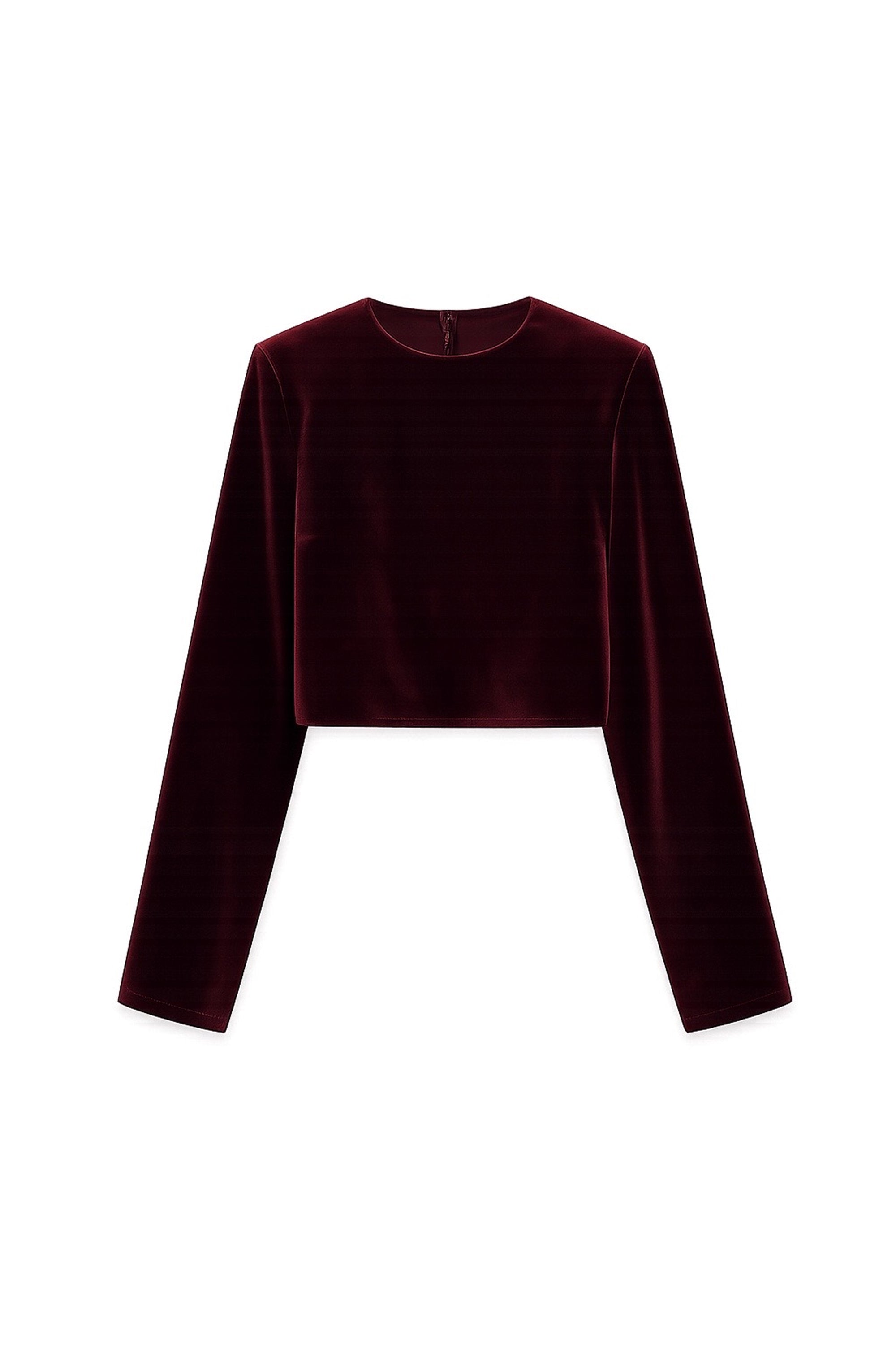 This cropped velvet blouse is defined by its clean geometry and refined structure. Designed with padded shoulders and long straight sleeves, it features a smooth, lined interior and a concealed back zip for a seamless finish. The minimalist silhouette highlights the richness of the fabric while maintaining a sharp, modern profile.