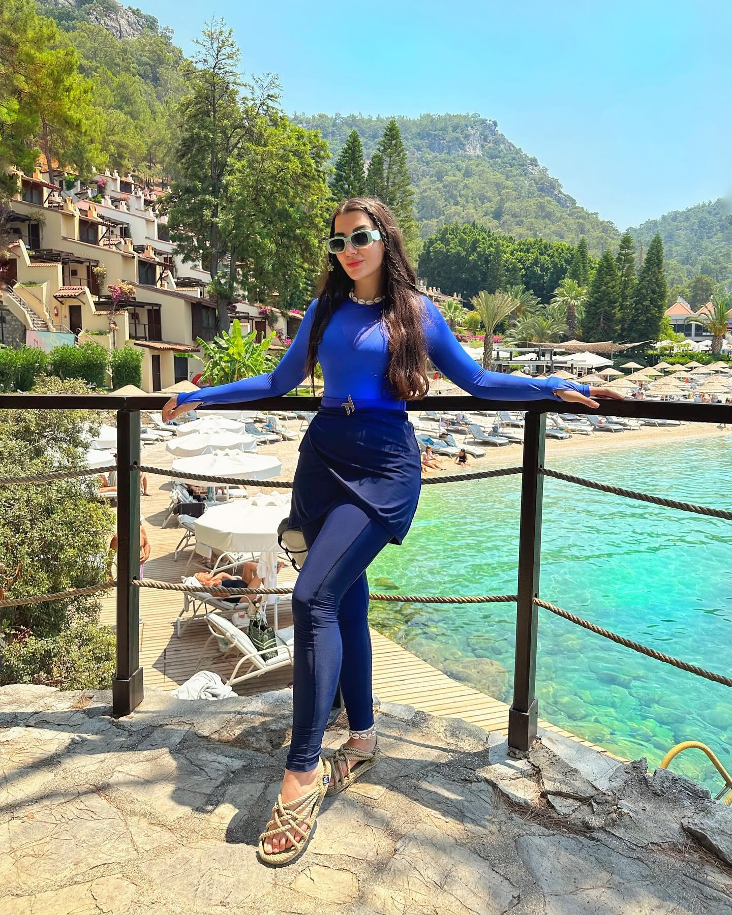Step into elegance and comfort with the Maraya Blue Set from Turana Atash, a perfect combination of modesty and sophistication. Featuring a covered blue swim top with a logo-adorned belt, this set offers a flattering and stylish fit. Paired with comfortable leggings and a chic mini skirt, this versatile ensemble is ideal for women who value modest fashion and luxury swimwear. The Maraya Blue Set ensures you look and feel your best, whether at the pool or the beach.