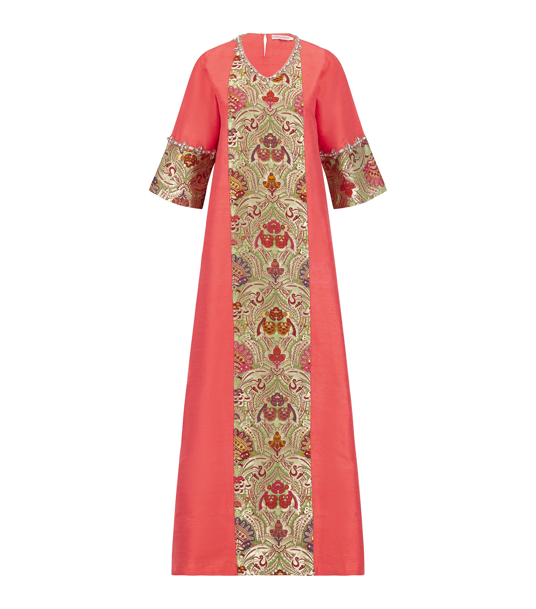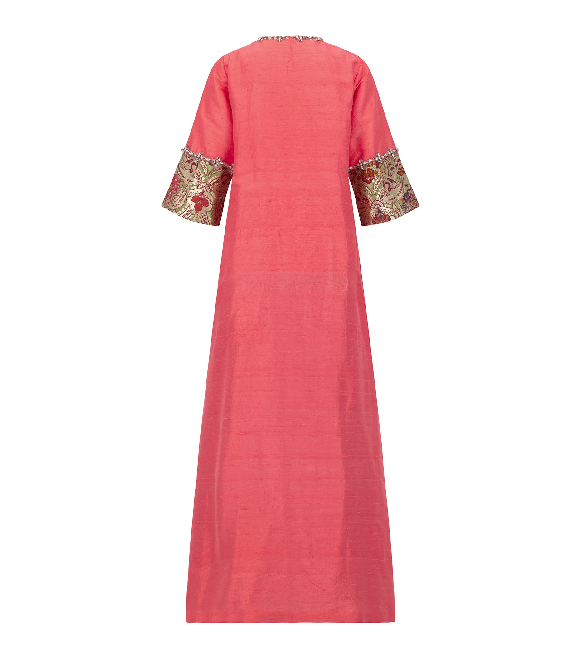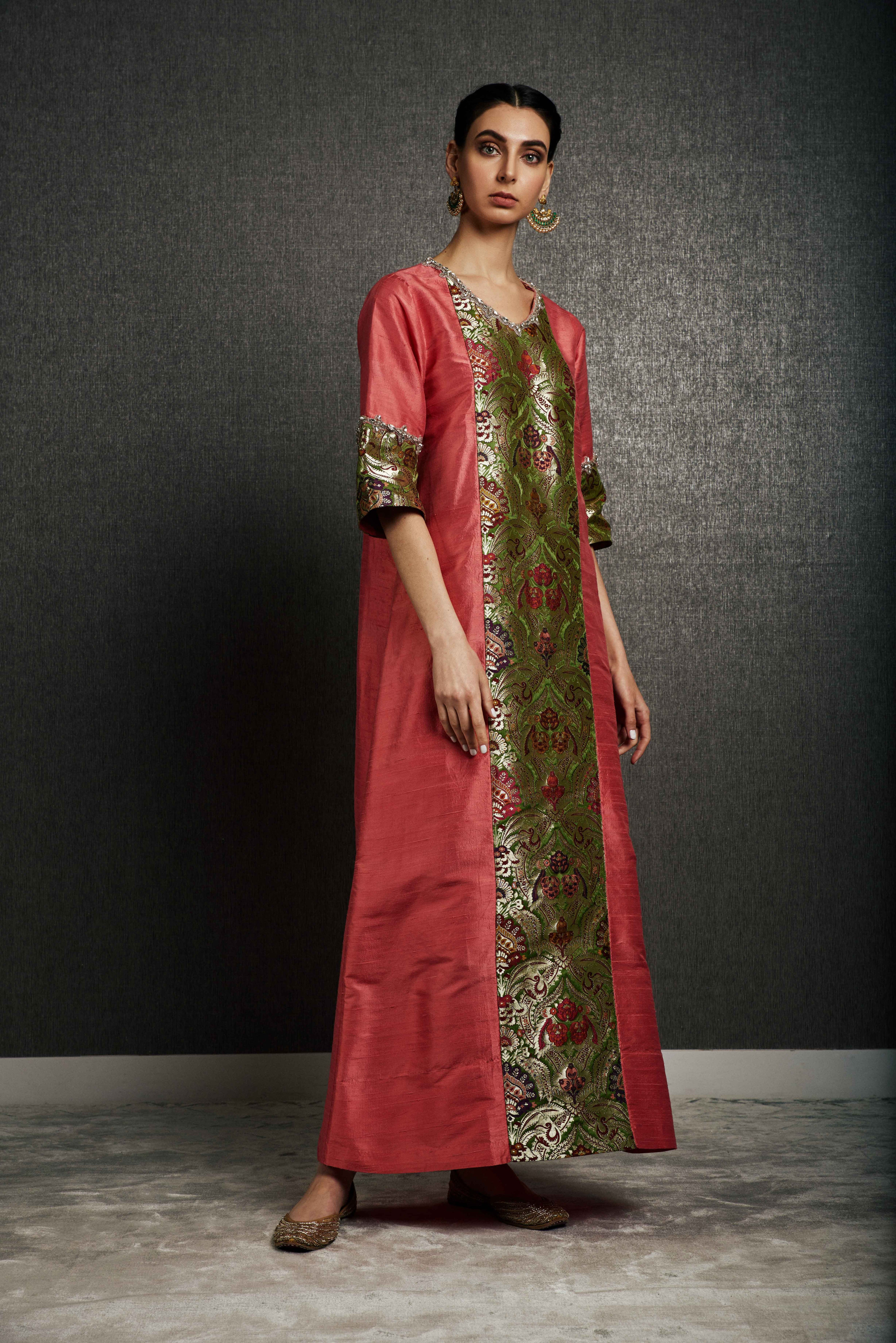 The Rawan Maharani Kaftan is a regal celebration of heritage craftsmanship and timeless design. Rendered in a vibrant watermelon pink, this couture kaftan is meticulously crafted from pure handloom silk, woven over a six-week period by a master artisan. The front and sleeves are adorned with elaborate brocade panels, featuring intricate motifs in rich jewel tones — carefully sourced across India by the designer and hand-applied with precision.