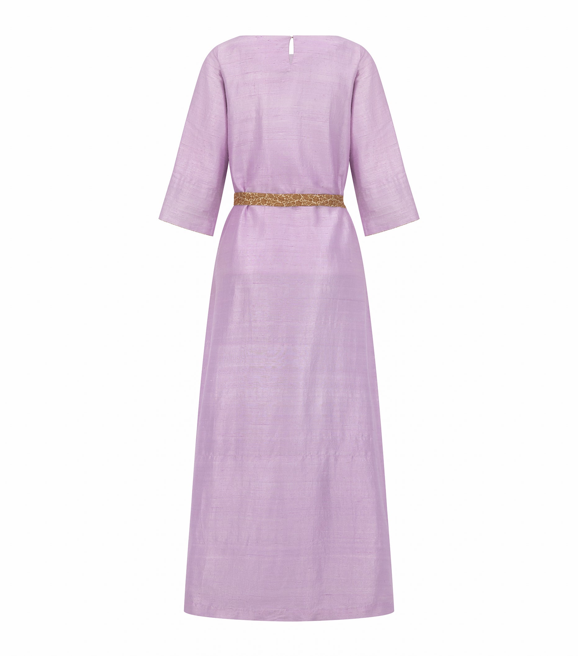 The Mays Maharani Kaftan in lilac is a couture masterpiece from Cabochon, blending the richness of Indian textile tradition with elevated contemporary modest fashion. Made from 100% natural handloom silk, this luxurious kaftan takes over six weeks to create, woven by a single skilled artisan on a traditional loom. Each stitch reflects heritage craftsmanship and personal artistry, sourced from handpicked materials over extensive travels through India.