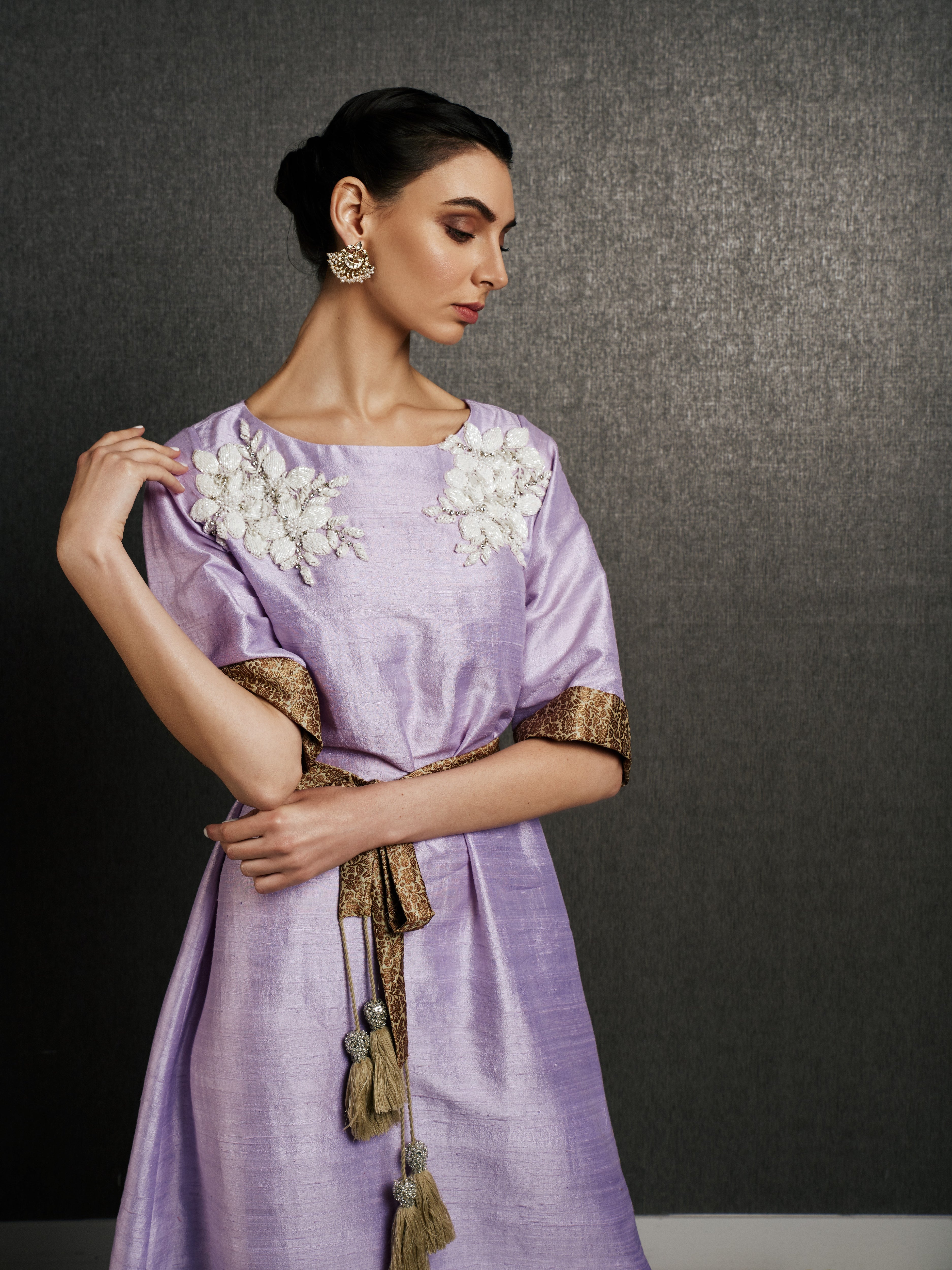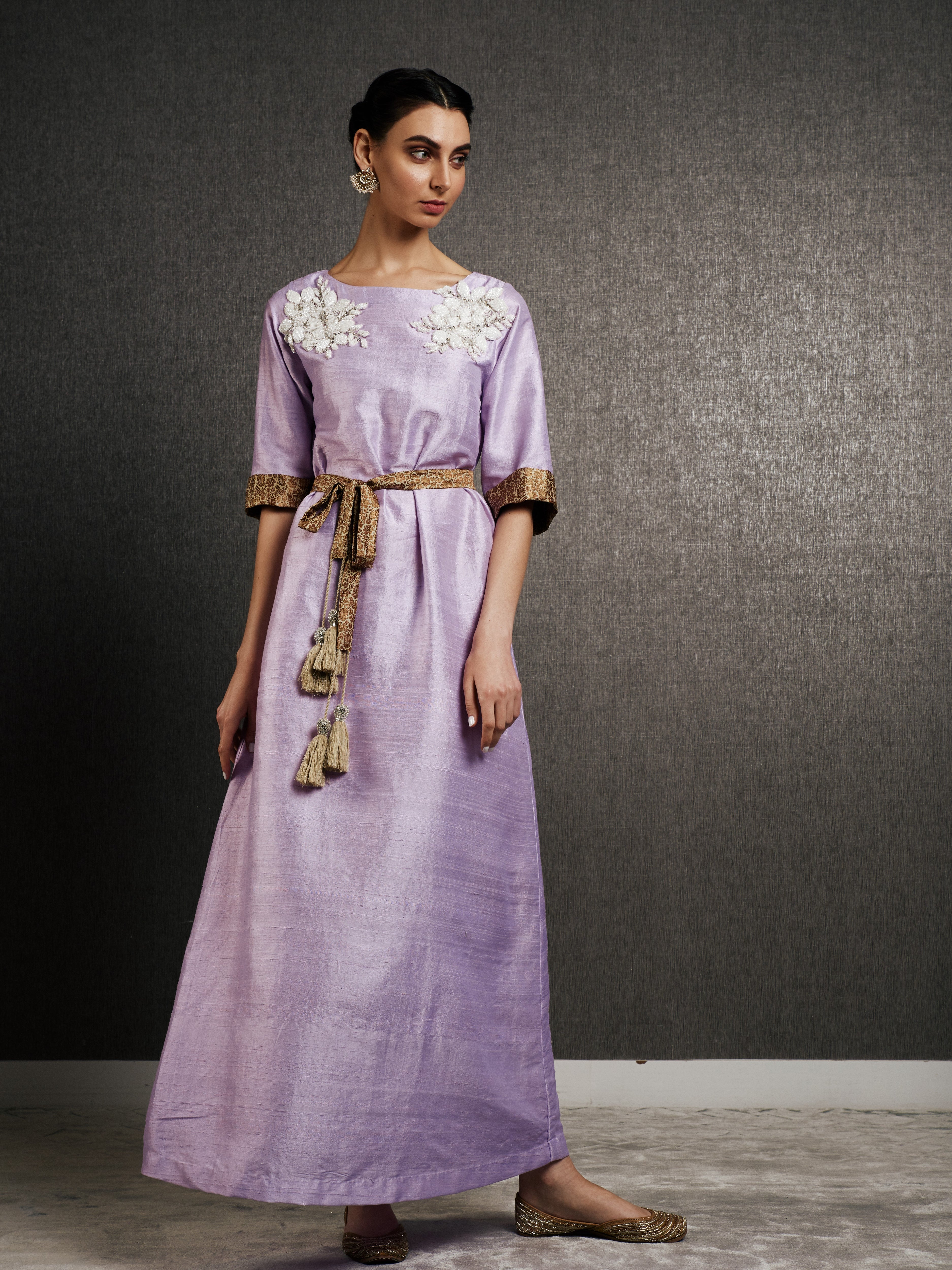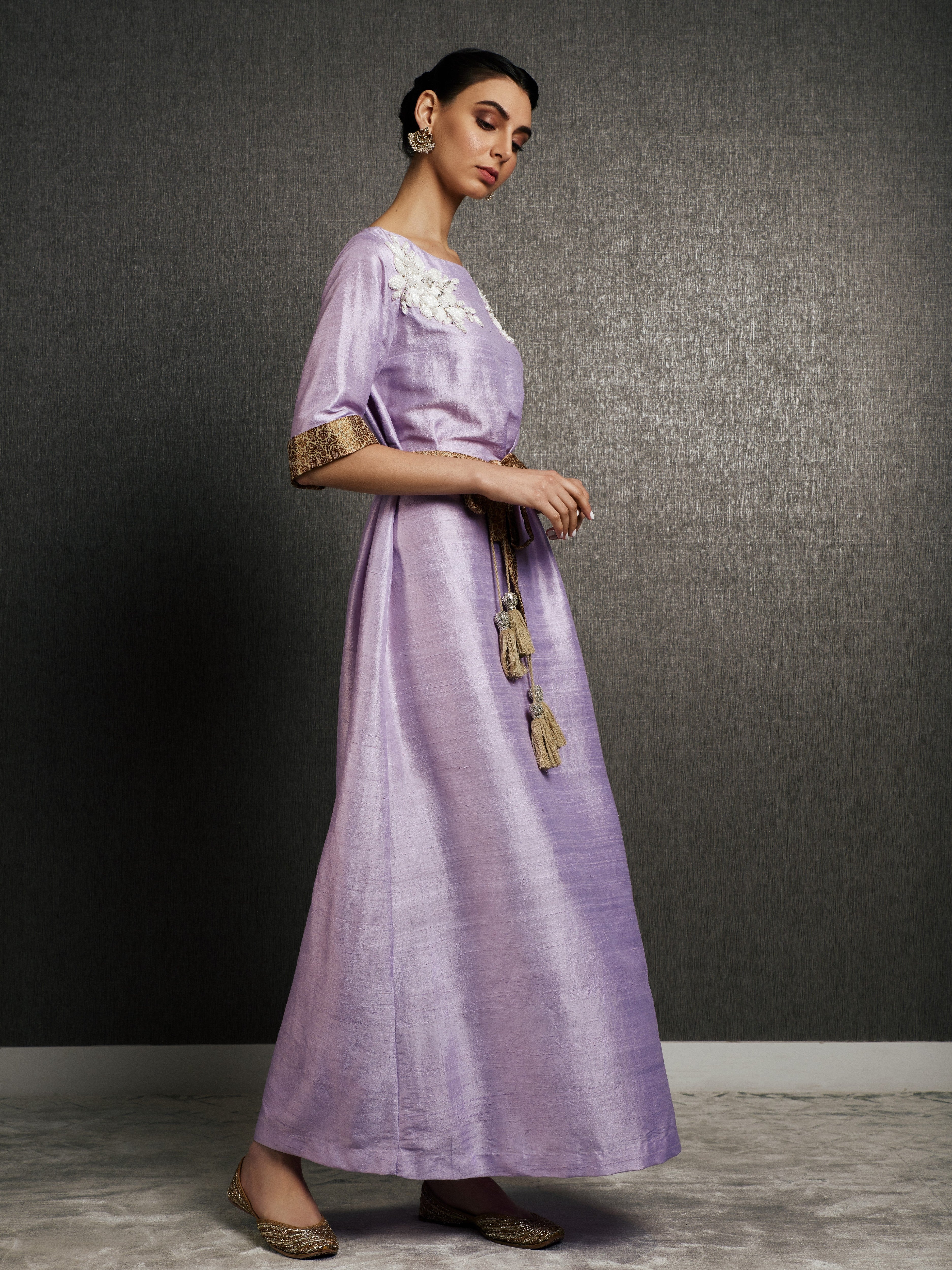 The soft lilac hue exudes grace, while delicate handmade embroidery on the shoulders adds a regal touch. The kaftan is finished with a golden brocade trim on the sleeves and a tasseled silk belt to cinch the waist, offering a flattering yet modest silhouette. This limited-edition piece is available in lilac and olive, making it ideal for weddings, Eid celebrations, or any occasion where you want to express elegance with authenticity. Includes tasseled belt for optional waist definition