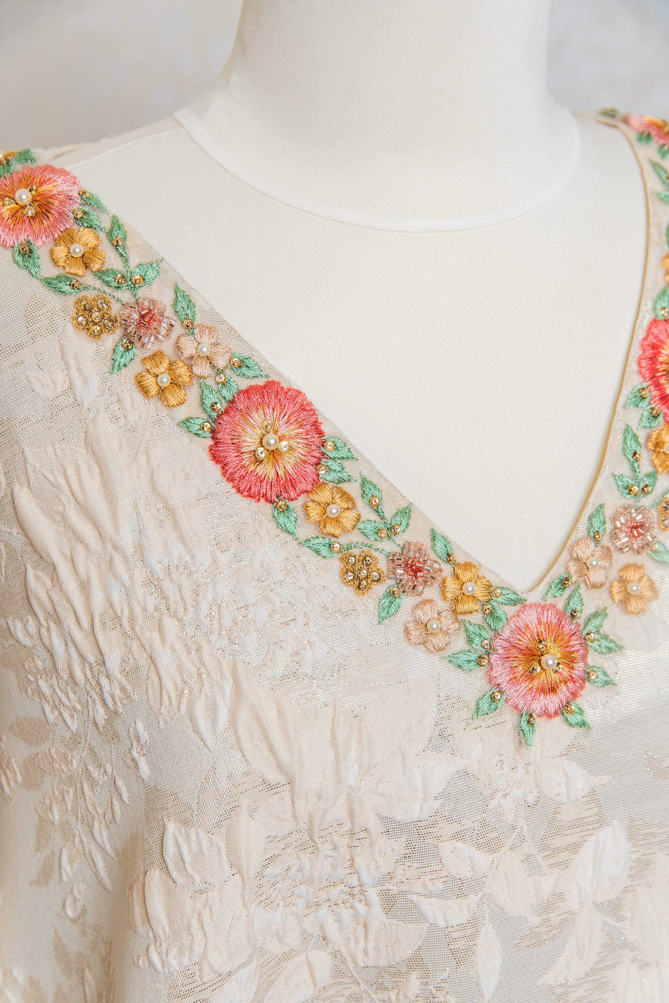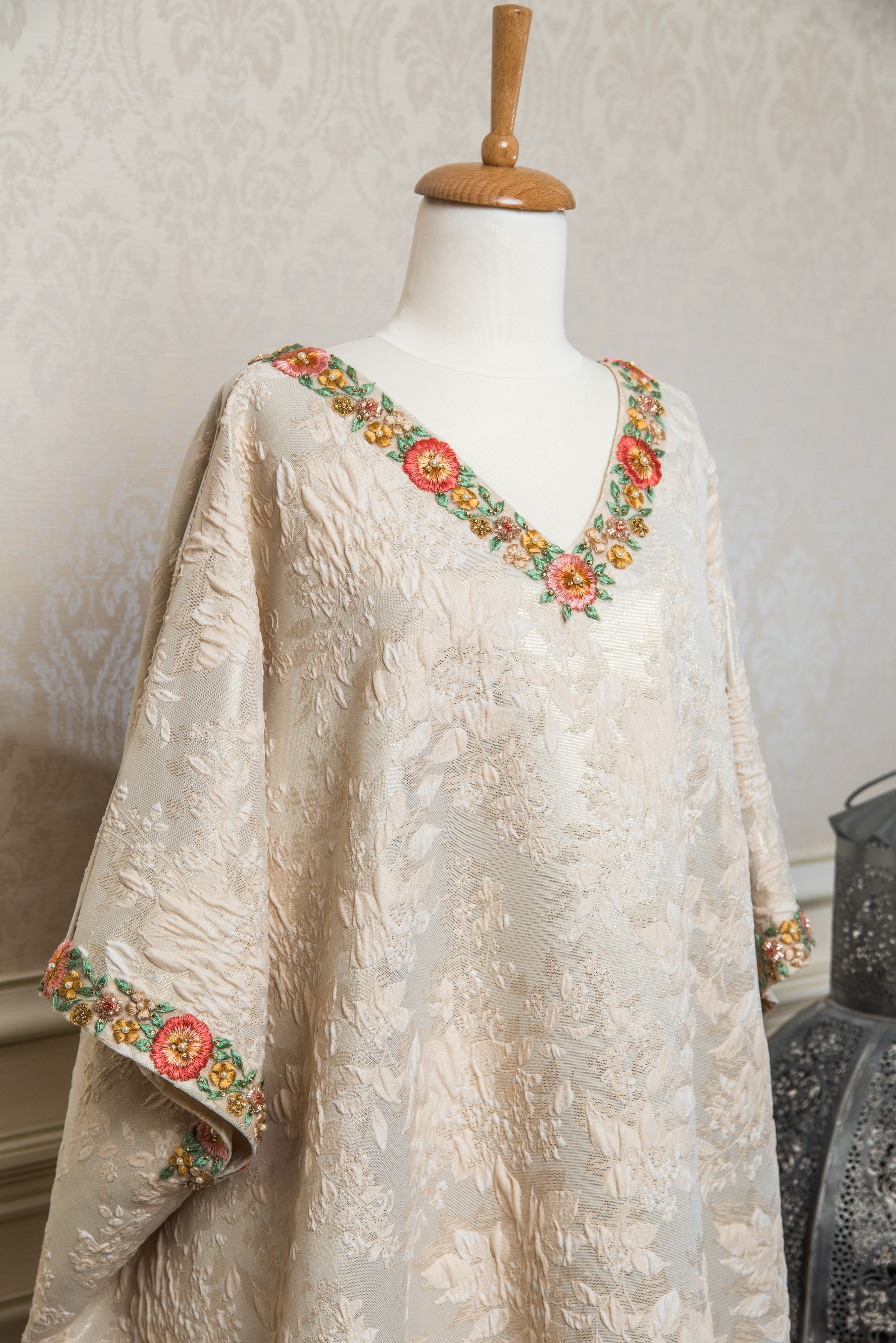 A graceful ode to feminine elegance, this seasonal kaftan showcases a beautifully textured jacquard fabric woven with soft floral and leaf motifs. Embellished with intricate hand embroidery in blossom-inspired tones—coral, peach, mint, and gold—the neckline is framed with floral appliqué, pearls, and sparkling seed beads.