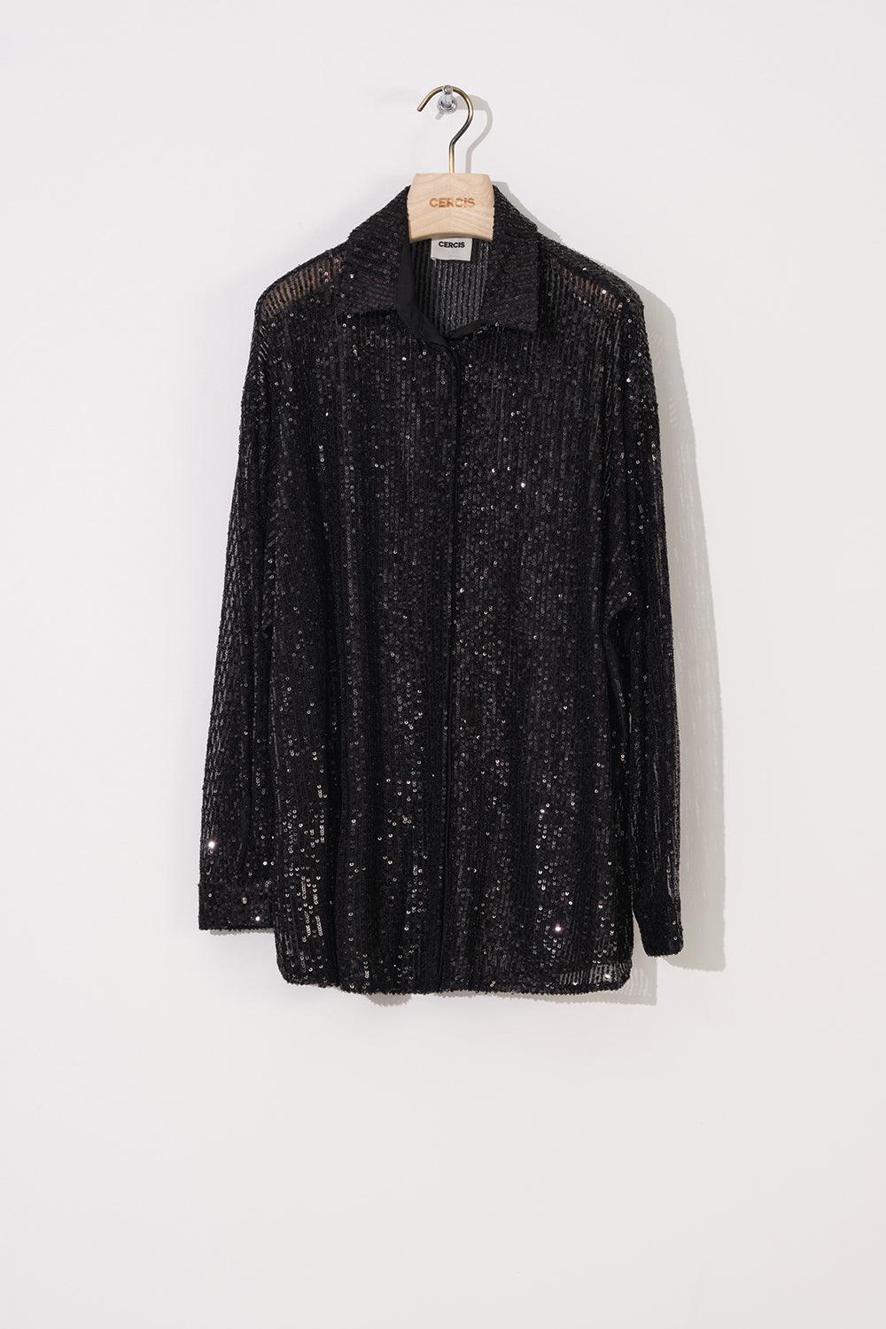 Relaxed-Fit Sequin Shirt with Cuffed Sleeves – Black