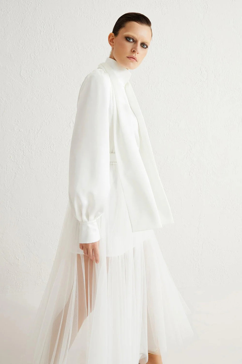 A refined satin tunic designed with architectural elegance and thoughtful tailoring. This piece features a structured high neckline with a delicate tie detail, adding a subtle focal point to the silhouette. Long sleeves with defined cuffs and precise English stitching enhance the clean, polished finish, while the concealed center-back zipper ensures a seamless look. Crafted from smooth satin fabric, the tunic drapes beautifully, offering a sophisticated balance between comfort and modern femininity.