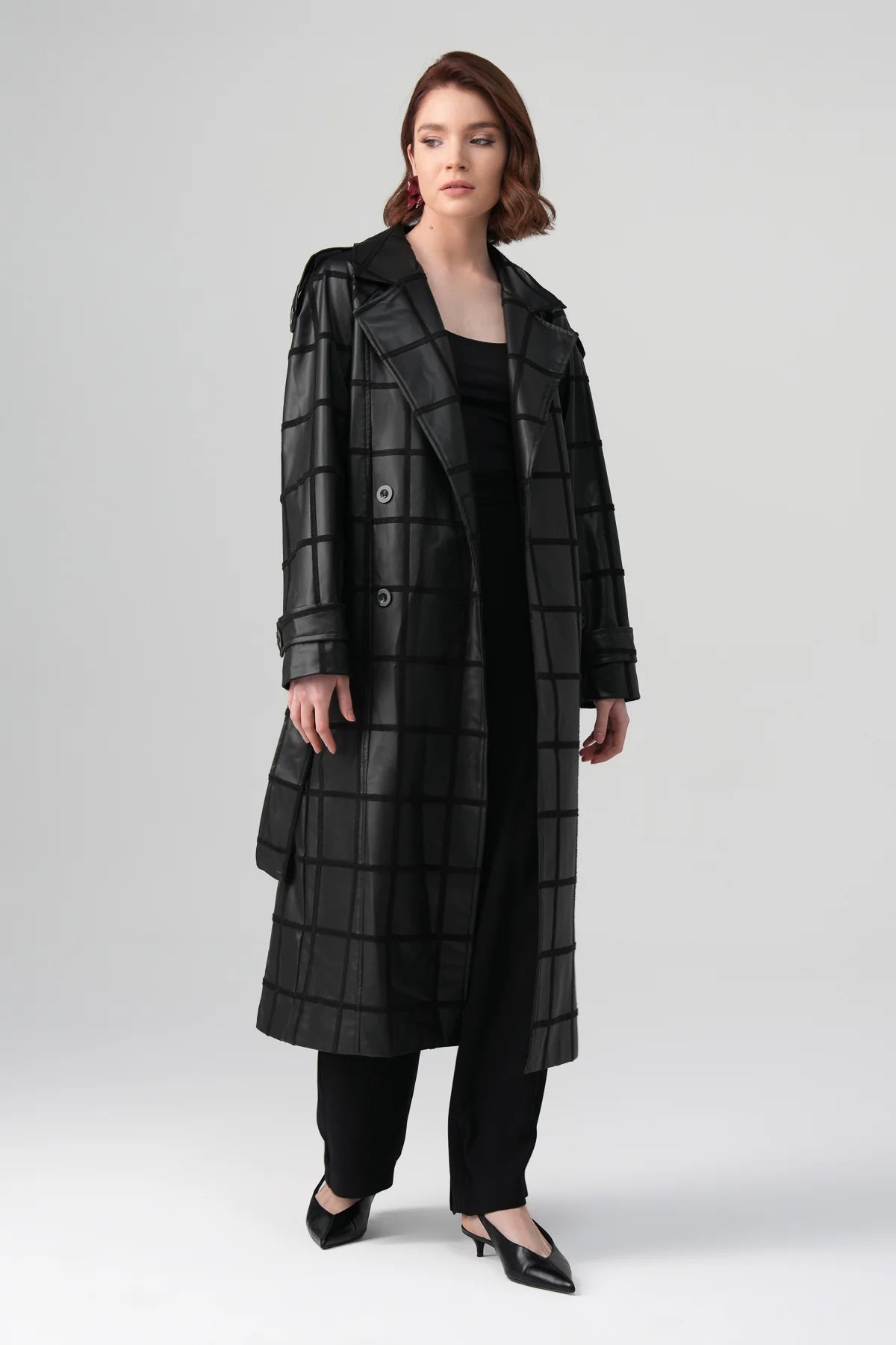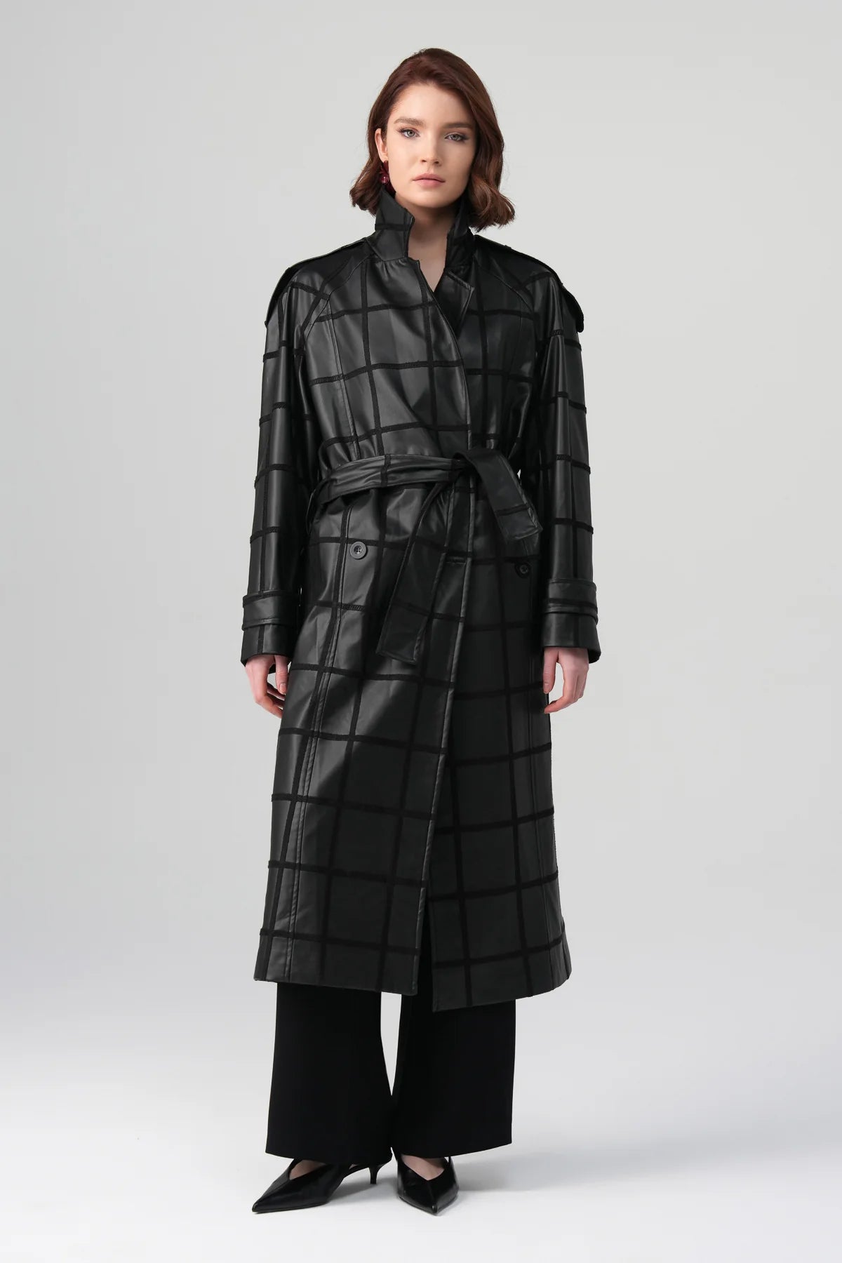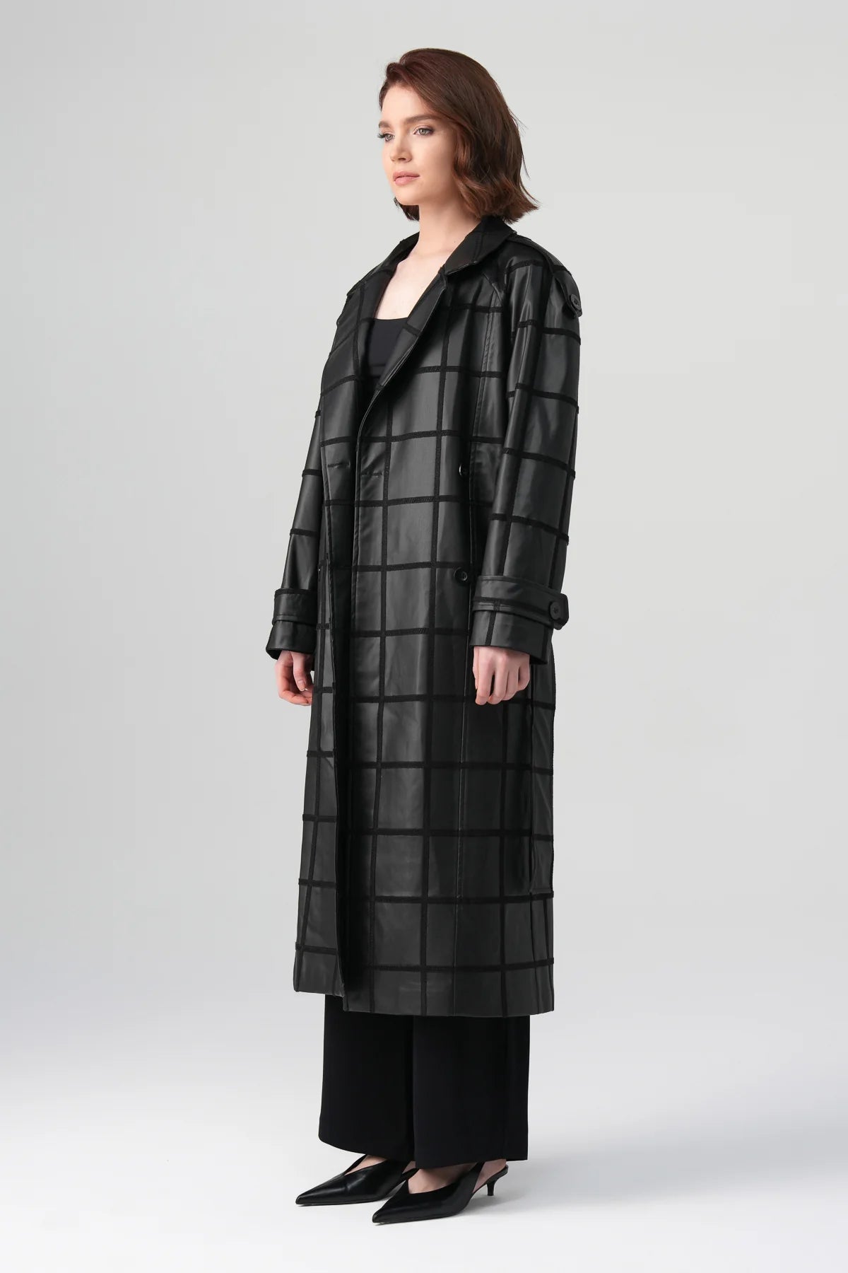 A modern outerwear piece defined by its structured silhouette and subtle textural contrast. The clean, elongated form is complemented by a grid-patterned surface with a soft leather-like finish, creating depth while maintaining a minimal aesthetic. Designed for everyday wear, it adds a confident, polished edge to layered looks.