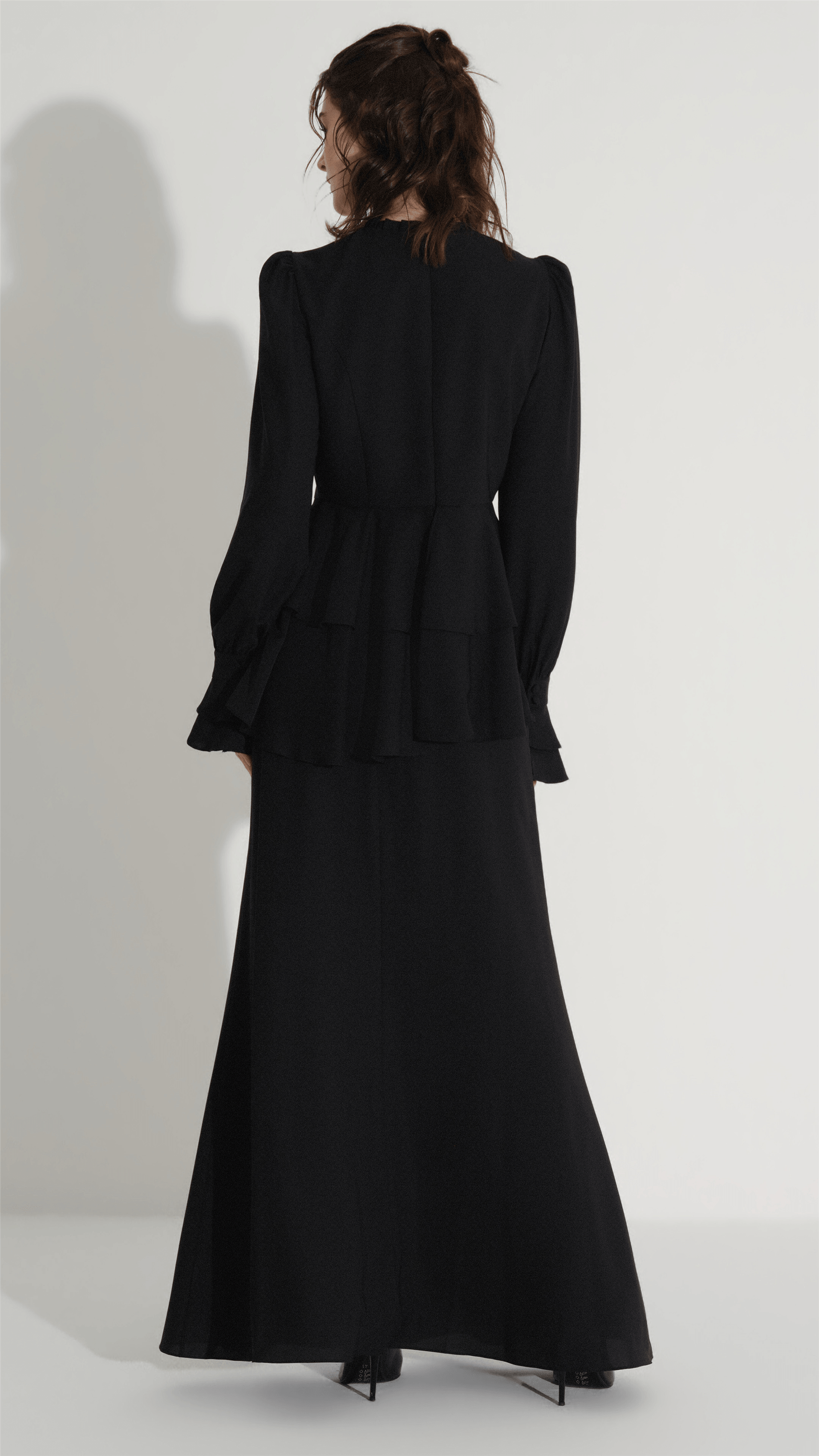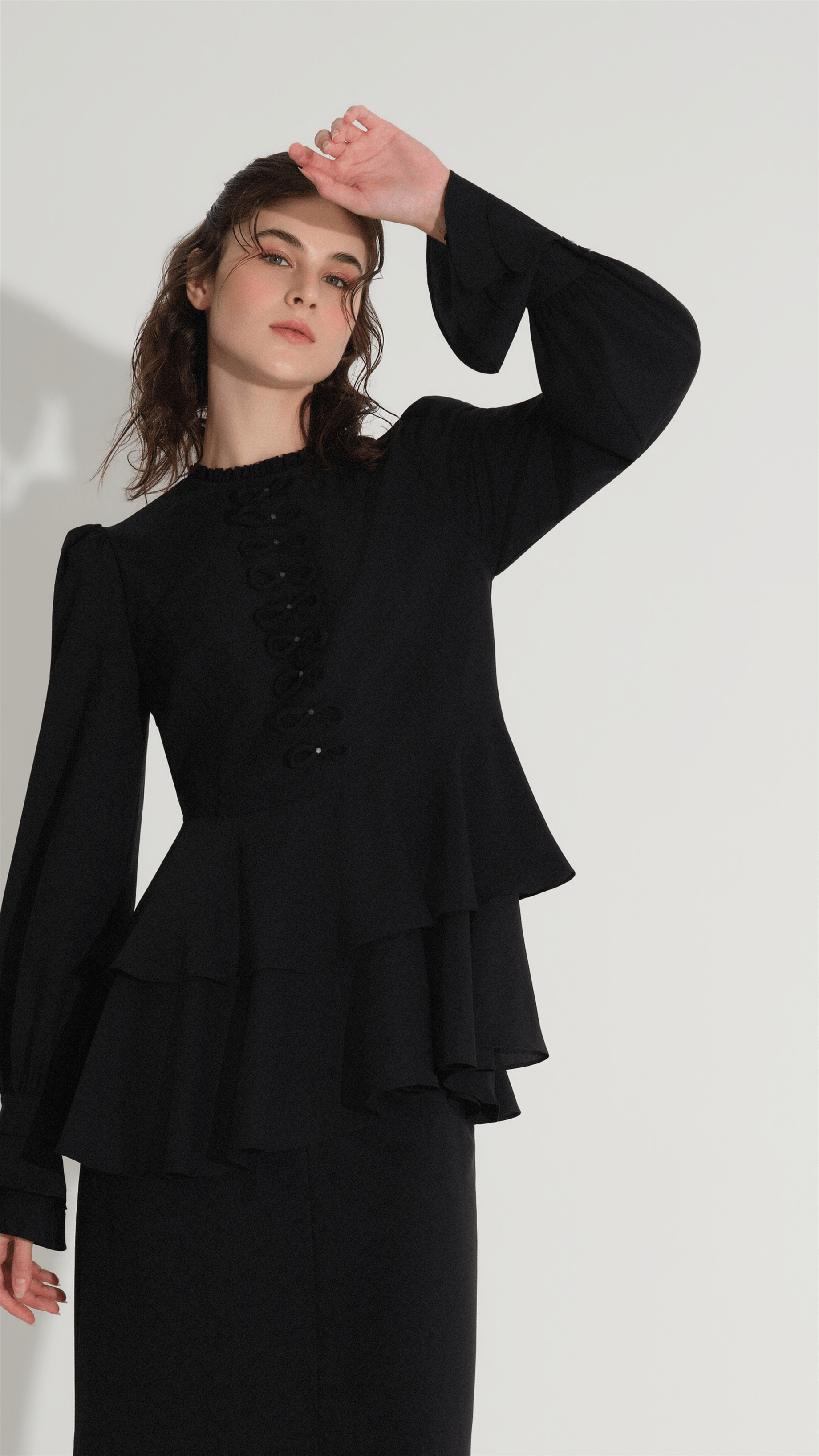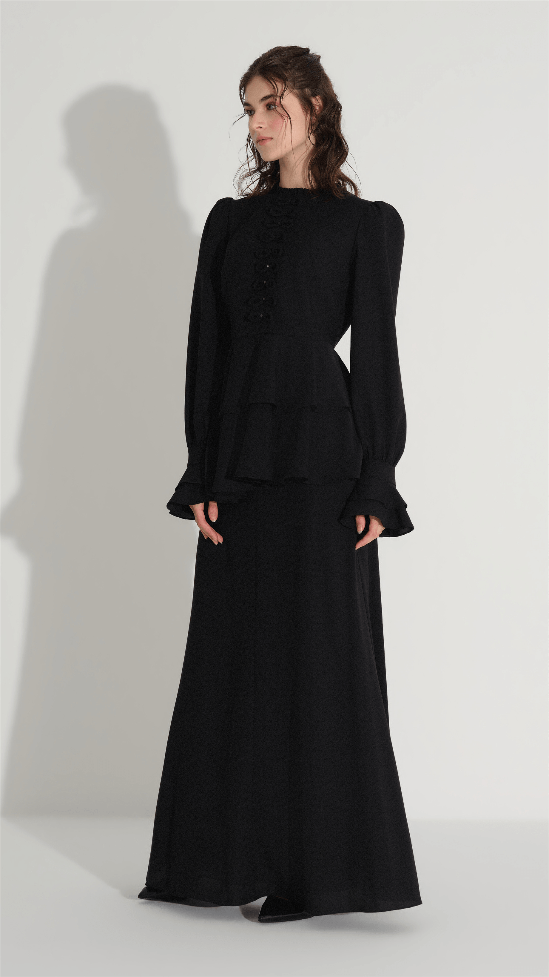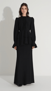 A refined two-piece set designed for elegant occasions, featuring a structured blouse with delicate bow embellishments and a flowing skirt that creates a balanced, graceful silhouette. The clean lines and minimal aesthetic are elevated by subtle decorative details, making it a versatile choice for both formal gatherings and modern evening looks.