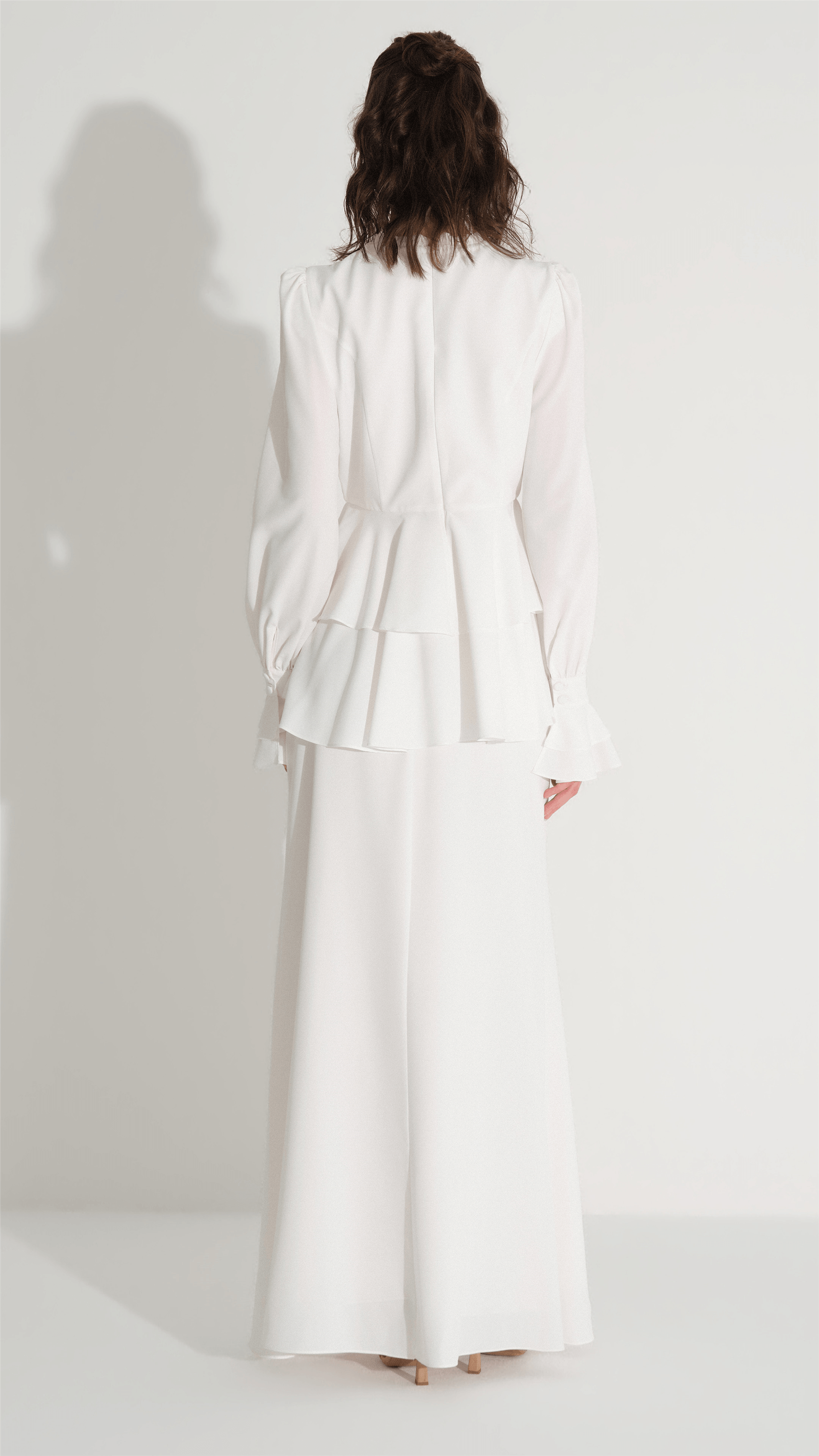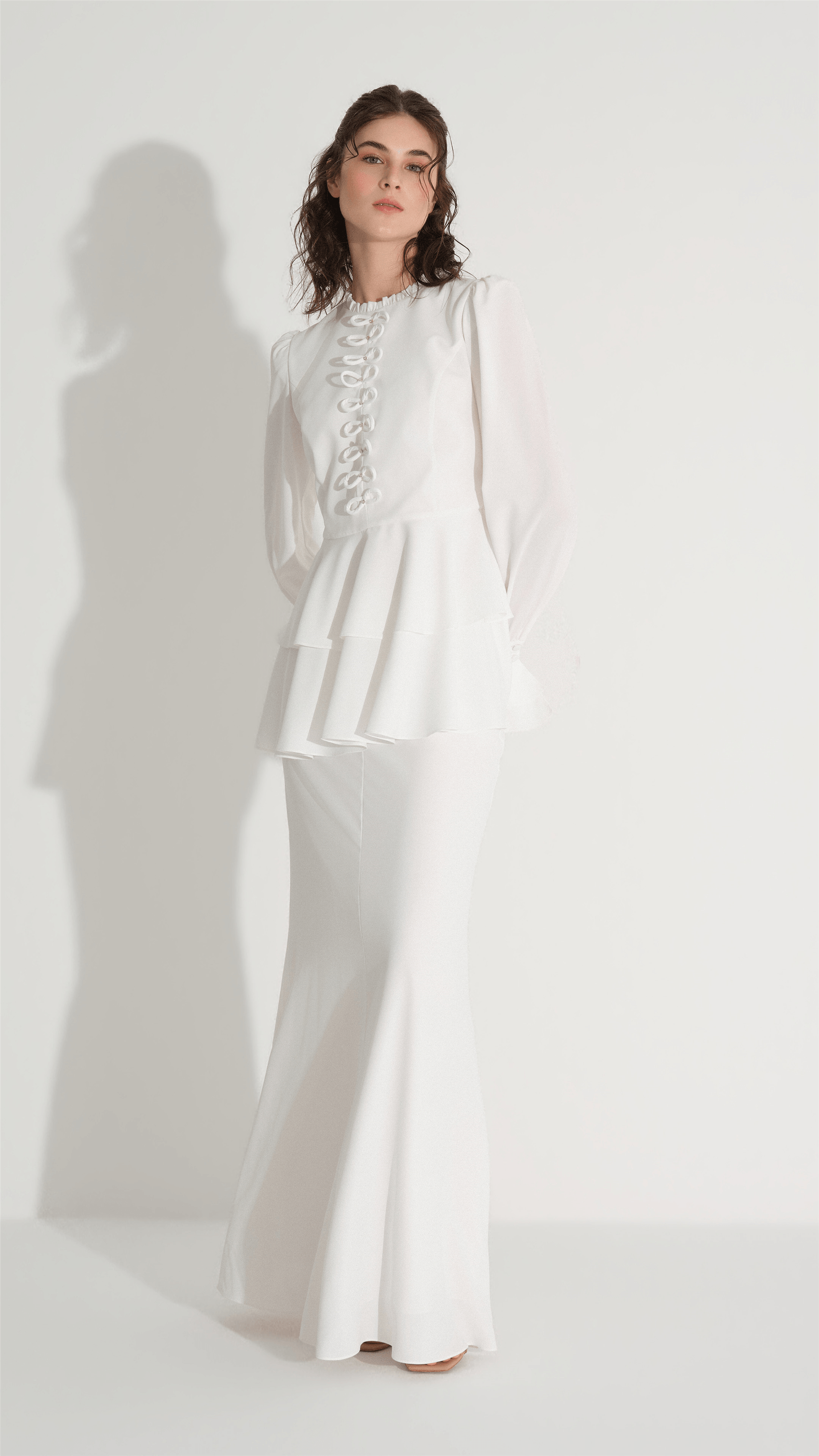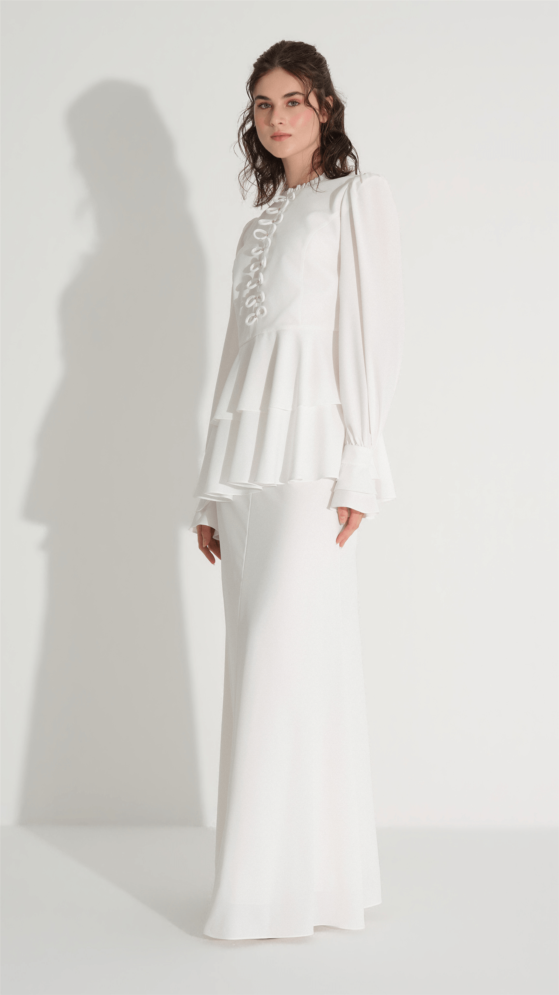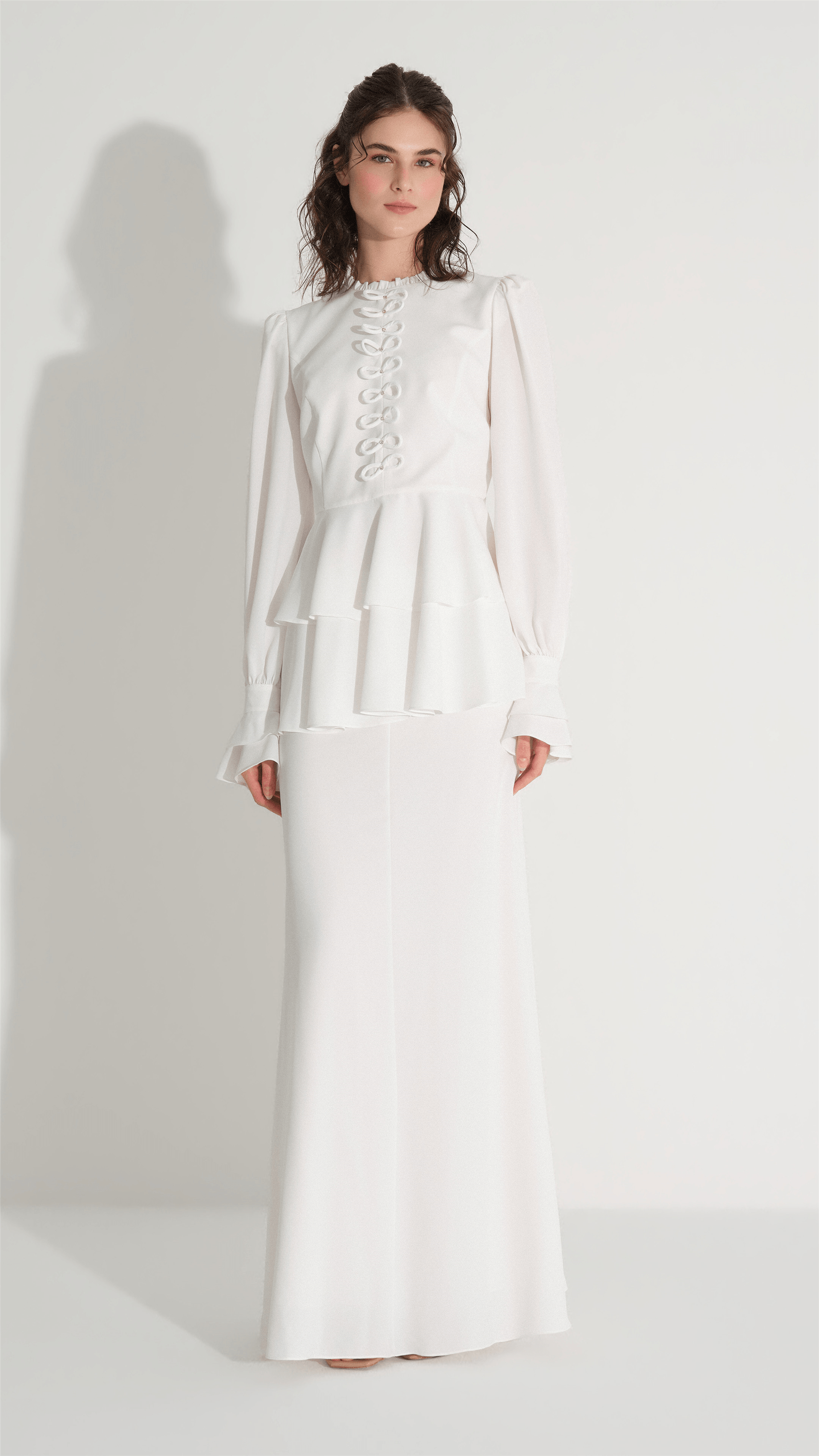 A refined two-piece set designed for elegant occasions, featuring a structured blouse with delicate bow embellishments and a flowing skirt that creates a balanced, graceful silhouette. The clean lines and minimal aesthetic are elevated by subtle decorative details, making it a versatile choice for both formal gatherings and modern evening looks.