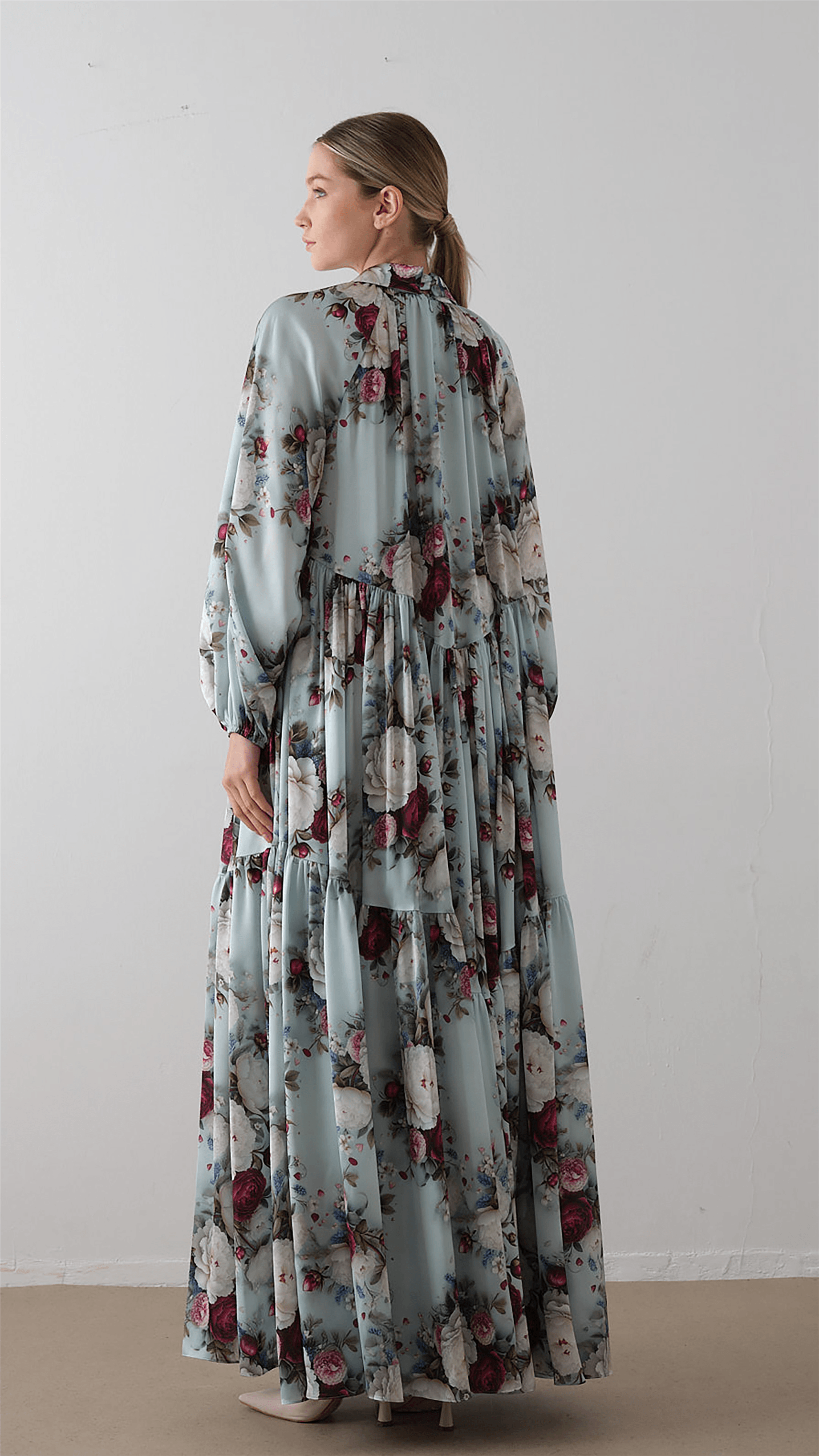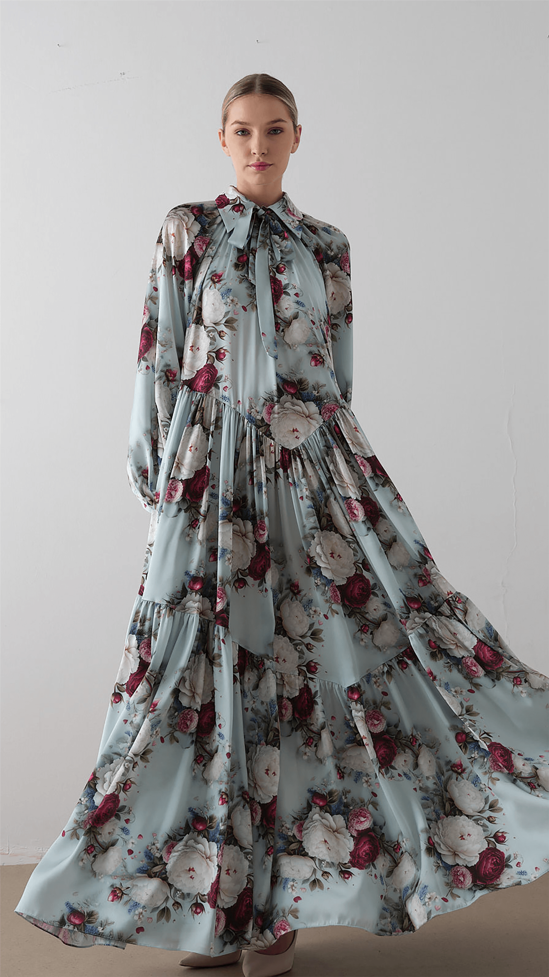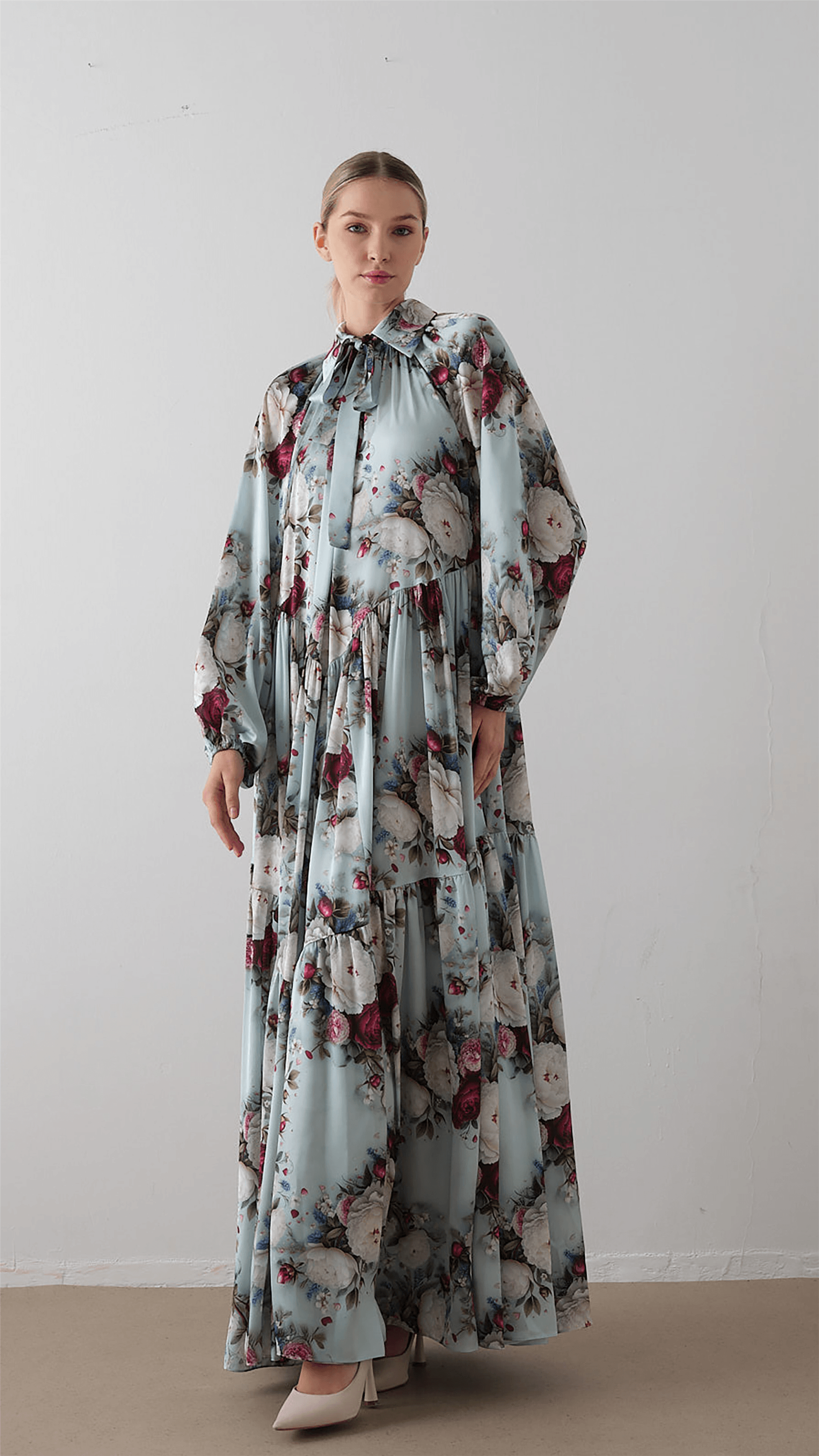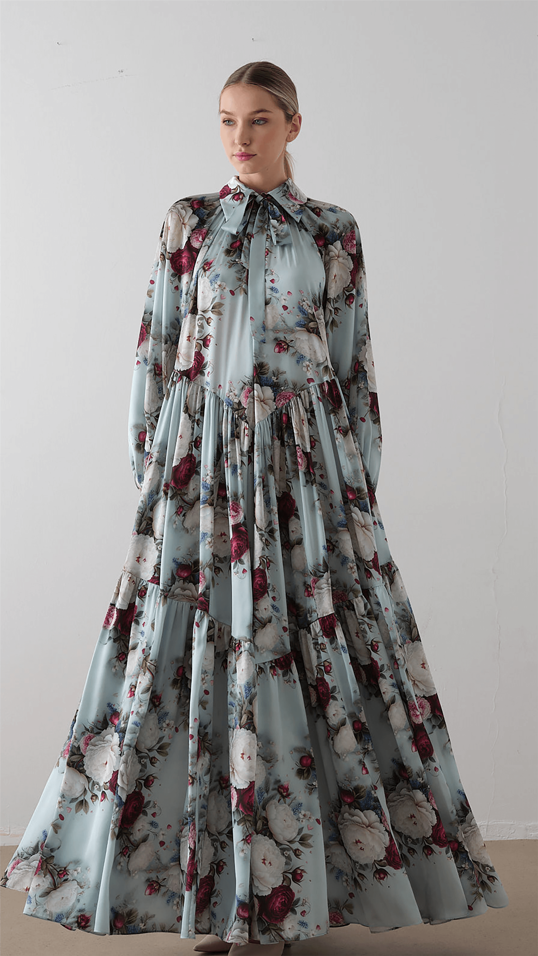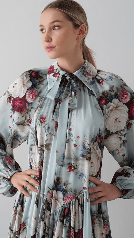 A soft, romantic silhouette designed with a flowing structure and delicate detailing. The dress features a tie-neck bow that adds a refined focal point, while the raglan sleeves and relaxed cut ensure comfort and ease of movement. The tiered skirt enhances volume and fluidity, complemented by a subtle floral pattern that brings a fresh, elegant character to the overall look.