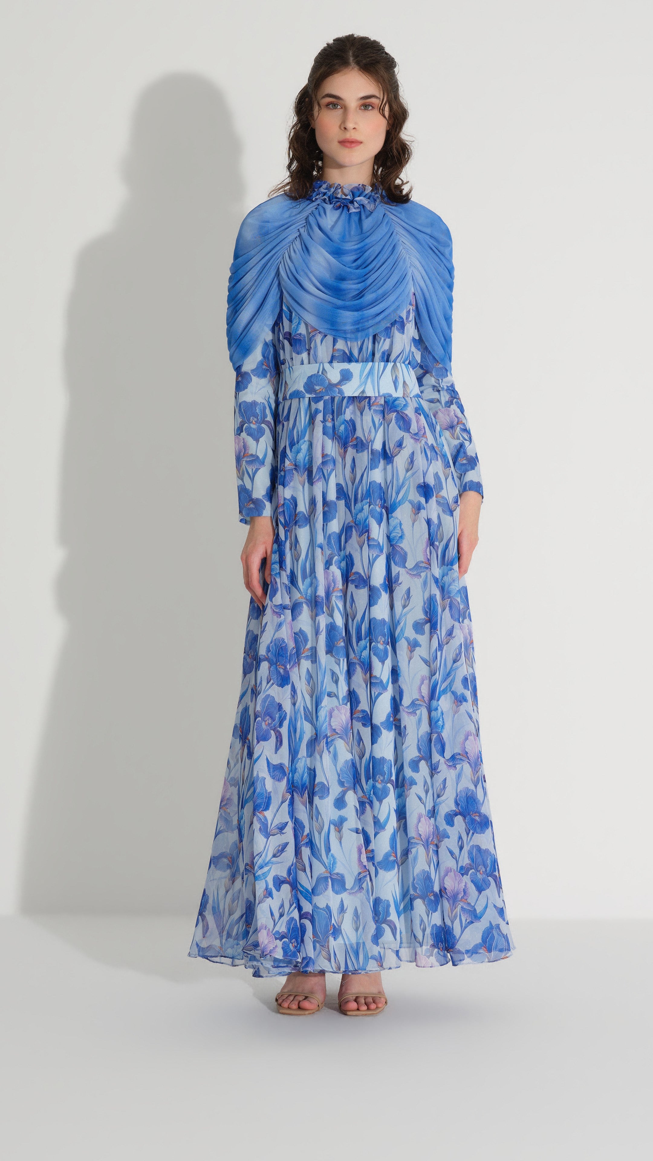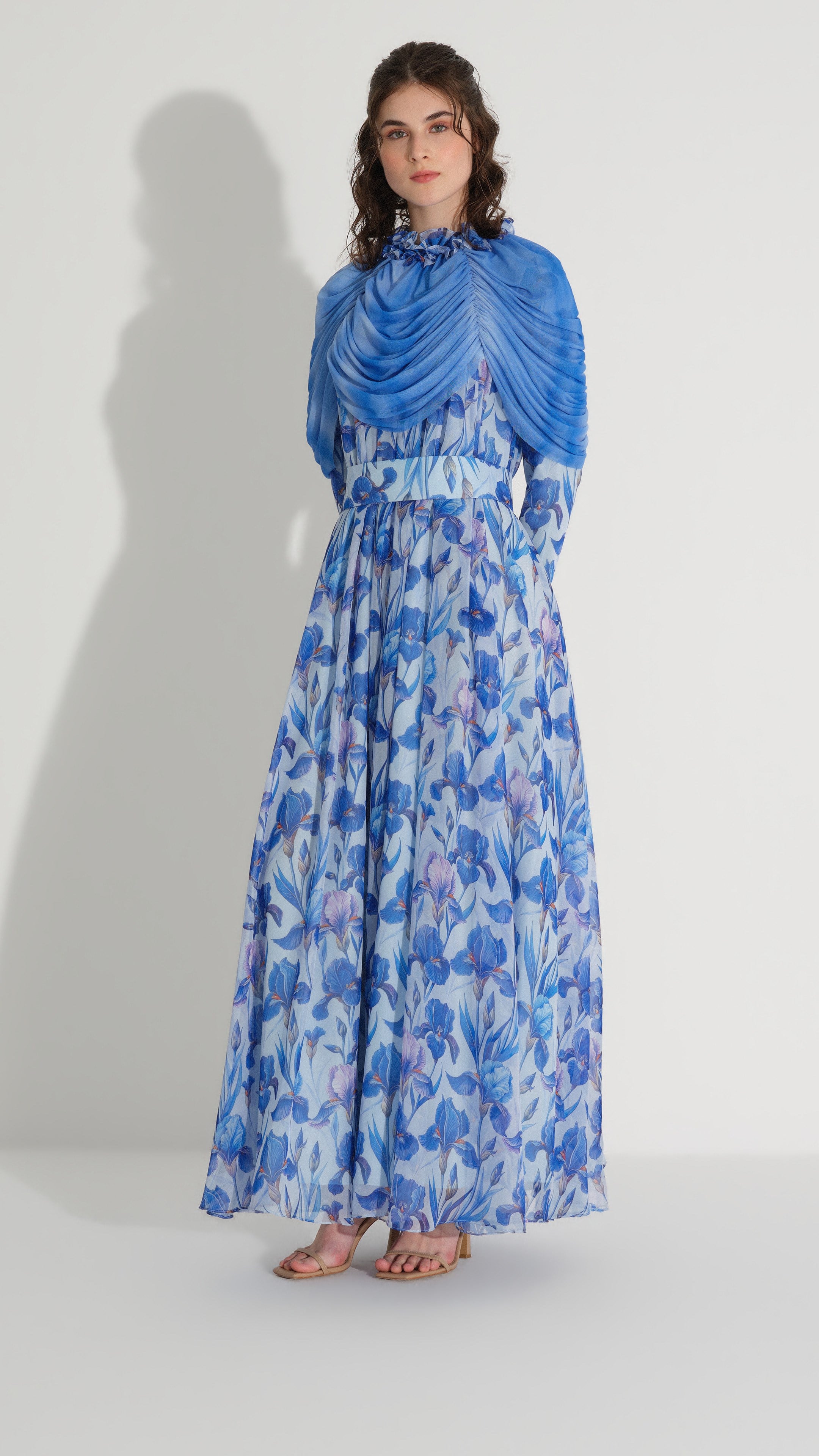 Cape Detail Silk Chiffon Dress – Blue