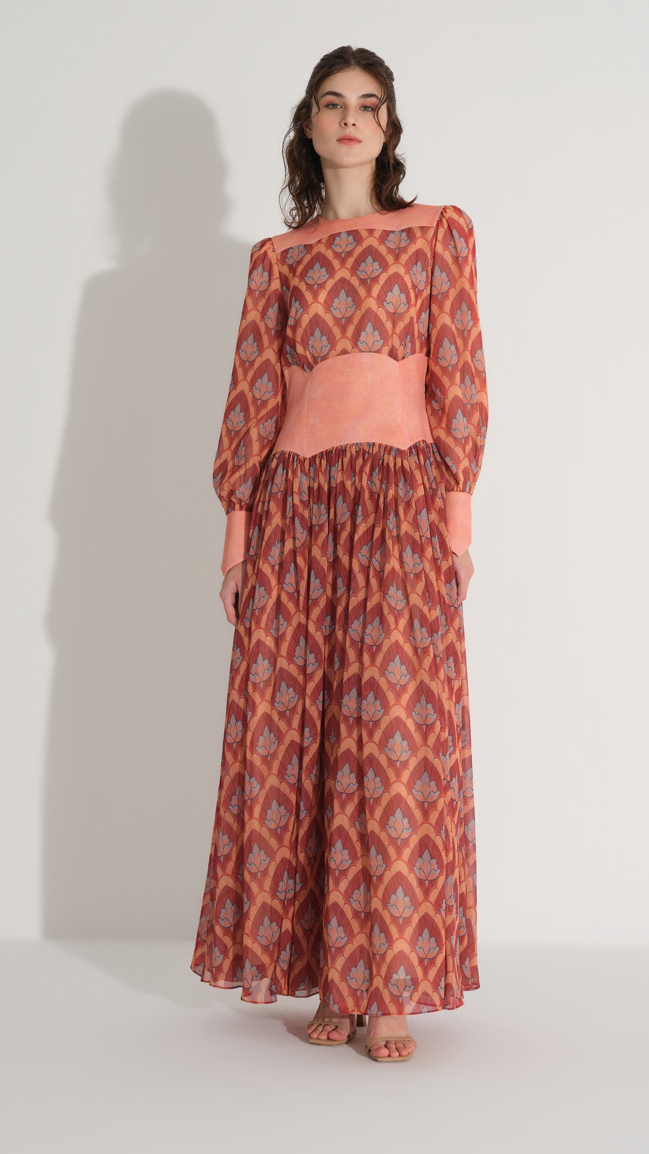 A distinctive silhouette defined by its corset-inspired waist panel, this dress combines structure with fluid movement. The lightweight chiffon fabric is adorned with an all-over print, while the gathered skirt creates soft volume and graceful motion. Structured cuffs and a defined bodice enhance the overall composition with a refined, modern edge.