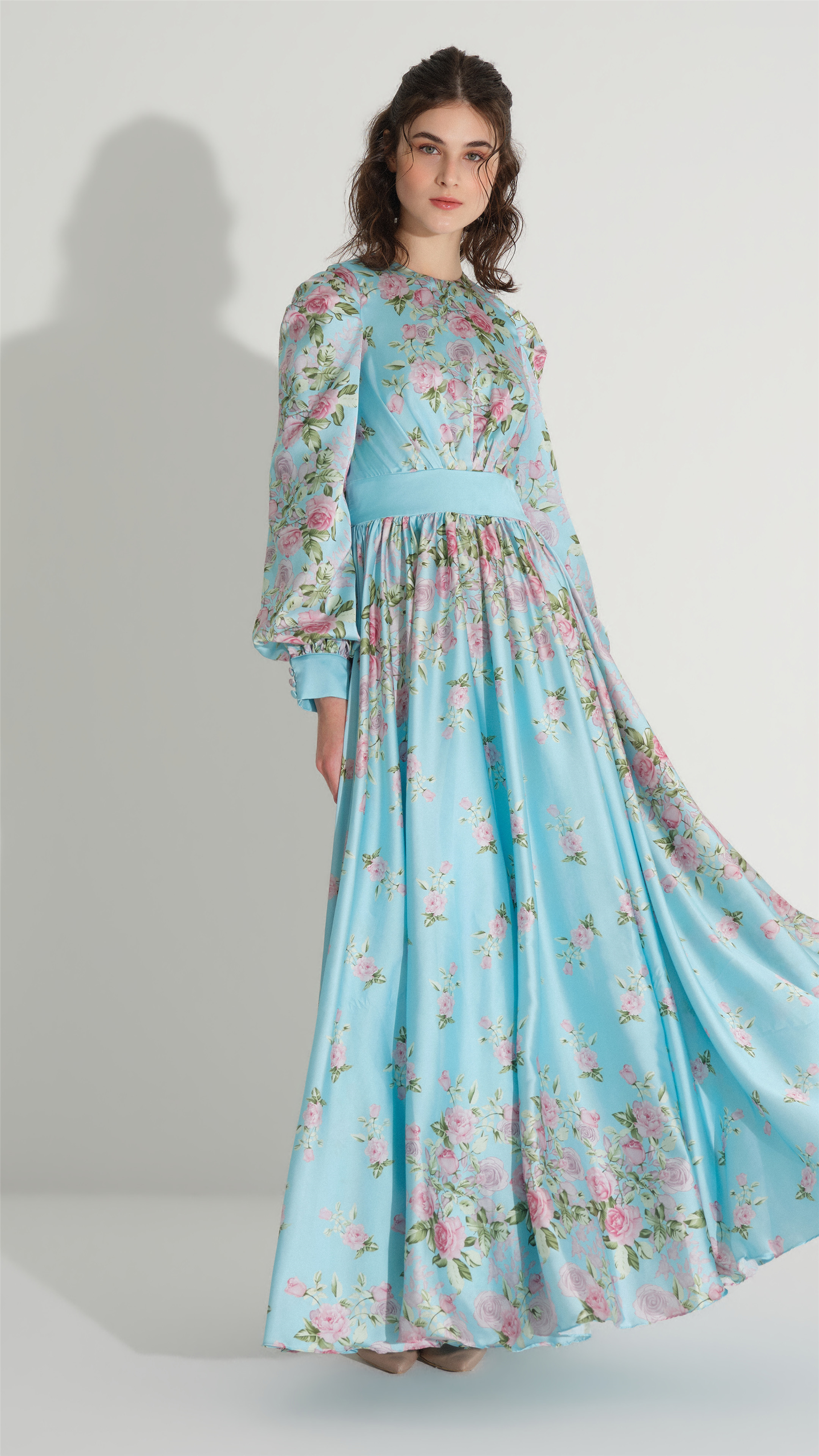 A romantic interpretation of modern femininity, this dress is crafted from fluid satin and adorned with delicate floral motifs. The softly structured bodice is balanced by a defined waistband, while the gently gathered skirt creates graceful movement with every step. Refined yet expressive, it captures a timeless seasonal elegance.