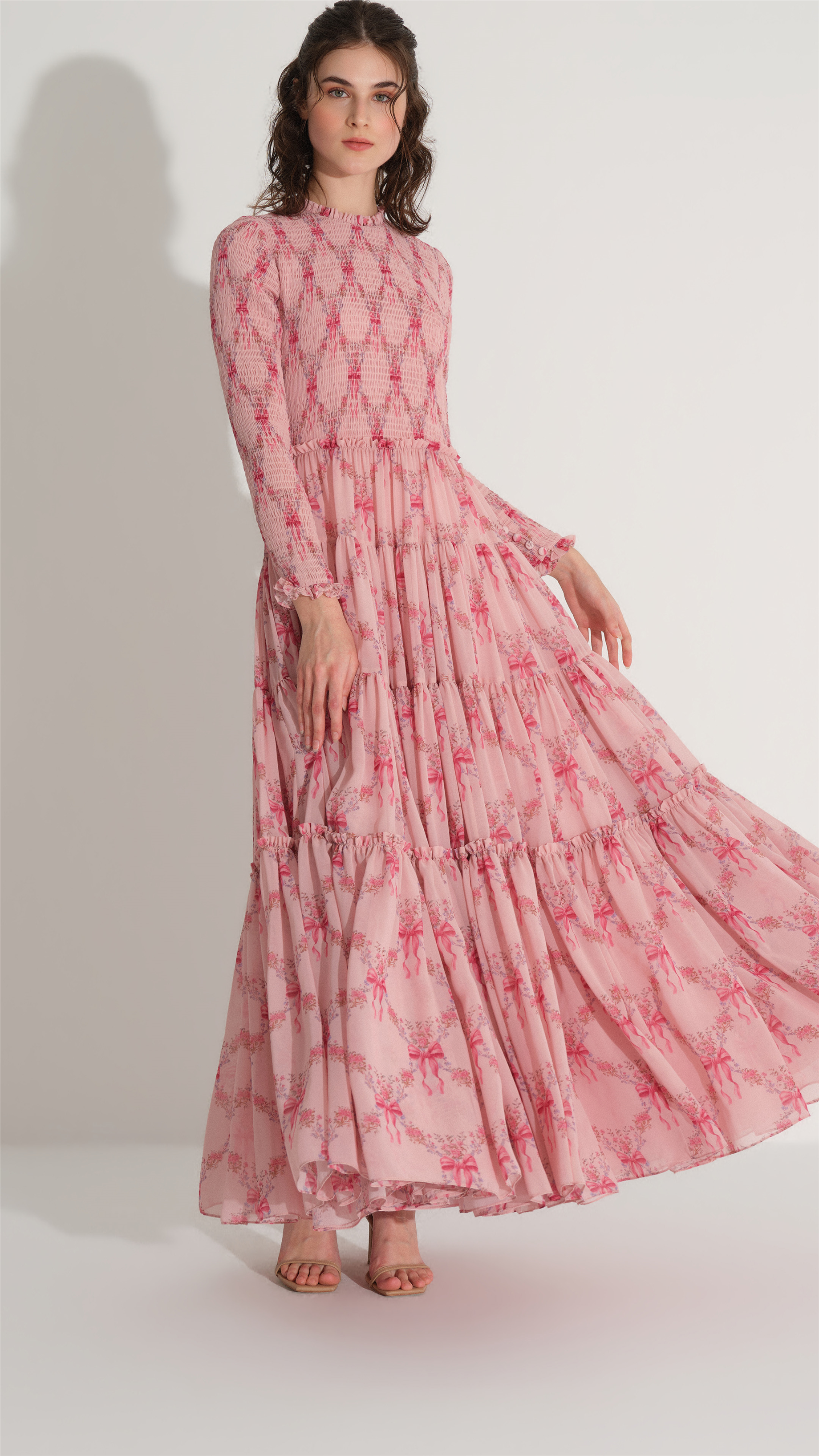A statement silhouette defined by texture and volume, this dress features a smocked bodice that transitions into layered pleats, creating depth and movement. The lightweight chiffon fabric enhances its fluidity, while the voluminous sleeves add a refined, contemporary balance. Designed for elevated occasions, it offers a graceful yet expressive presence.
