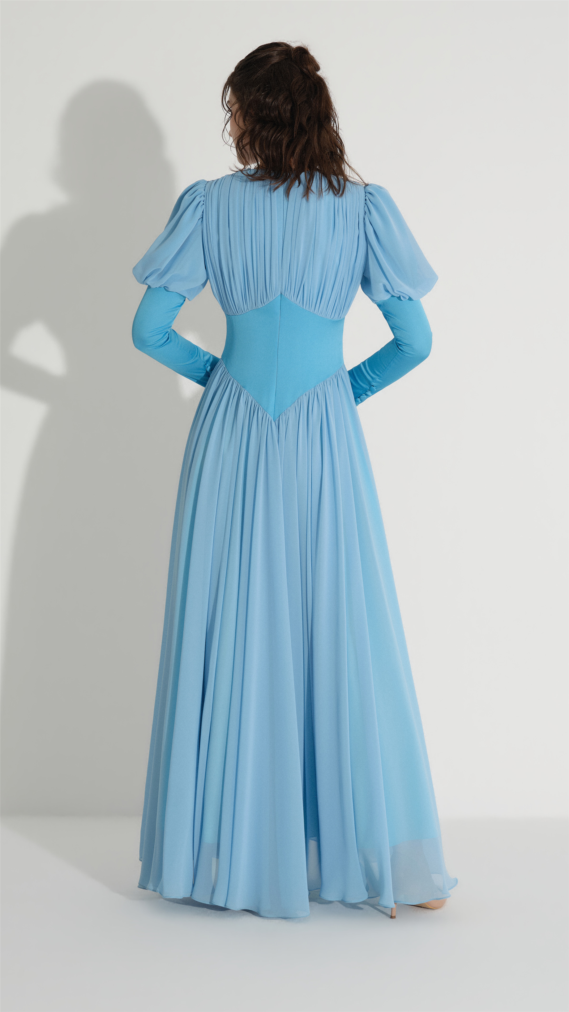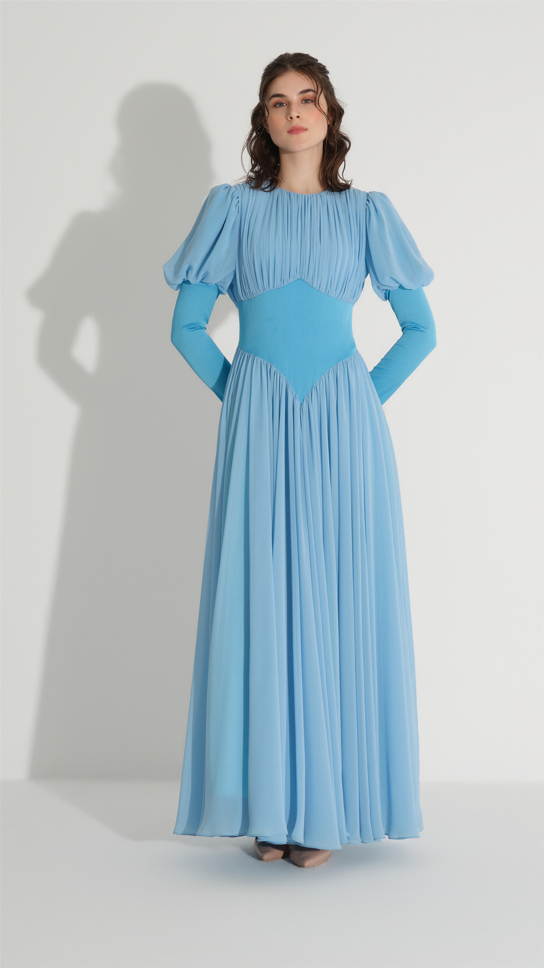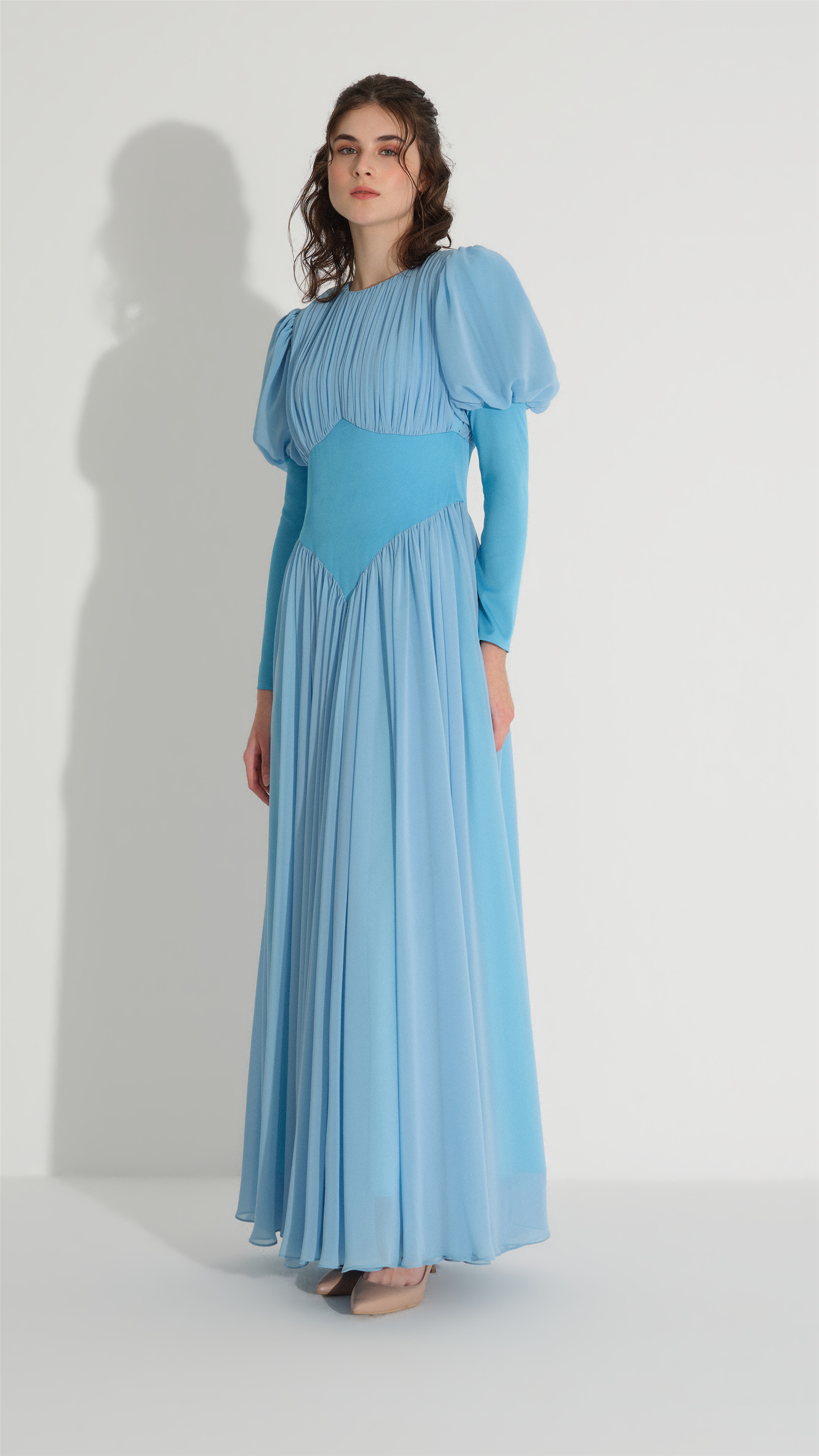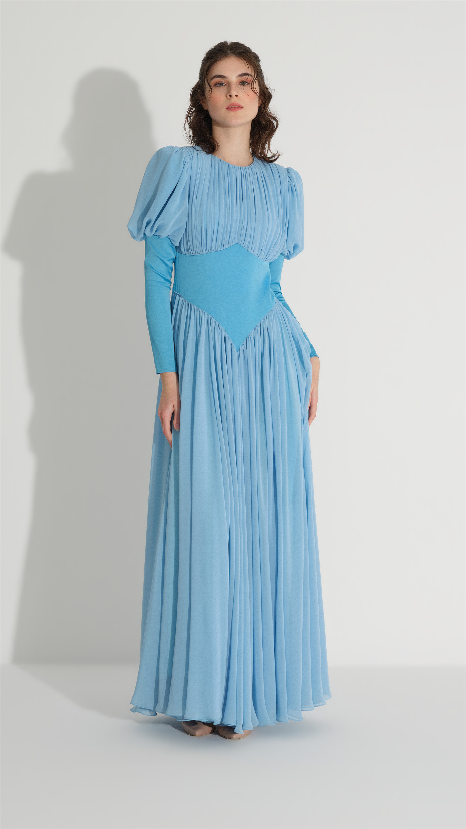 A refined silhouette shaped by a structured, corset-inspired waist that creates a defined and elegant form. The V-cut waist detail enhances the natural lines of the body, while the lightweight chiffon fabric allows the skirt to fall with soft, fluid movement. Clean lines and minimal construction give the design a modern, polished finish suitable for both formal and semi-formal occasions.