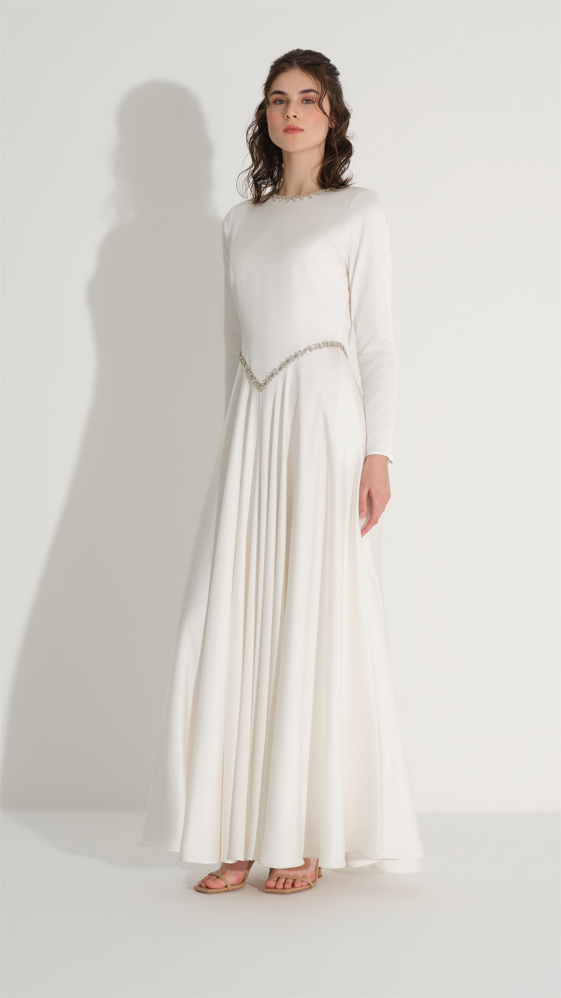 A refined silhouette elevated by delicate embellishment and clean construction. The design features subtle stone detailing at the neckline and waist, creating a luminous focal point while maintaining a minimal aesthetic. The softly structured bodice flows into an elegant skirt, offering a balanced composition suited for formal occasions and evening events.