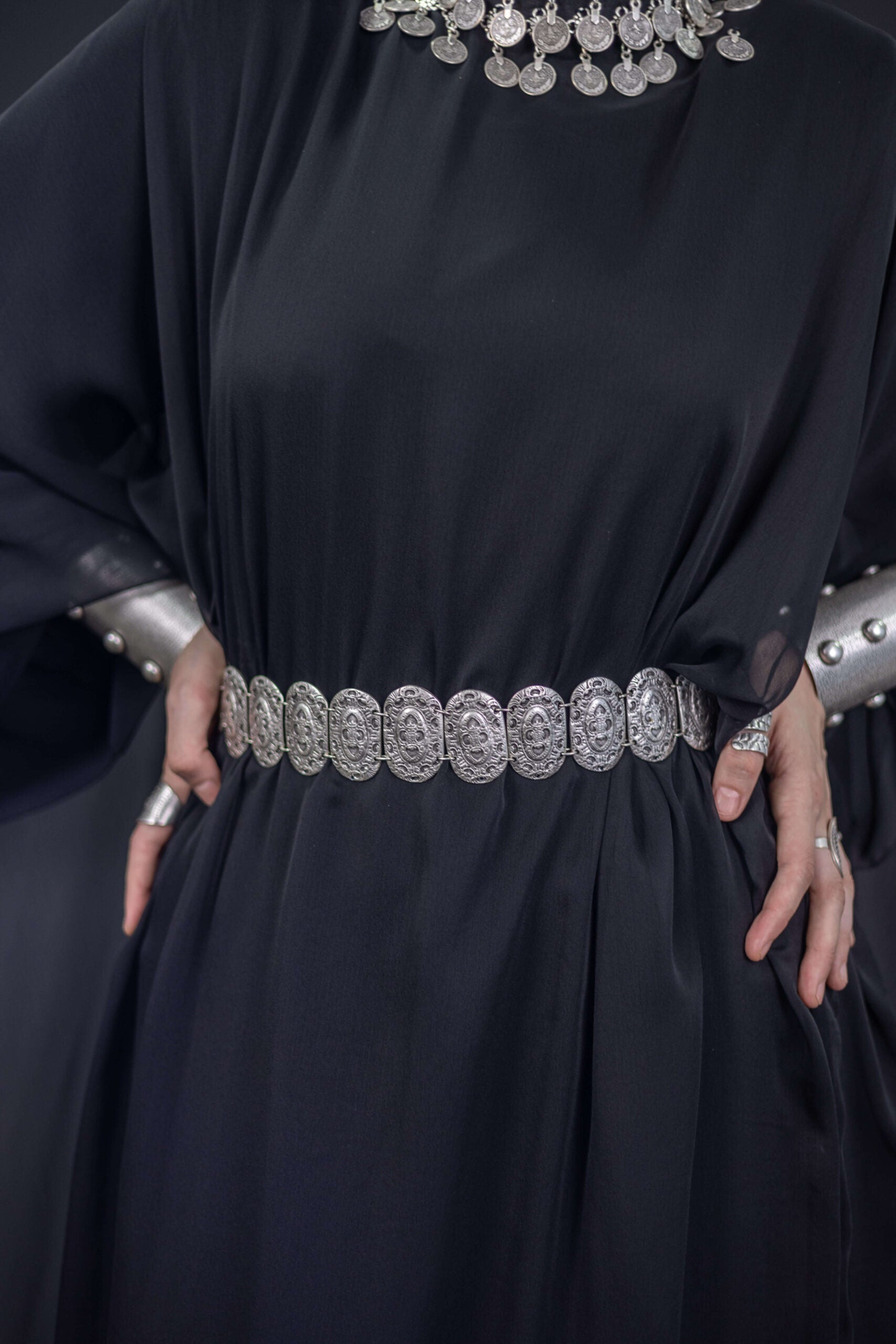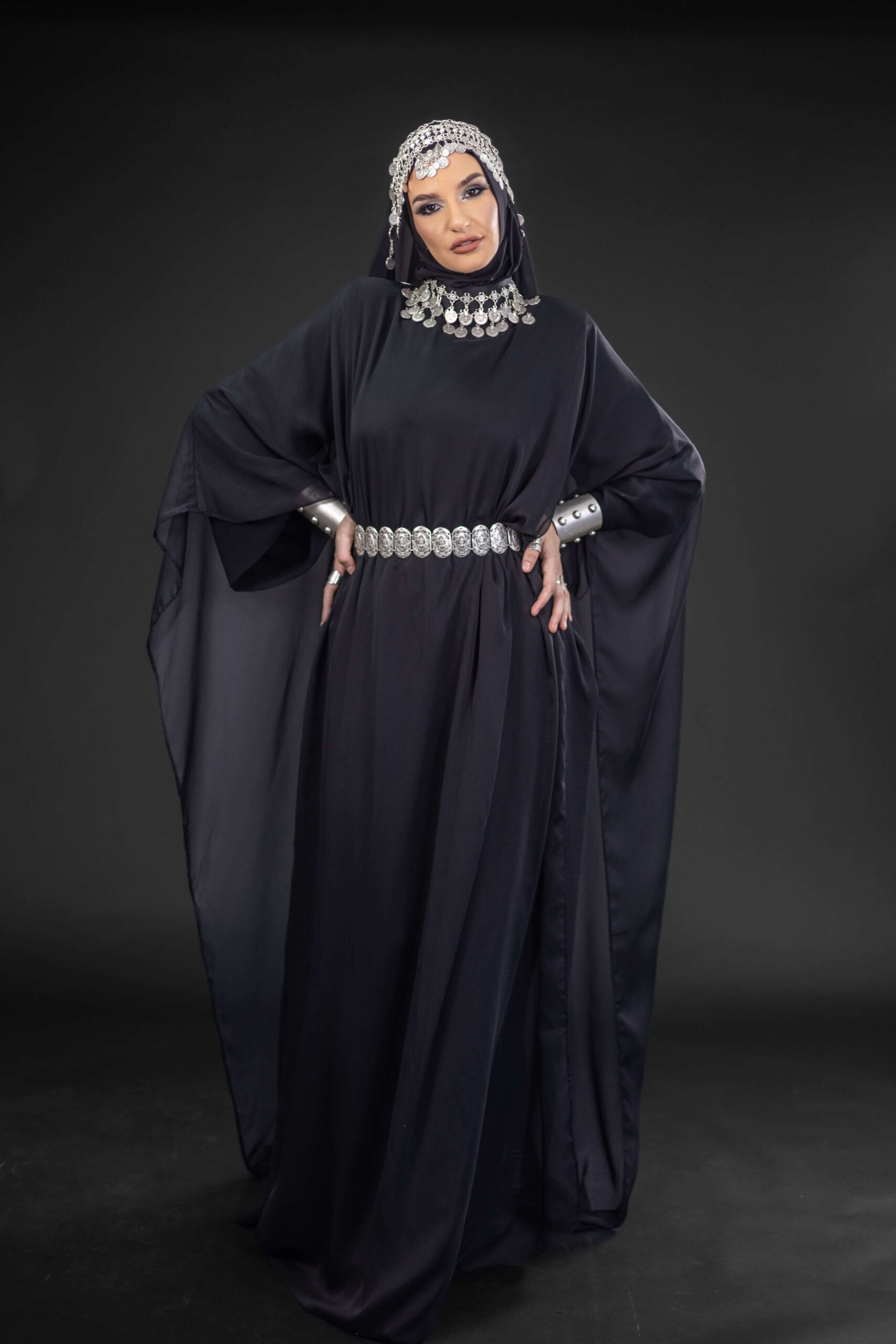 A powerful interpretation of timeless femininity, this abaya is designed for the modern woman who draws strength from heritage. Crafted from fluid chiffon, it features a dramatic, flowing silhouette accented with traditional coin-inspired details that move gently with every step. The result is a commanding yet elegant piece—bold, steadfast, and unapologetically refined.