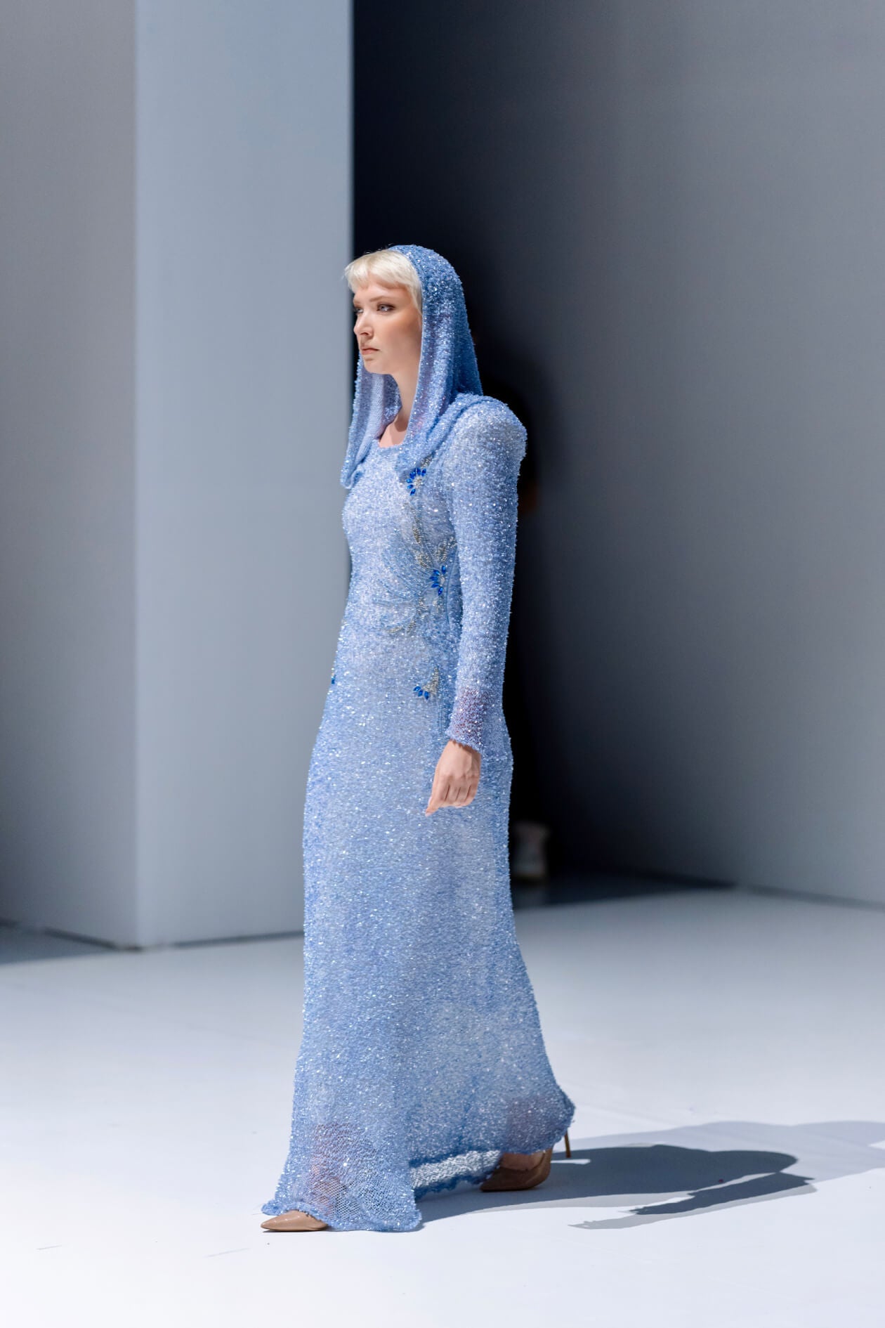 A crystal-infused light blue gown designed to shimmer with every movement. Its fluid silhouette is elevated by delicate floral accents and an all-over crystal surface that captures light like water under moonlight. Ethereal and radiant, this piece evokes the grace of a modern mermaid—refined, luminous, and unforgettable.