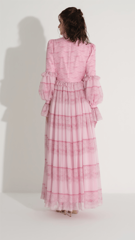A refined composition of contrasting textures and patterns, this dress features a delicately detailed bodice paired with a statement panel-print skirt. The ruffled neckline and cuffs introduce a soft, romantic accent, while the fitted waist creates a balanced and feminine silhouette. The lightweight chiffon fabric enhances movement, offering an elegant and expressive look.