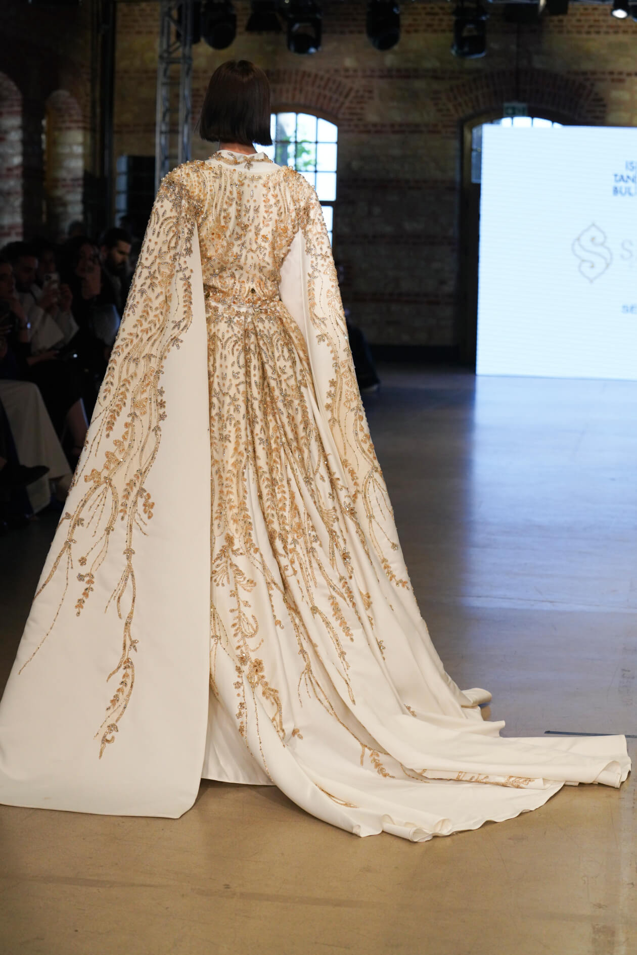 • Details: Three-piece couture construction; long-sleeved embroidered bodice; dramatic trailing sleeves; over 3-meter embellished train; gold and silver floral embroidery; crystal and bead embellishment; couture hand-finishing