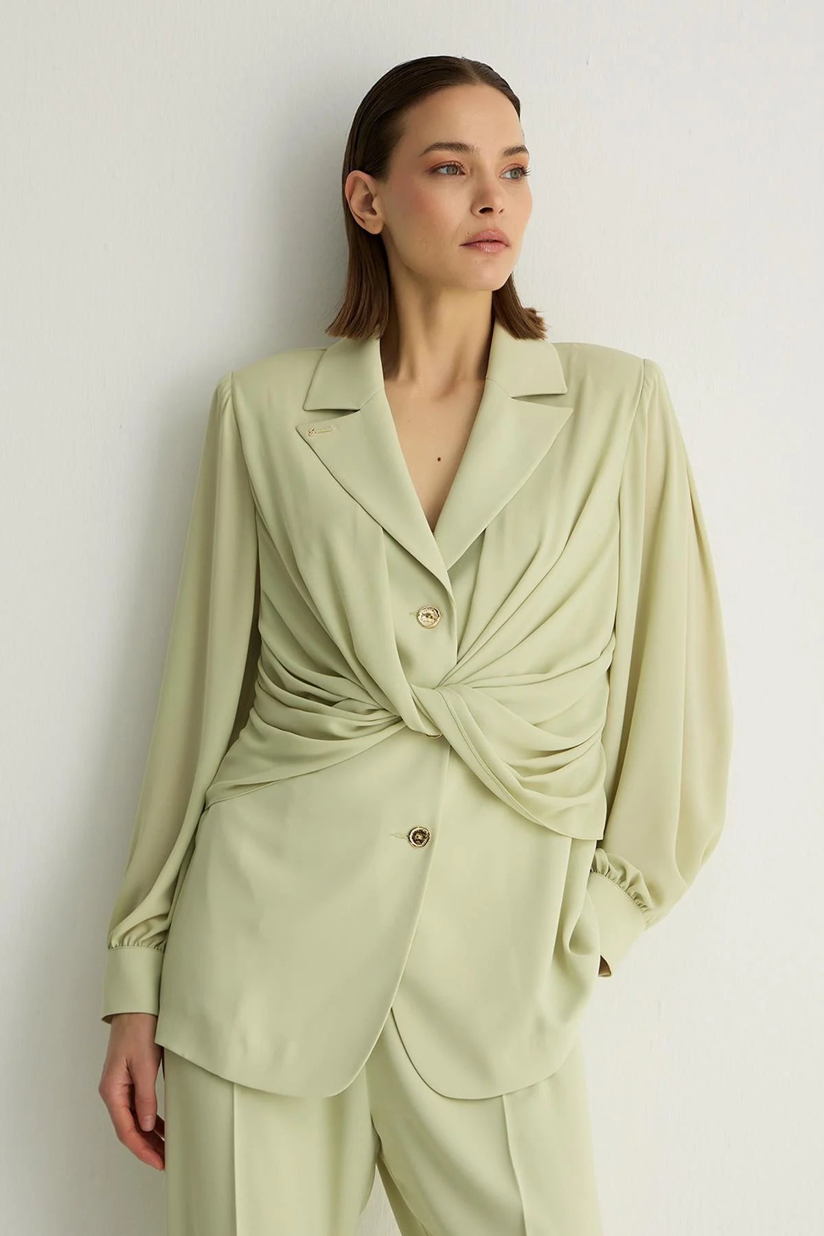 A statement in refined femininity, this tailored jacket is defined by its softly draped waist detail that creates a naturally sculpted silhouette. The fluid structure, combined with a classic lapel and button-front closure, balances elegance with modern ease. Designed for versatility, it transitions seamlessly from professional settings to elevated everyday wear.