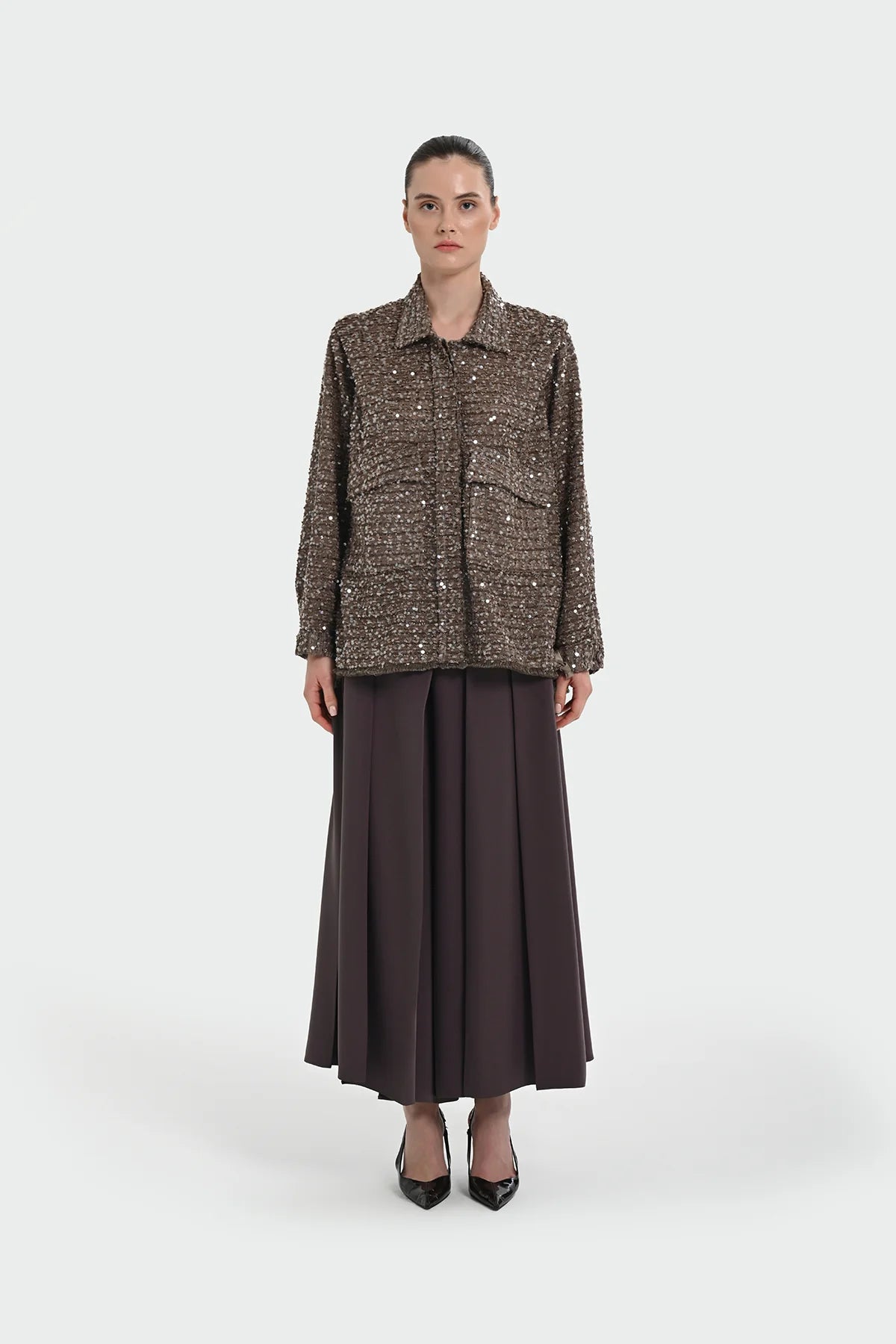 Sequin Embellished Shirt-Collar Jacket — Brown