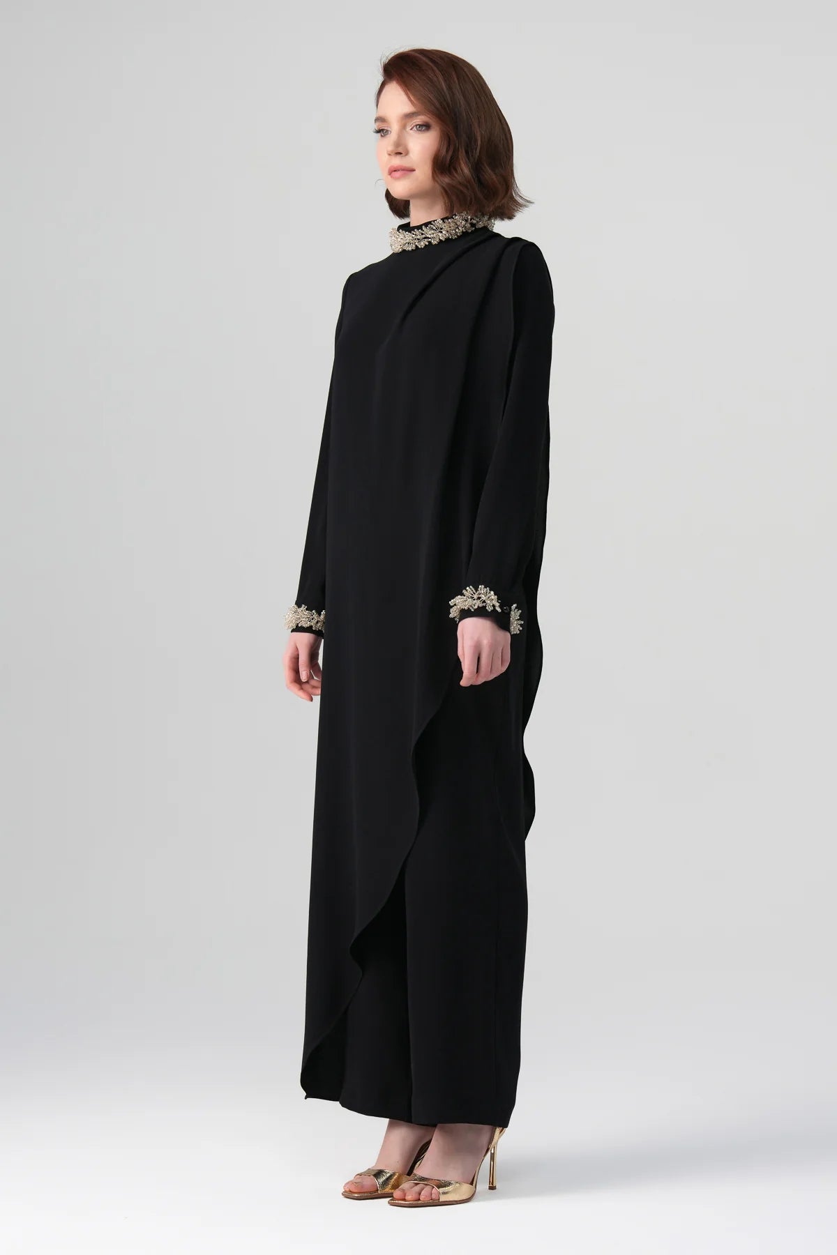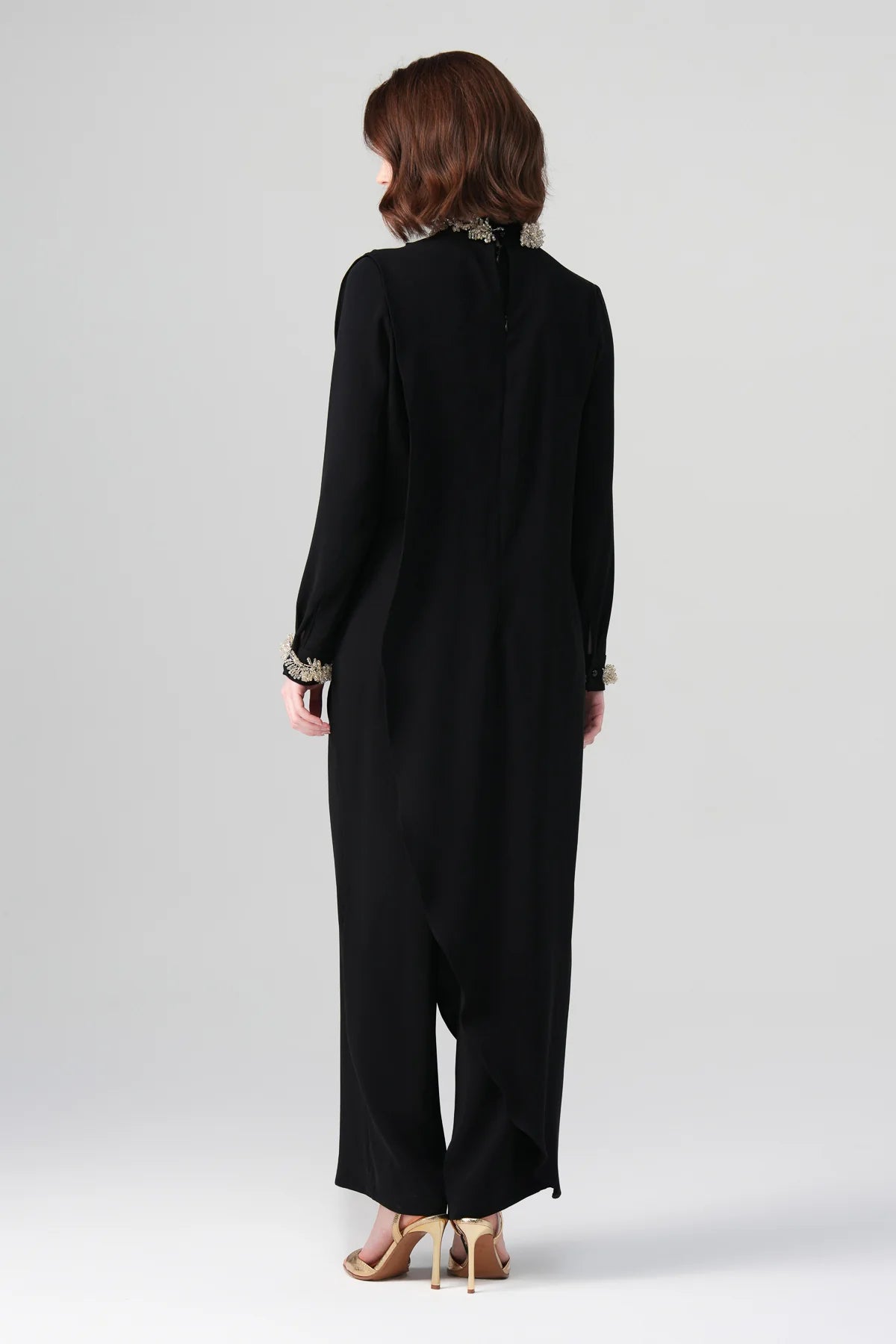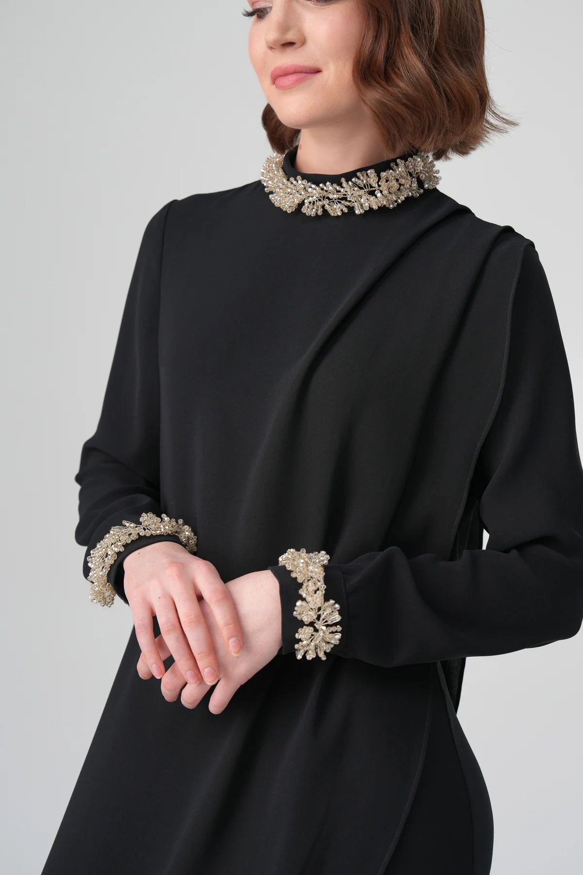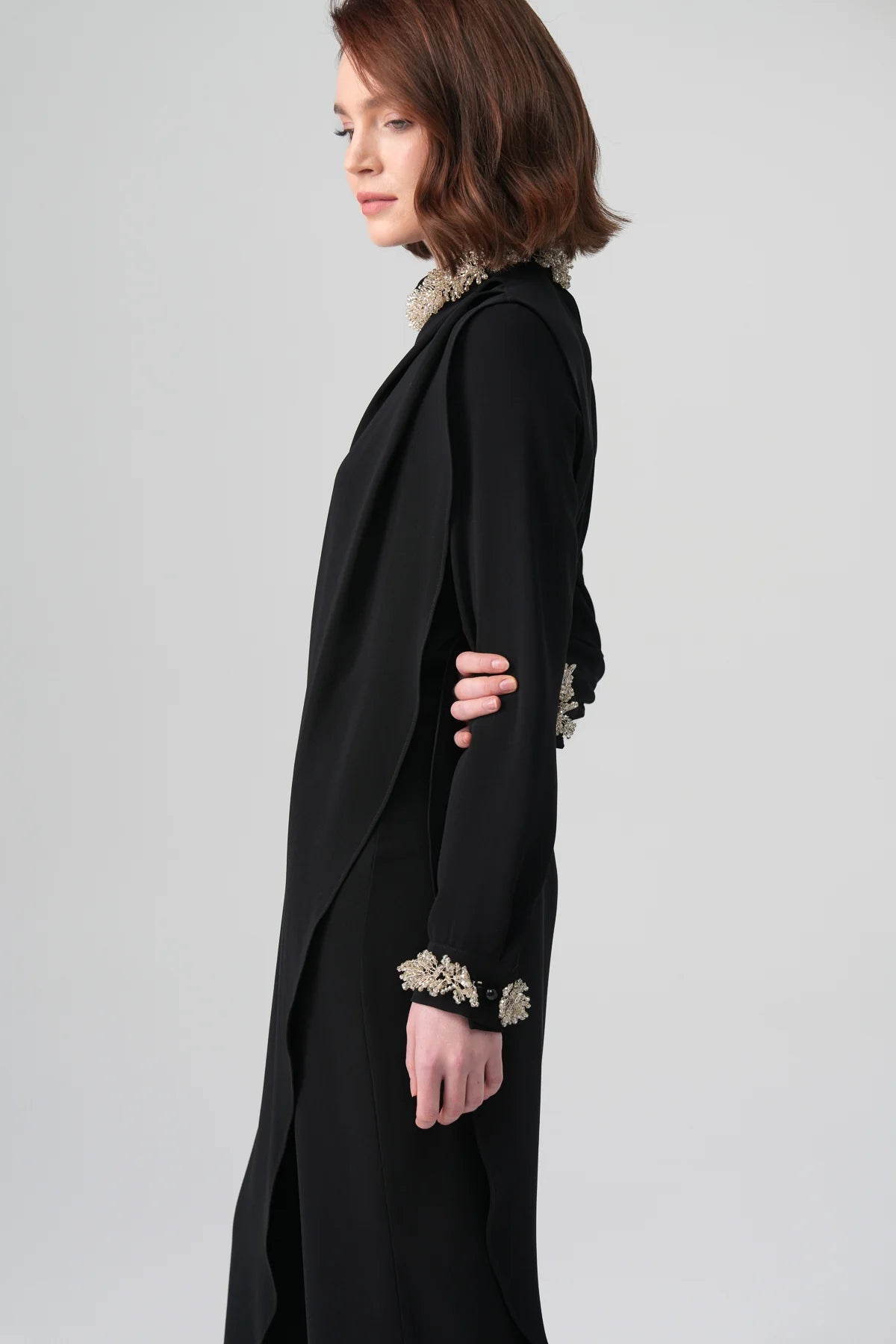 A refined interpretation of modern minimalism, this design combines clean structure with subtle statement detailing. The fluid, elongated silhouette is enhanced by a softly draped front panel, while the embellished neckline and cuffs introduce a delicate contrast. Balanced and understated, it transitions effortlessly from daywear to elevated evening styling.