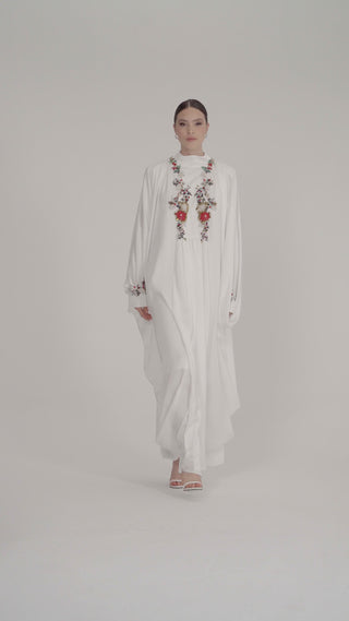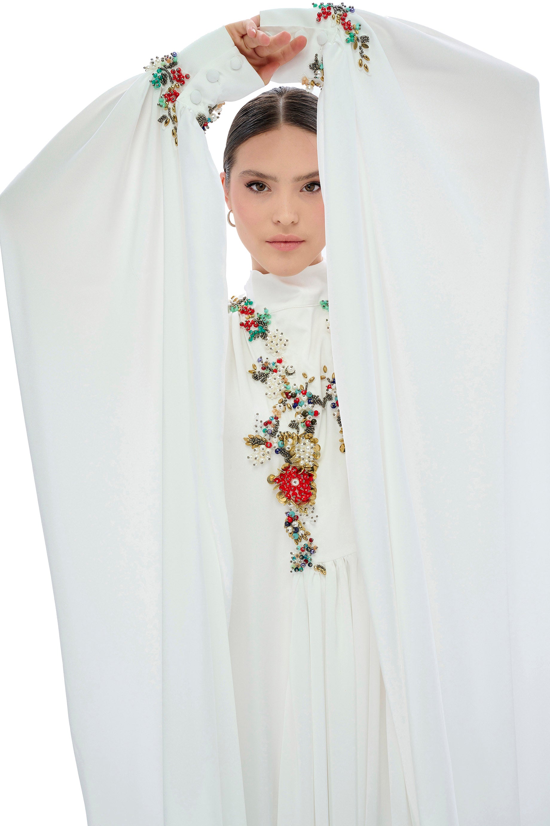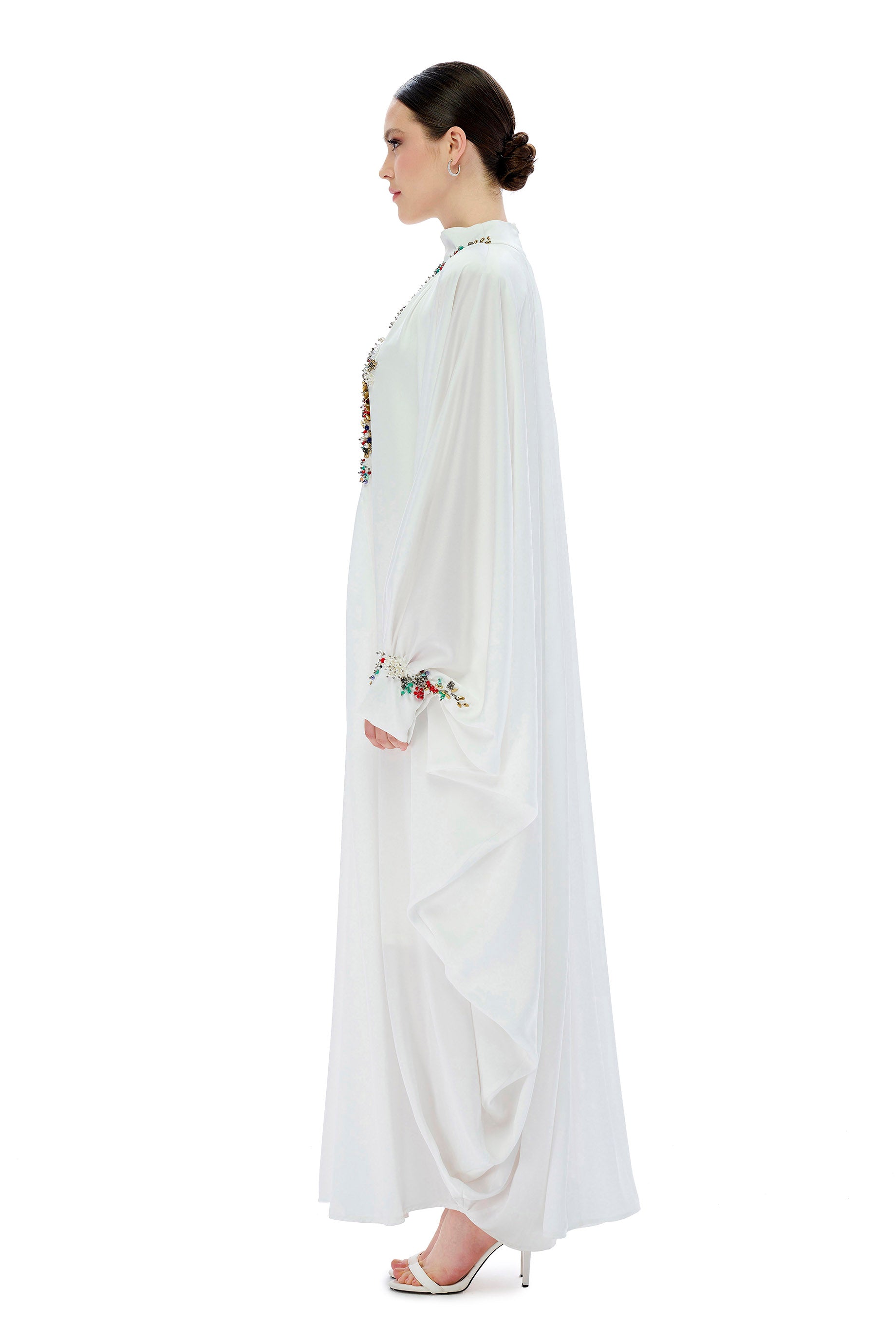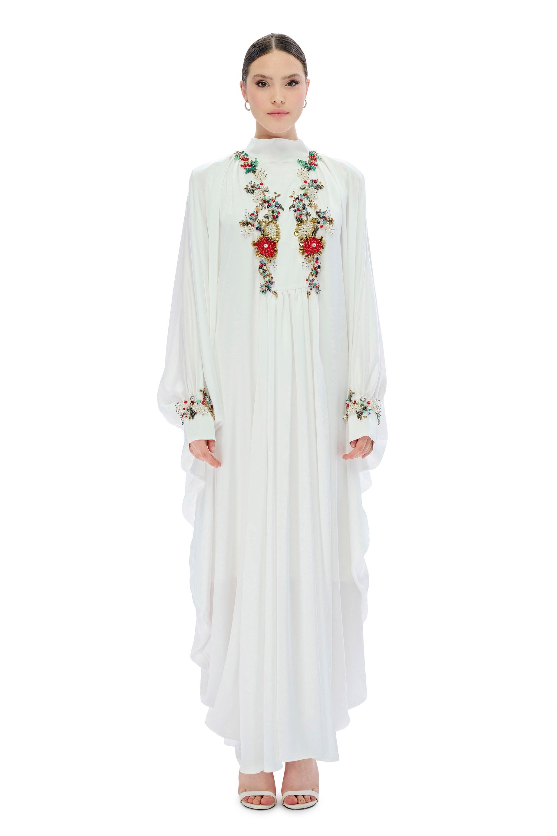 This statement kaftan-style maxi dress is defined by its flowing, architectural drape and richly hand-embellished bodice. Intricate beadwork decorates the front panel and cuffs, while gathered detailing from the yoke enhances movement and volume. The structured high neckline and elongated silhouette create a refined formal piece suited for elevated occasions.