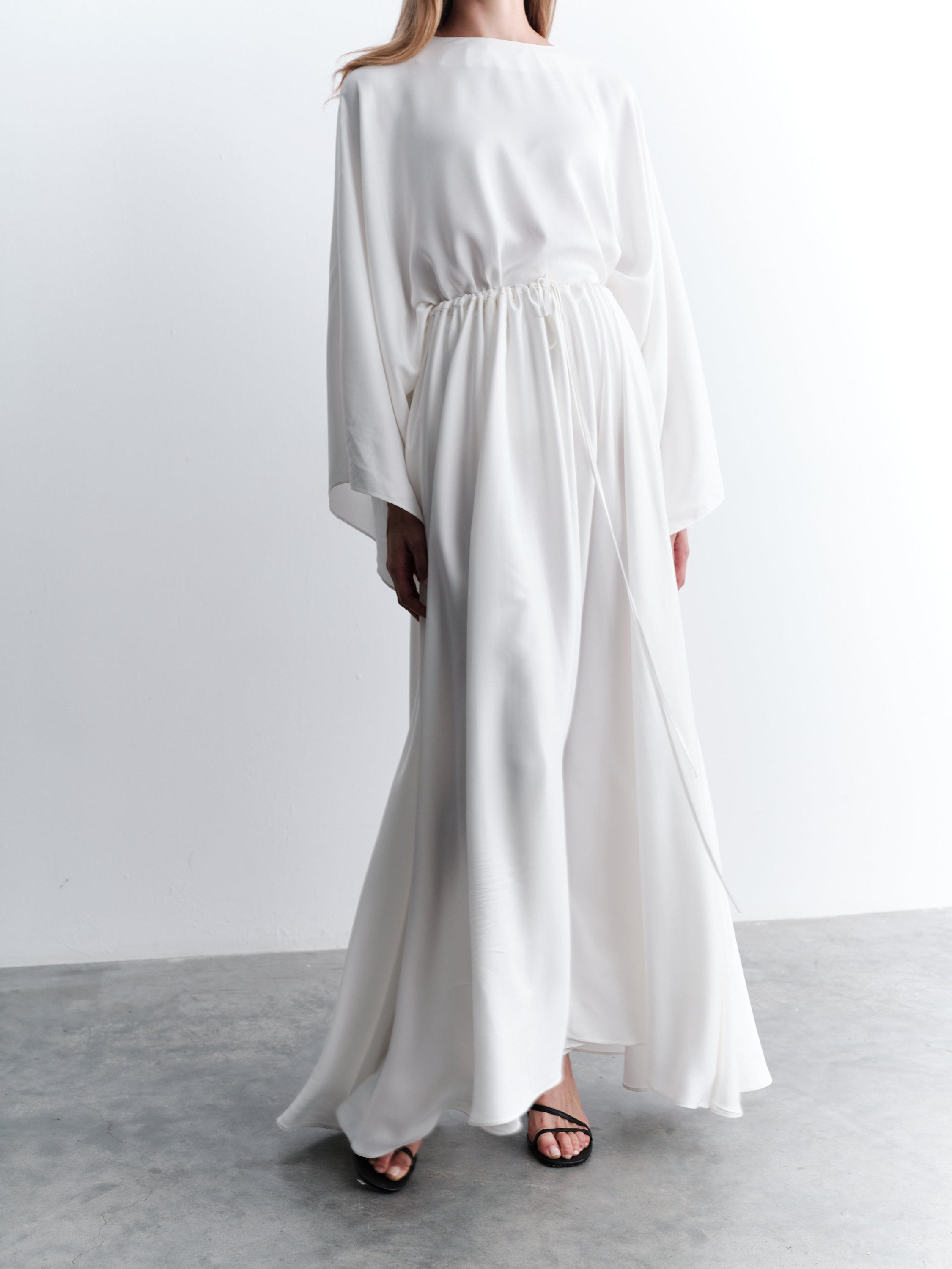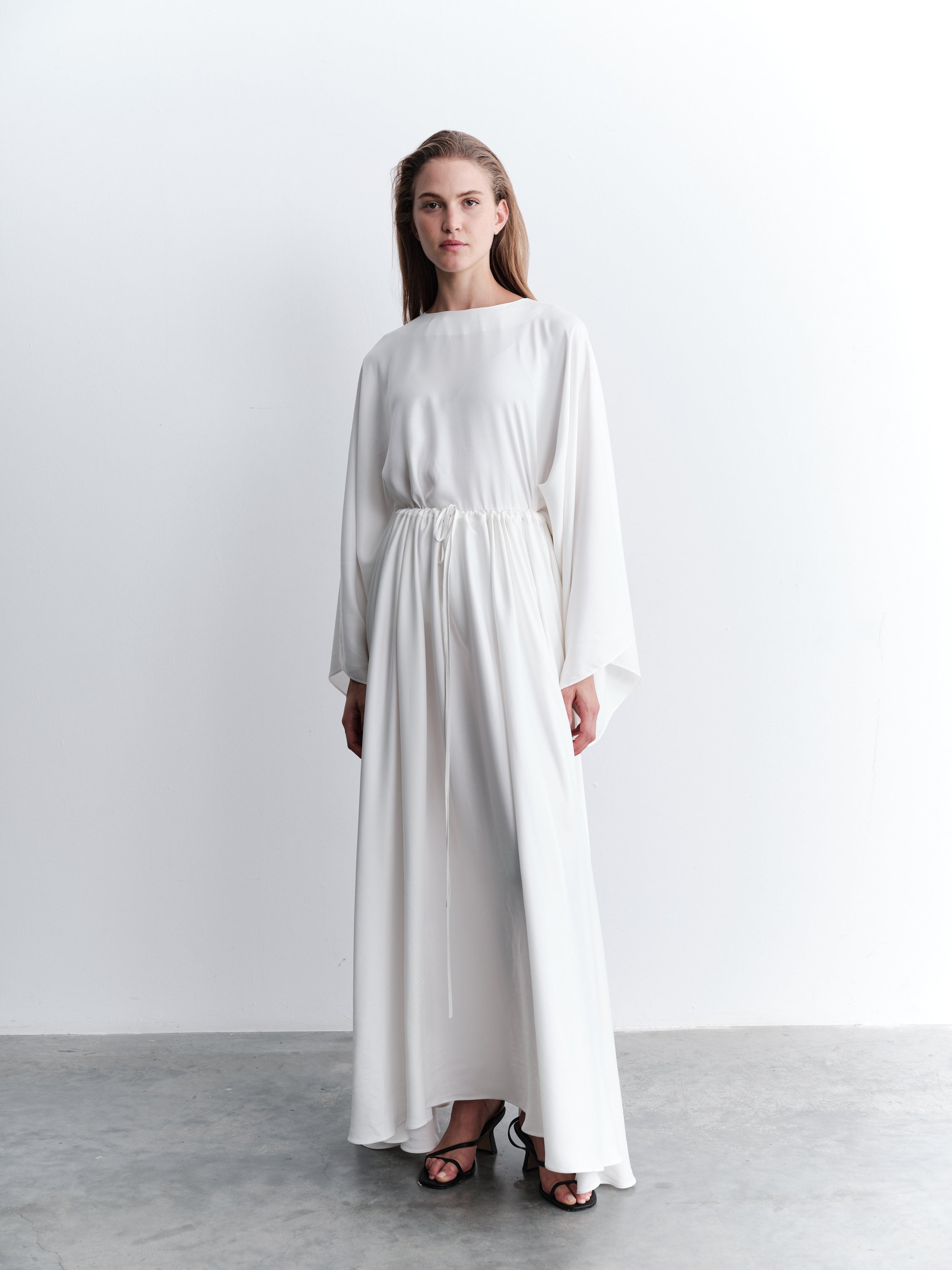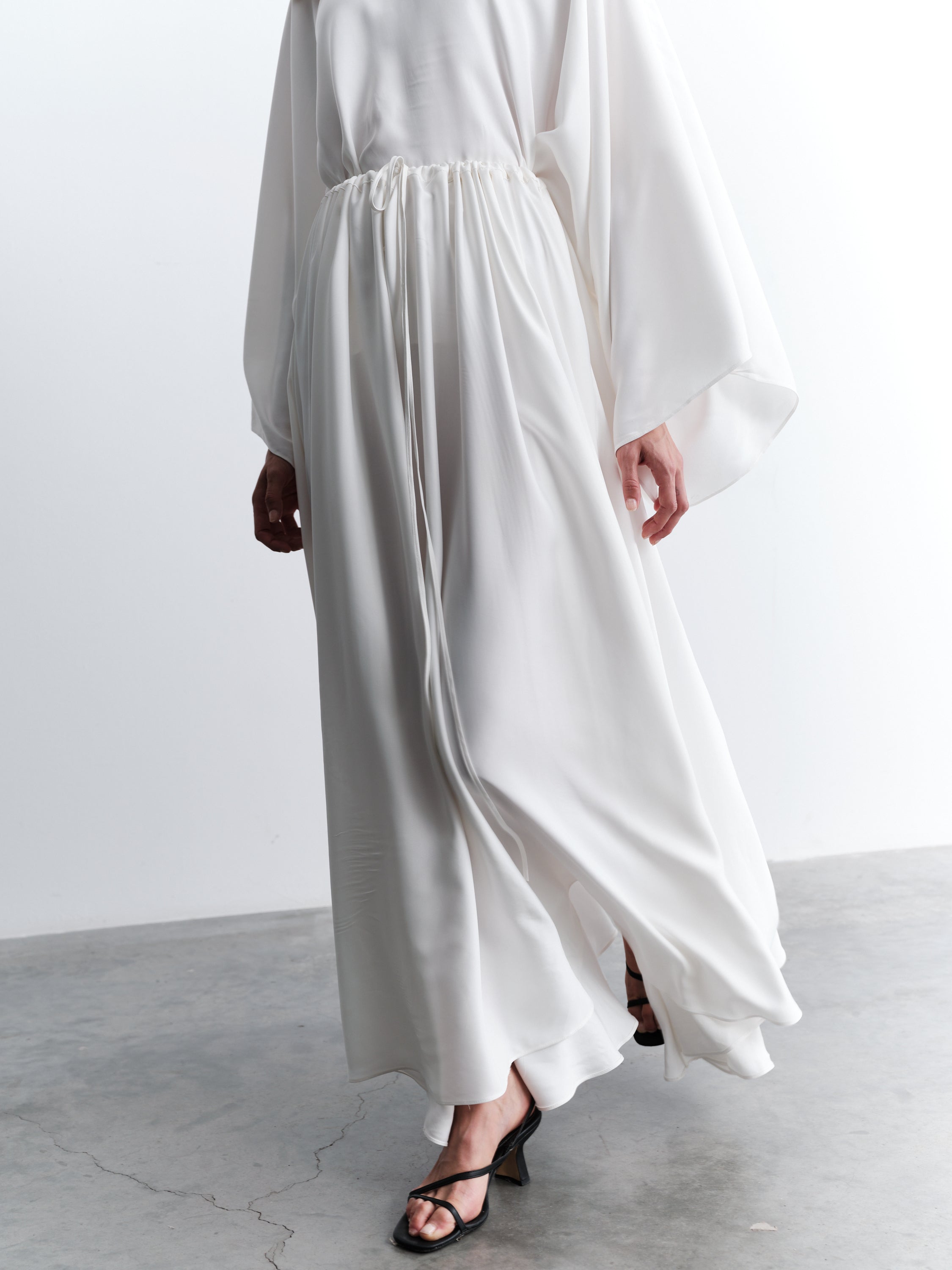Elegant two-piece satin skirt set crafted for timeless sophistication and graceful flow. The long skirt features an adjustable drawstring waist and practical side pockets, while the matching blouse offers a relaxed silhouette with wide sleeves and a clean button fastening at the back. Made from lightweight satin, this unlined design is opaque and provides effortless drape for day-to-evening styling.