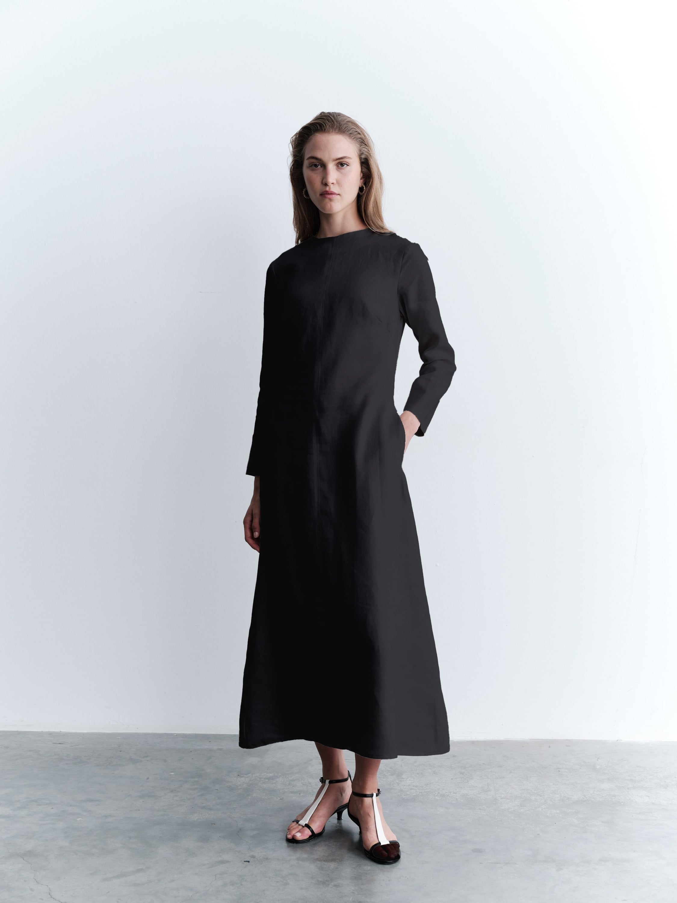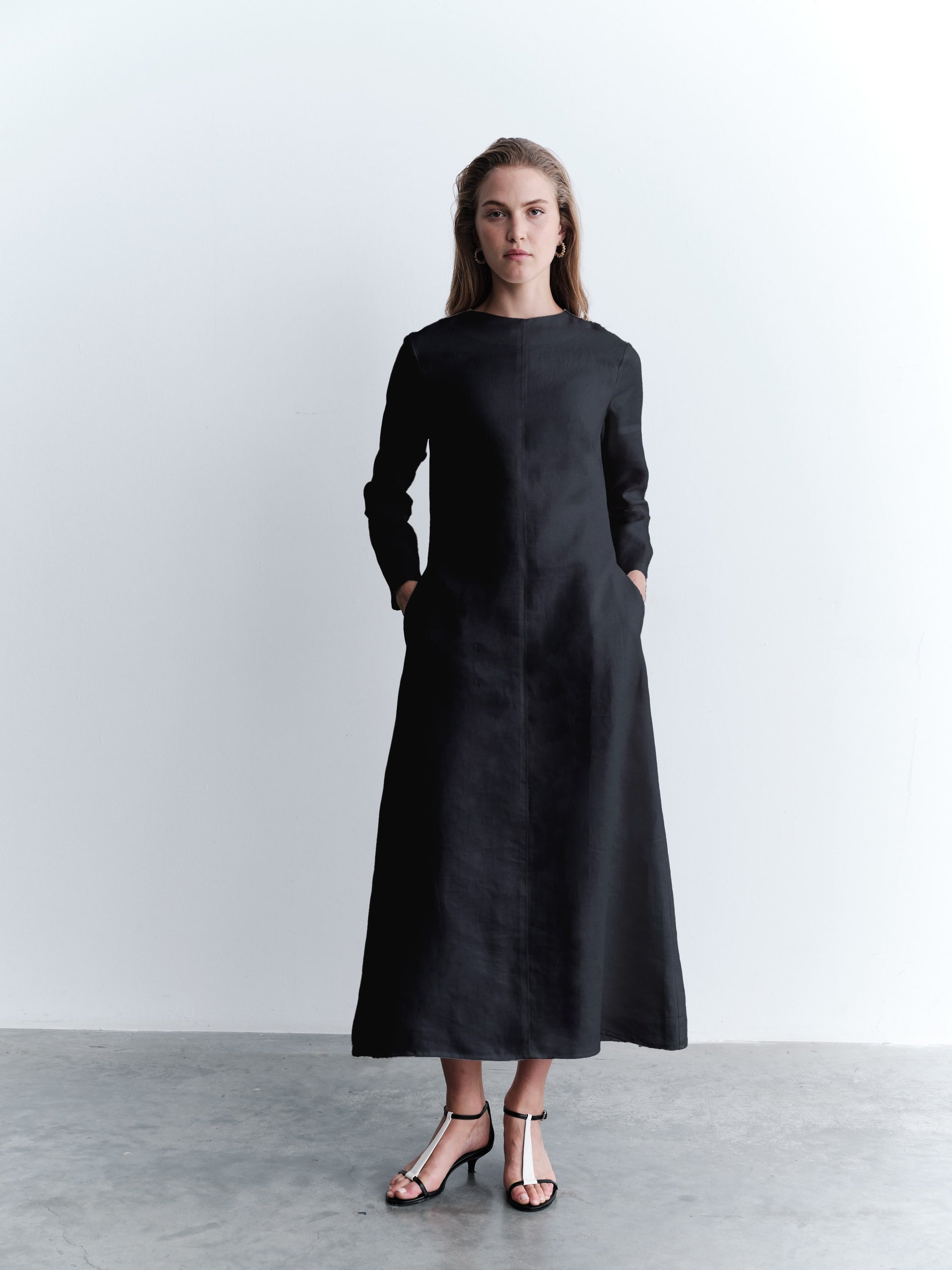 This minimalist maxi dress is defined by its clean lines, structured silhouette, and uninterrupted front-seam detail. The design features a smooth round neckline, long set-in sleeves, and discreet side pockets, offering both comfort and functionality. Fully lined and finished with a concealed back zipper, it delivers an elevated, refined look suitable for effortless everyday elegance.