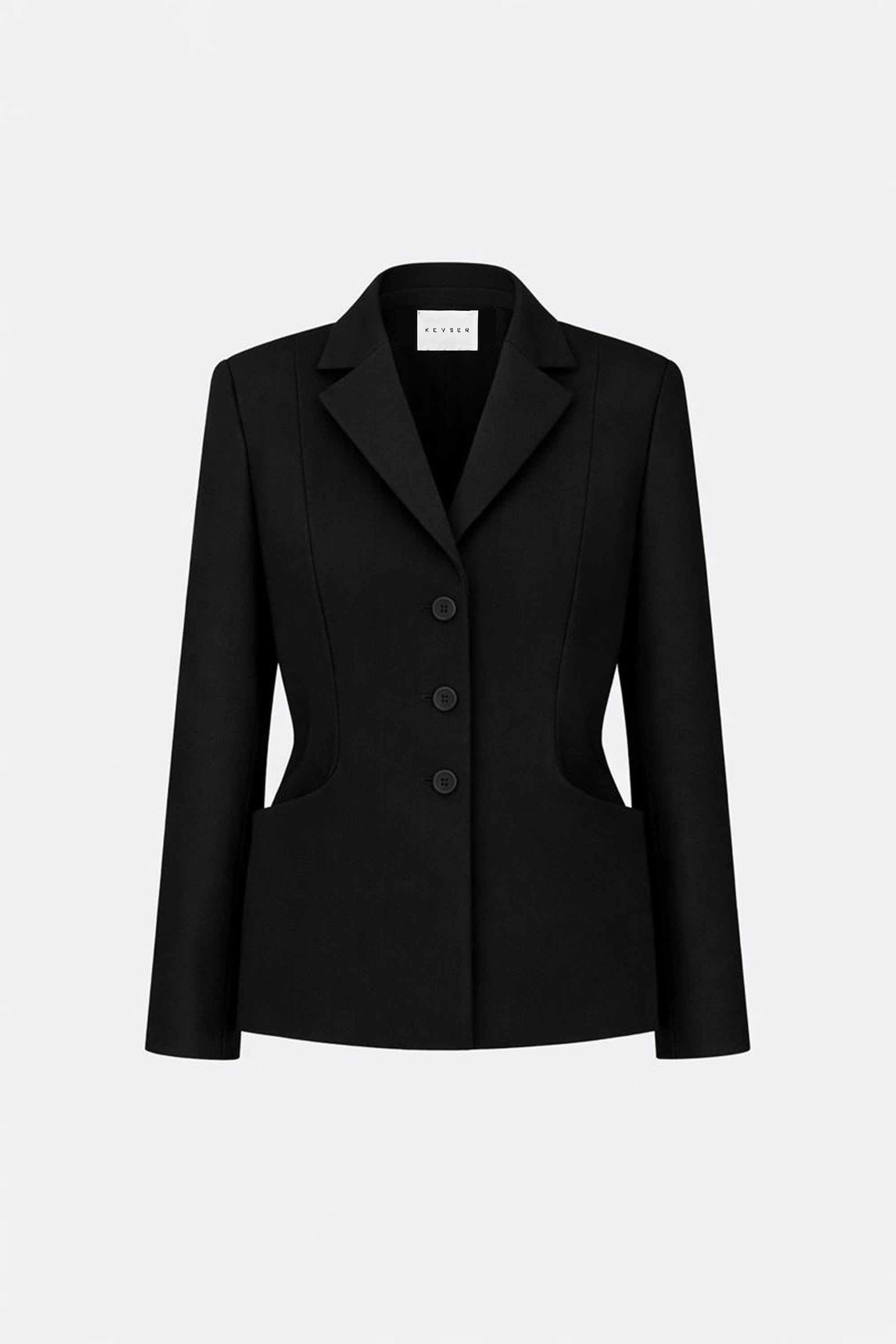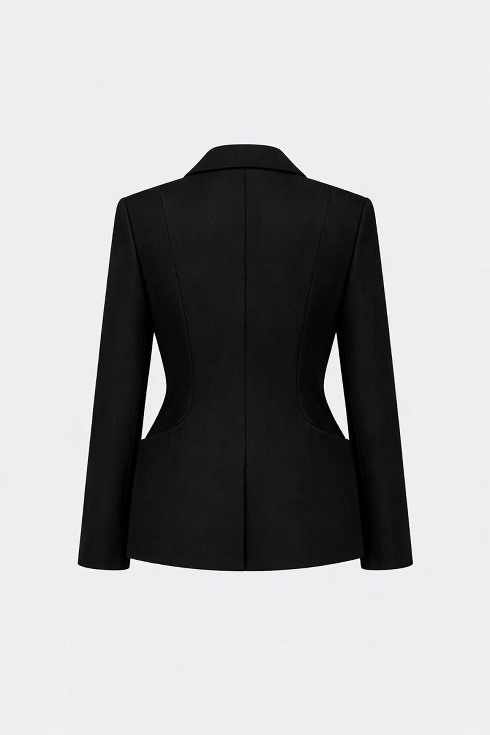 This fitted blazer is sculpted to accentuate the waist with a refined, contoured silhouette. Designed with a classic collar, single-breasted button closure, and subtle hip-enhancing seam detailing, it is fully lined and softly structured with padded shoulders for a sharp, confident profile. A polished essential suited for elevated everyday and formal styling.