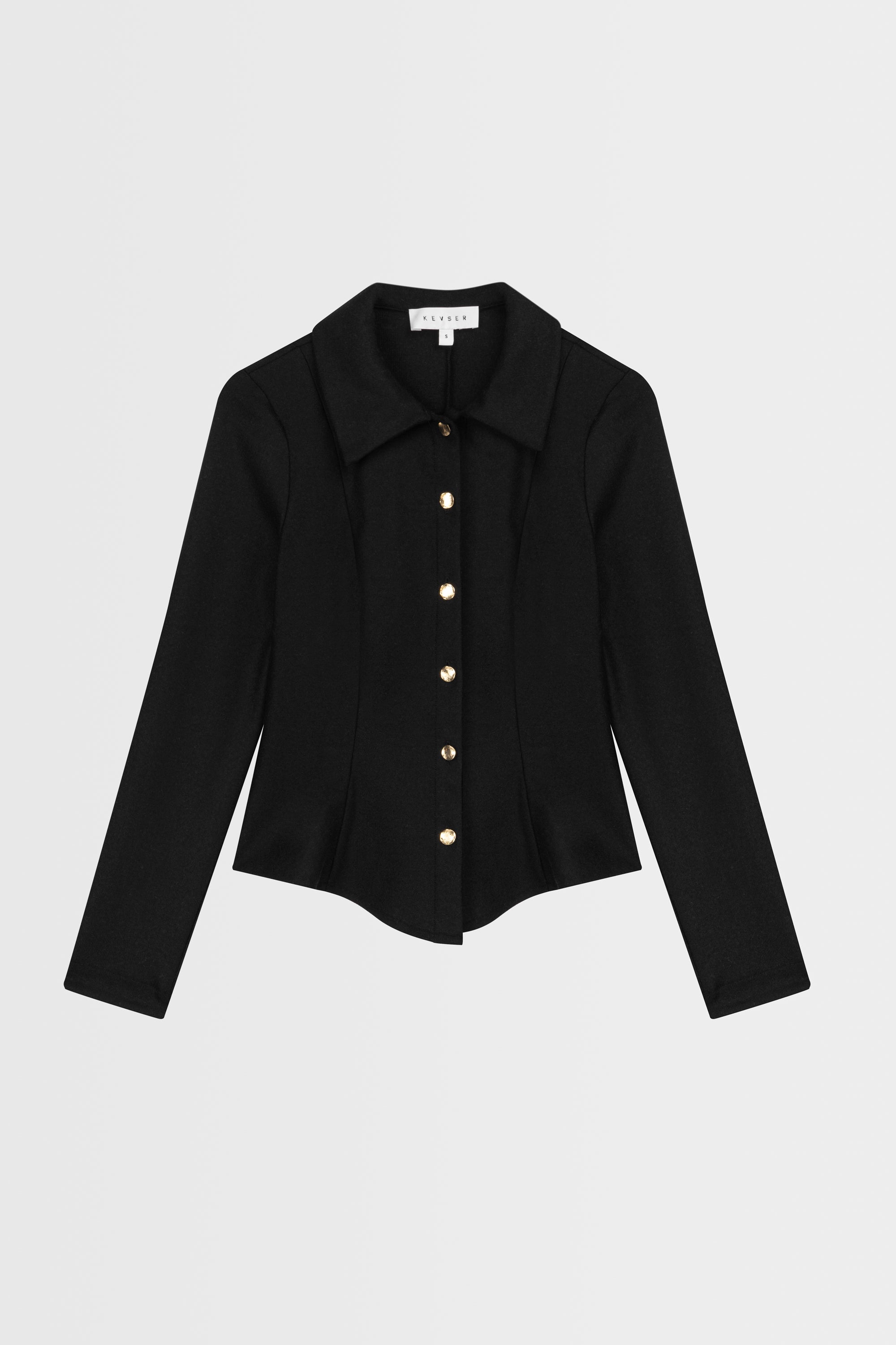 This refined wool-knit top combines a sculpted silhouette with understated sophistication. Designed with a structured fitted shape, long slim sleeves, and a sharp collar, it is elevated by a row of polished gold-tone buttons along the front. Its clean construction and compact wool texture make it an elegant staple for both tailored and casual looks.
