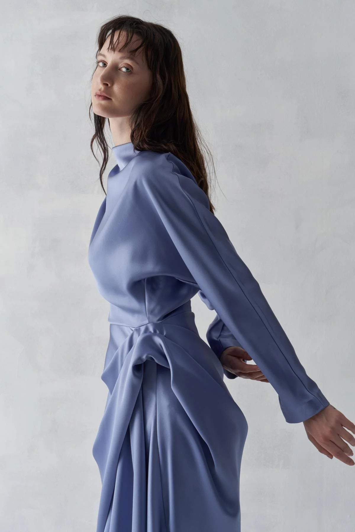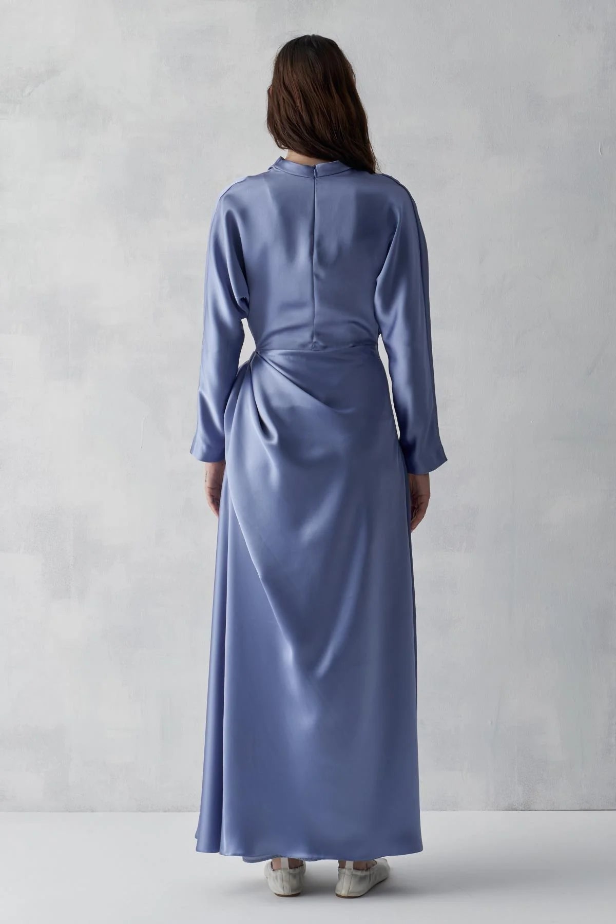 This refined satin evening dress combines architectural draping with a sleek, high-neck silhouette for an effortlessly elegant look. The asymmetric draped detailing cascades naturally from the bodice to the skirt, creating fluid movement and a sculptural, couture-like effect. Long sleeves offer full modest coverage, while the smooth satin fabric enhances the gown’s luxurious, luminous finish. Sophisticated, modern, and impeccably tailored, this piece is perfect for formal events, galas, and special occasions where understated glamour makes the strongest statement.