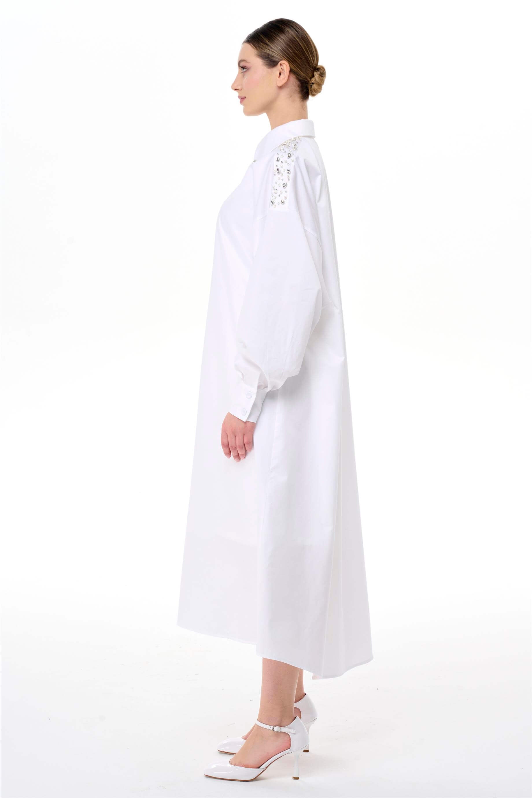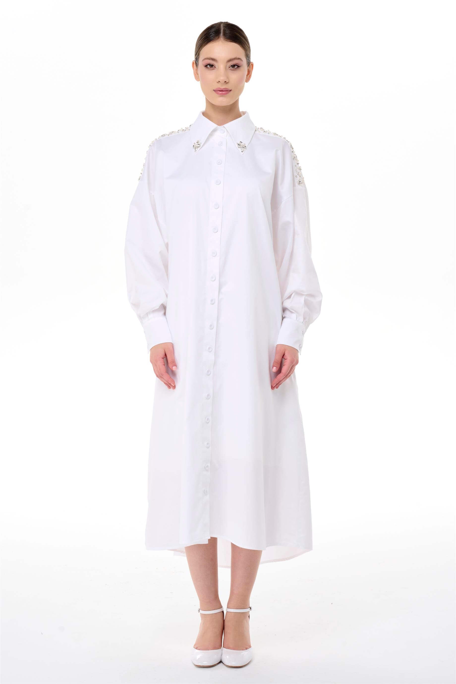 A refined shirt-style dress crafted from crisp cotton poplin, designed with a clean button-front silhouette and elegant collar structure. Decorative bead and crystal embellishments along the shoulders add a statement accent, while the relaxed raglan sleeves and fluid shape ensure comfortable movement. A polished yet versatile piece suited for both elevated daytime wear and refined occasions.