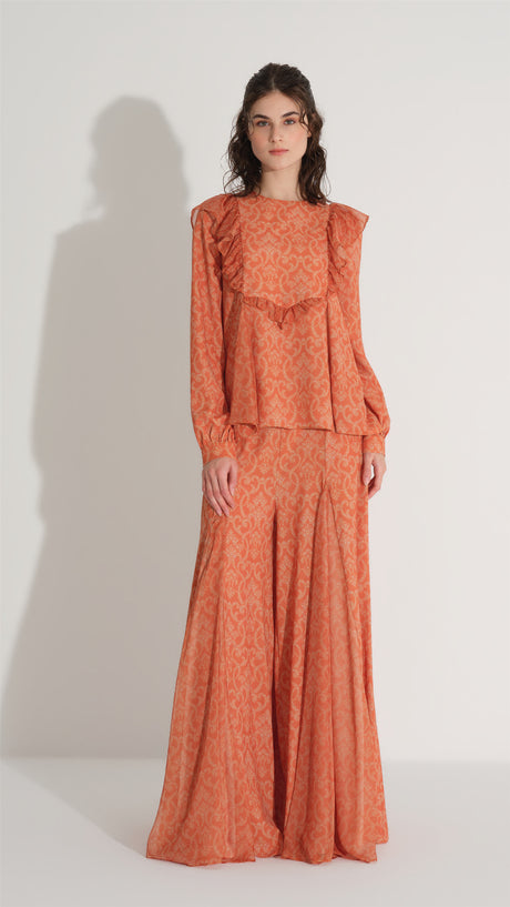 A statement two-piece set that blends fluid elegance with bold character. Designed with an all-over ethnic pattern, the set combines a lightweight blouse and wide-leg trousers for a balanced, elongated silhouette. Subtle ruffle chiffon details on both pieces introduce movement and softness, creating a refined contrast to the graphic print. Ideal for elevated daywear or contemporary evening styling.
