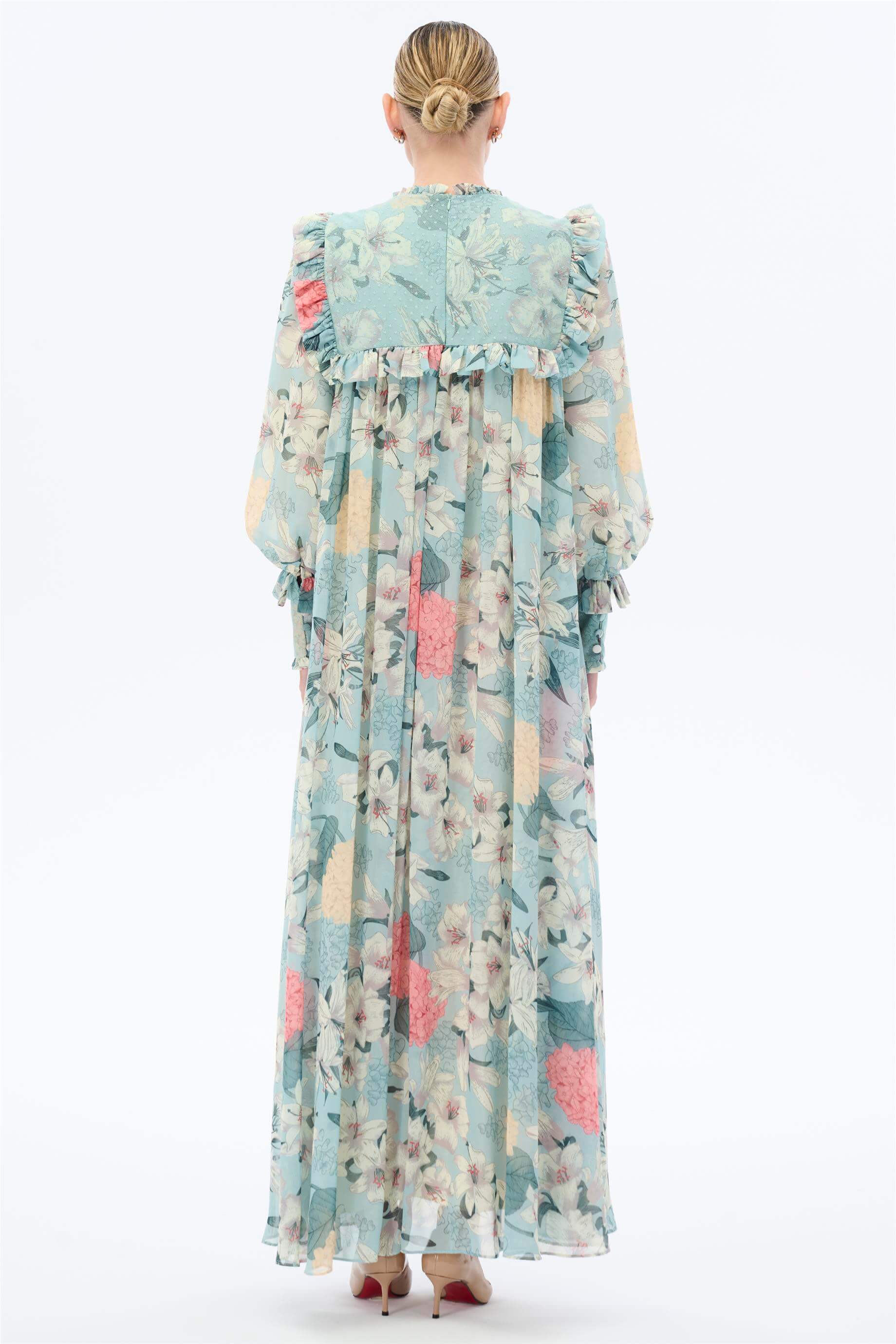A softly flowing maxi dress designed with a romantic floral composition and refined lace-textured yoke detailing. The gently gathered neckline, decorative yoke panel, and delicate ruffle trim create a feminine upper structure, while the loose silhouette falling from the yoke ensures airy movement and everyday comfort. Voluminous sleeves finished with layered cuffs enhance the graceful drape and balanced proportions.