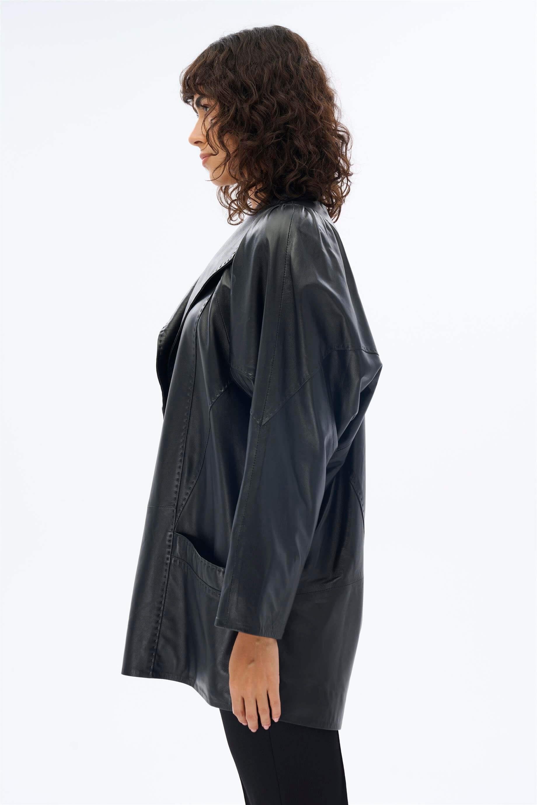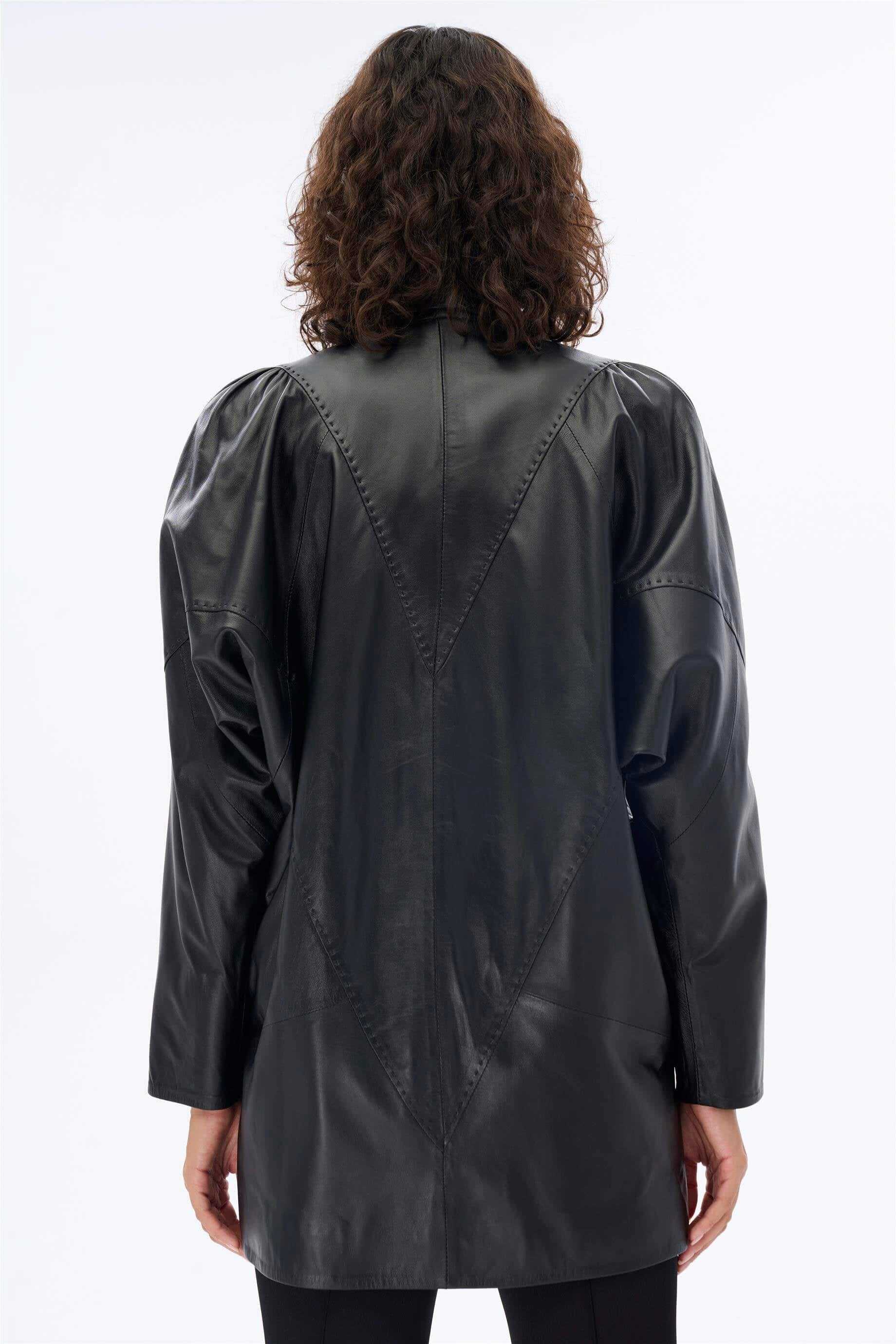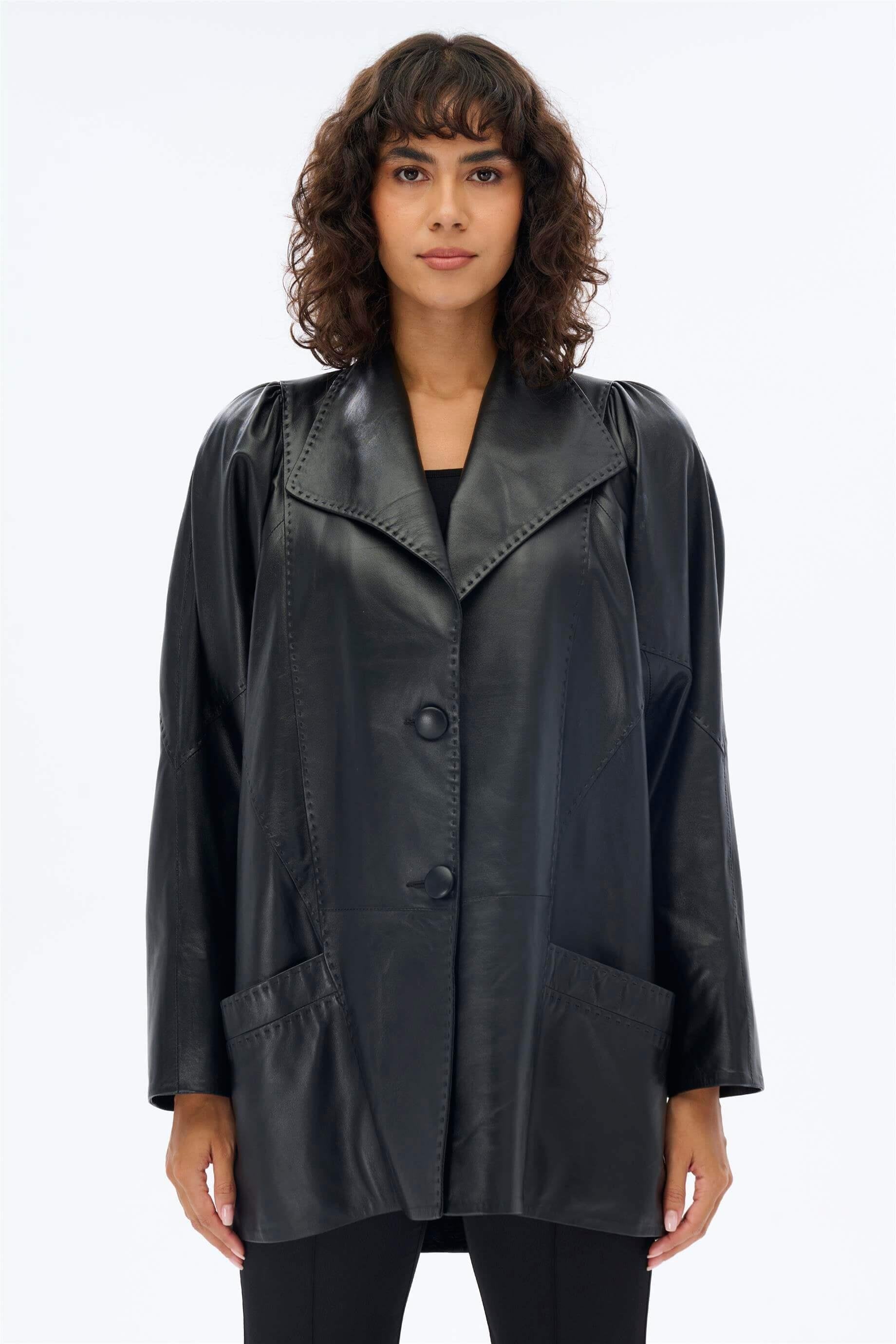 A statement oversized leather jacket designed with a structured yet relaxed silhouette for modern everyday styling. The design features a wide notched collar, front button closure, and softly dropped shoulders that enhance the loose architectural shape. Decorative panel construction and top-stitch detailing create subtle geometric lines across the body and sleeves, while large front patch pockets add both practicality and visual balance. A versatile outer layer suitable for transitional seasons, smart casual looks, and elevated daily wear.