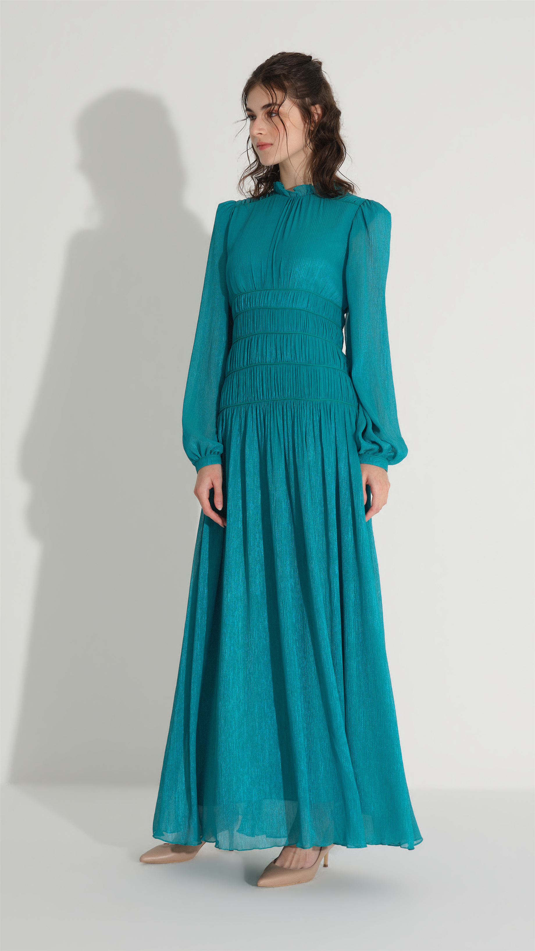 A refined interpretation of classic femininity with delicate structural detailing. The upper bodice is enhanced with lace panel accents, adding texture and visual depth, while the elasticated waist with a belt detail defines the silhouette without compromising comfort. The lightweight chiffon satin fabric creates fluid movement, complemented by the subtle diamond pattern that brings a sophisticated finish to the design.