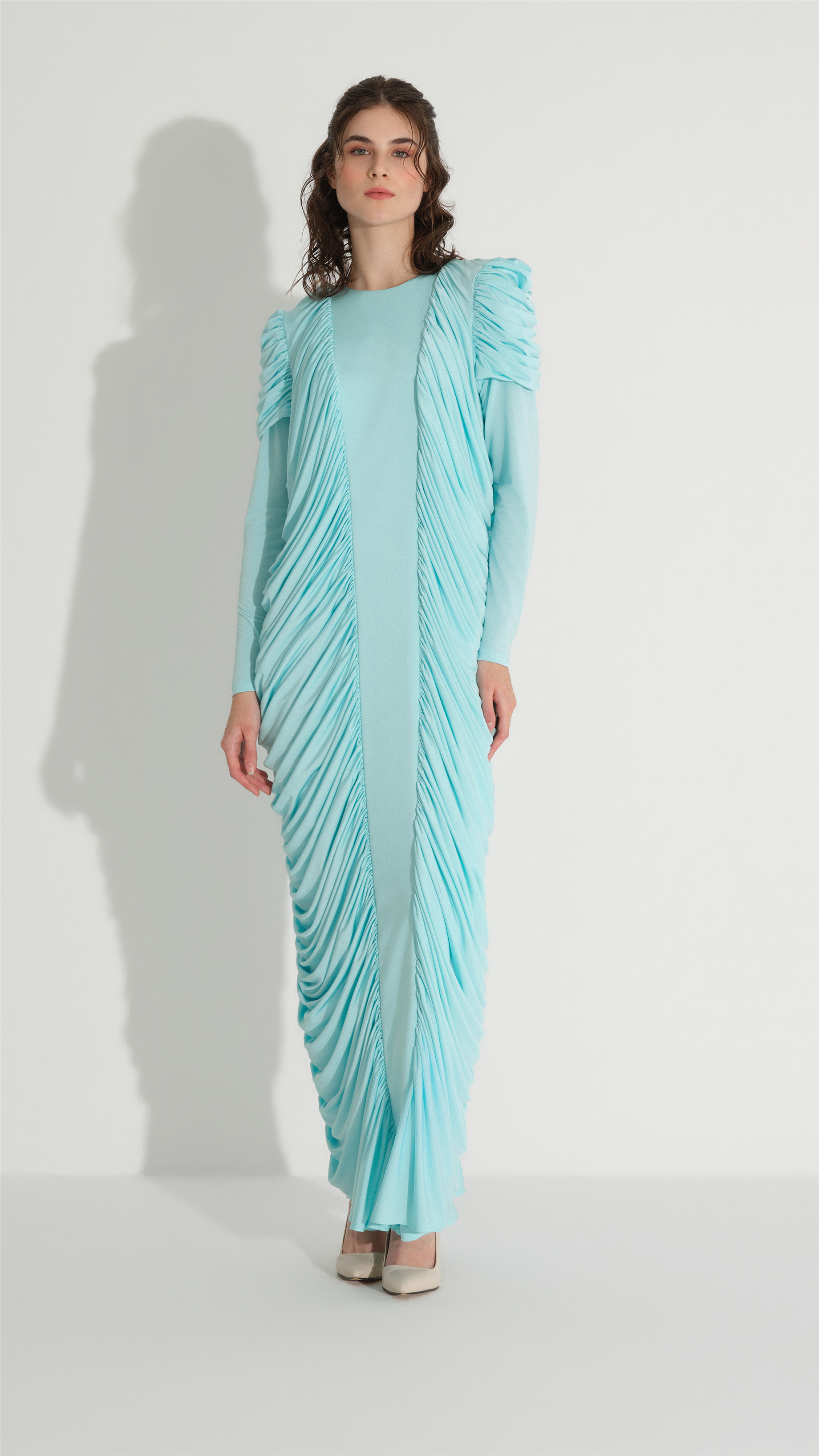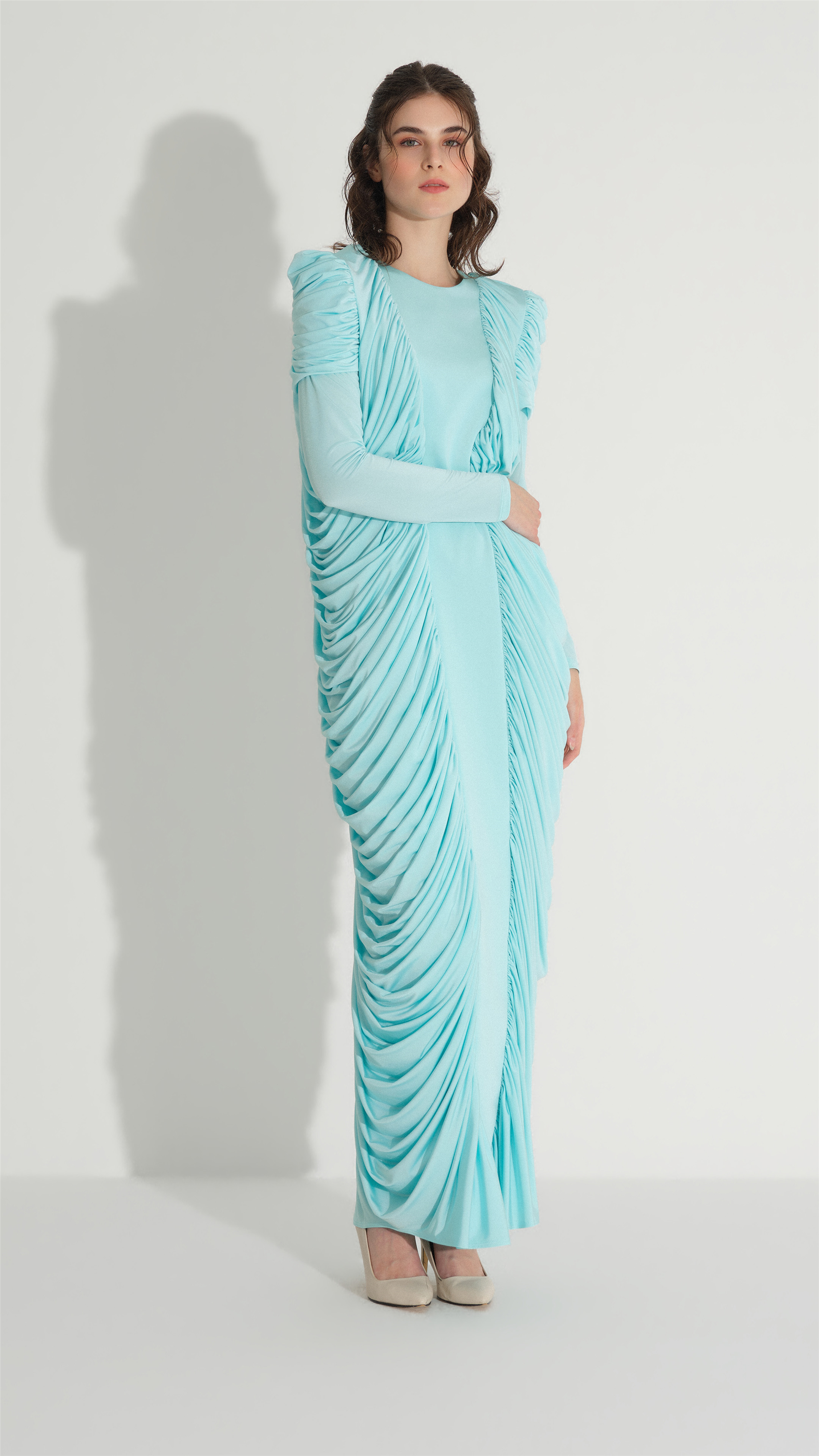 A contemporary silhouette shaped through fluid draping and clean construction. The design features a minimal neckline and pronounced side ruching that creates soft volume and a sculpted effect along the body. The fabric’s slight stretch enhances comfort while maintaining a smooth, elegant fall, making it a versatile option for both daywear and understated evening styling.