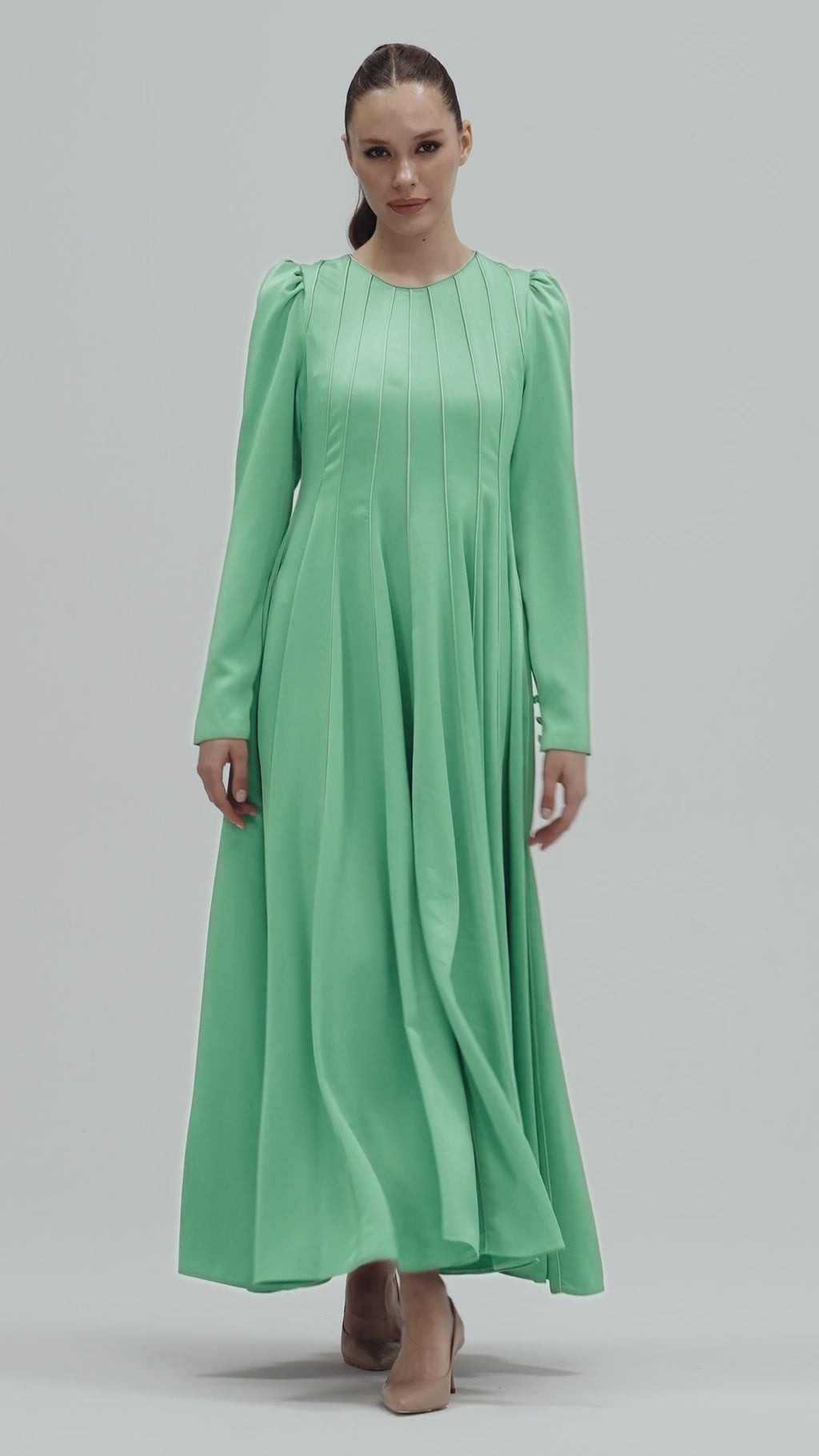 Fit: Semi-fitted bodice with vertical satin-piped panels, long straight sleeves, structured shoulders, and softly flared full-length skirt